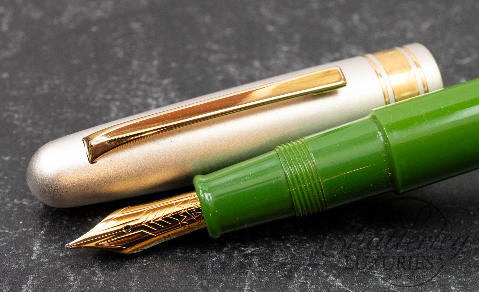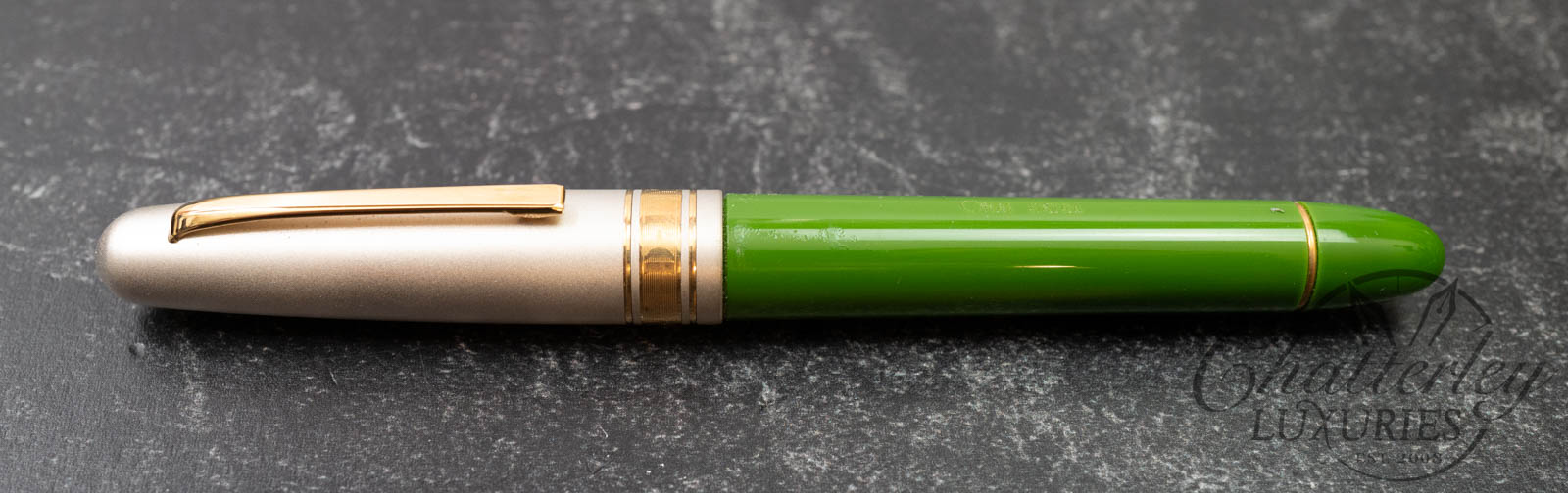 This pen is lovingly used and comes complete with original box and papers. It is equipped with an 18k Medium nib and fills via a Piston Filling System.