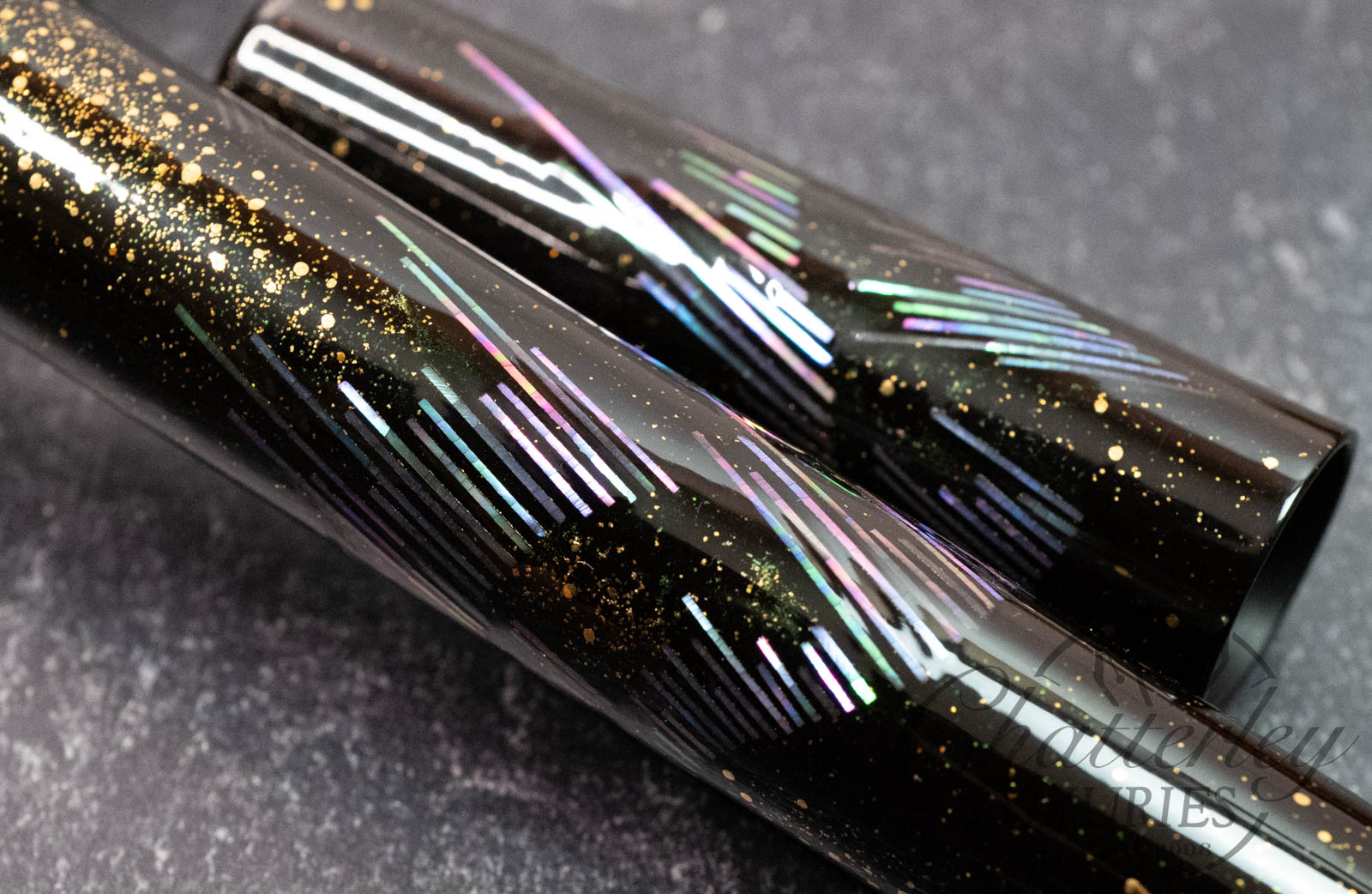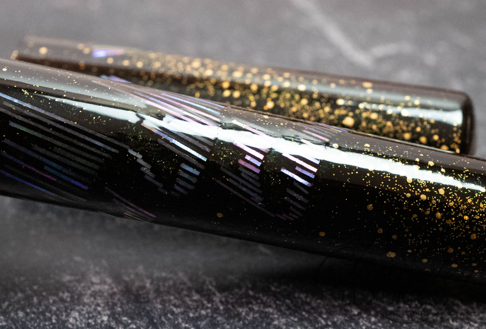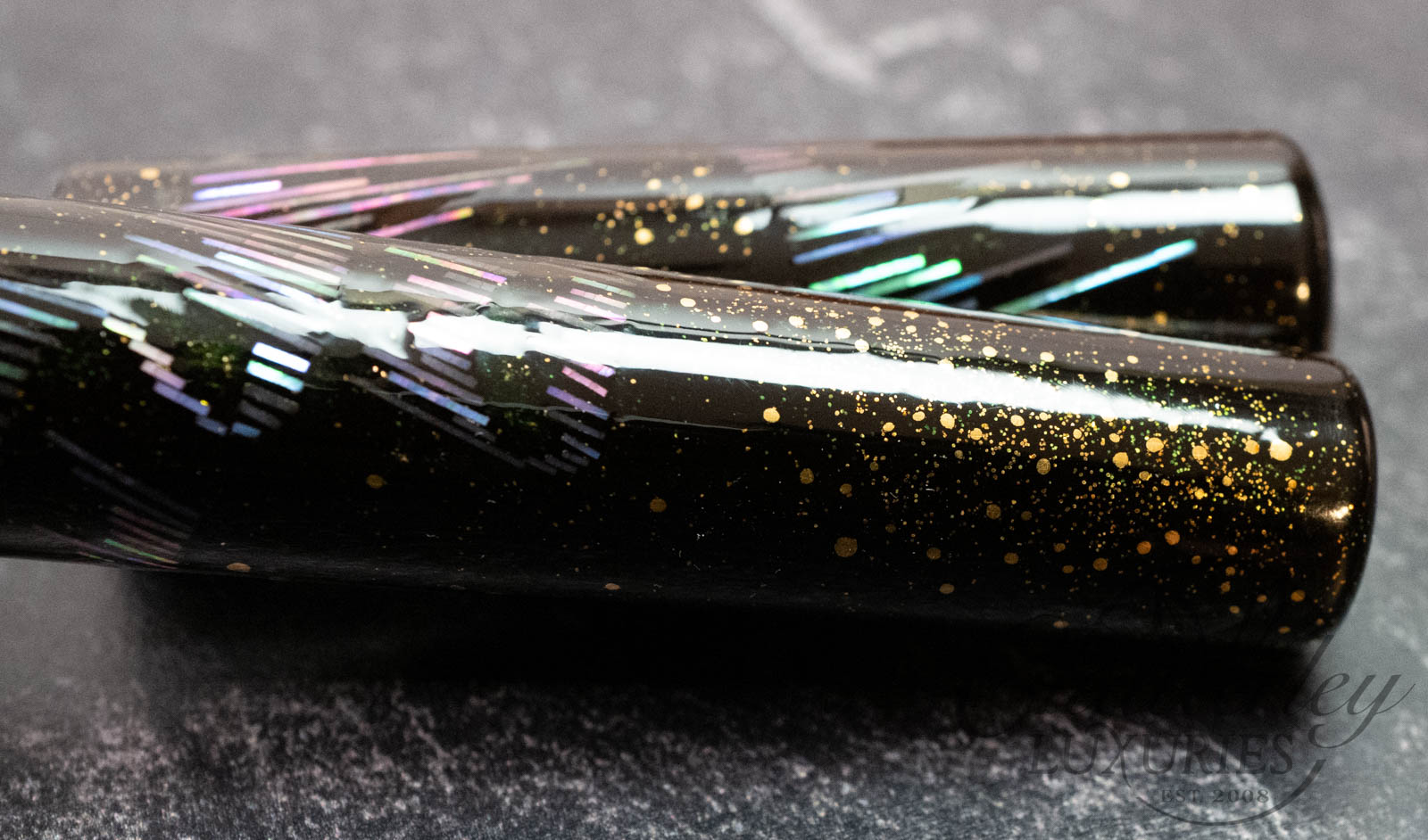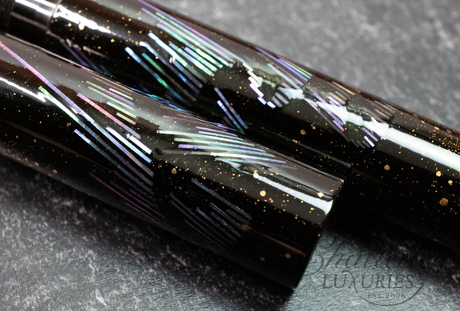 Each delicate fragment mirrors the radiant beauty of the lights as they ripple through the night sky. Gold accents trace the gentle arcs of their motion, evoking the warmth and brilliance of stars illuminating the celestial scene. As you hold the writing instrument, it is as though you have captured a fragment of the Northern Lights themselves—a piece of the sky, crafted to rest in your hand.