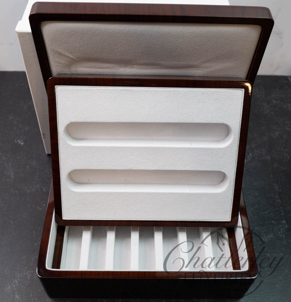 This pen is lovingly used and comes complete with the box and papers. It is equipped with an 18k Medium #8 nib and fills via a Compressor Filling System. The box also includes a removable seven pen tray in addition to the two pen tray that the pen sits in (see last image).