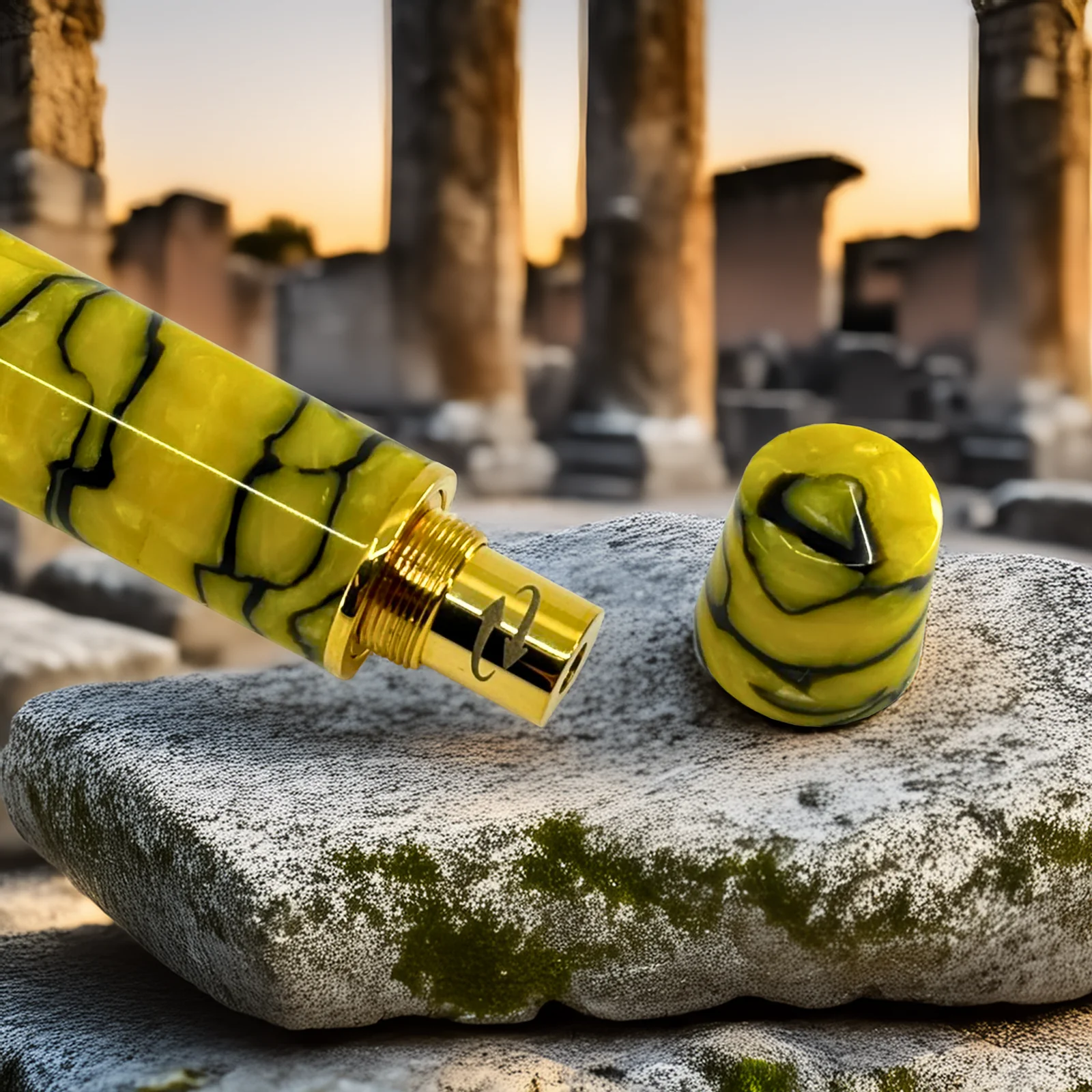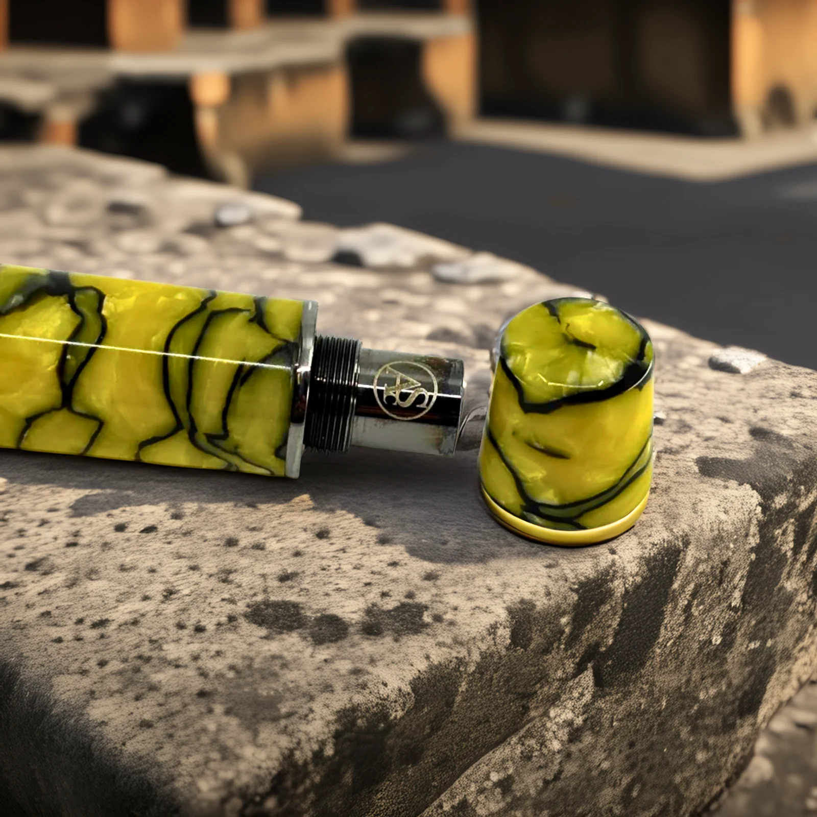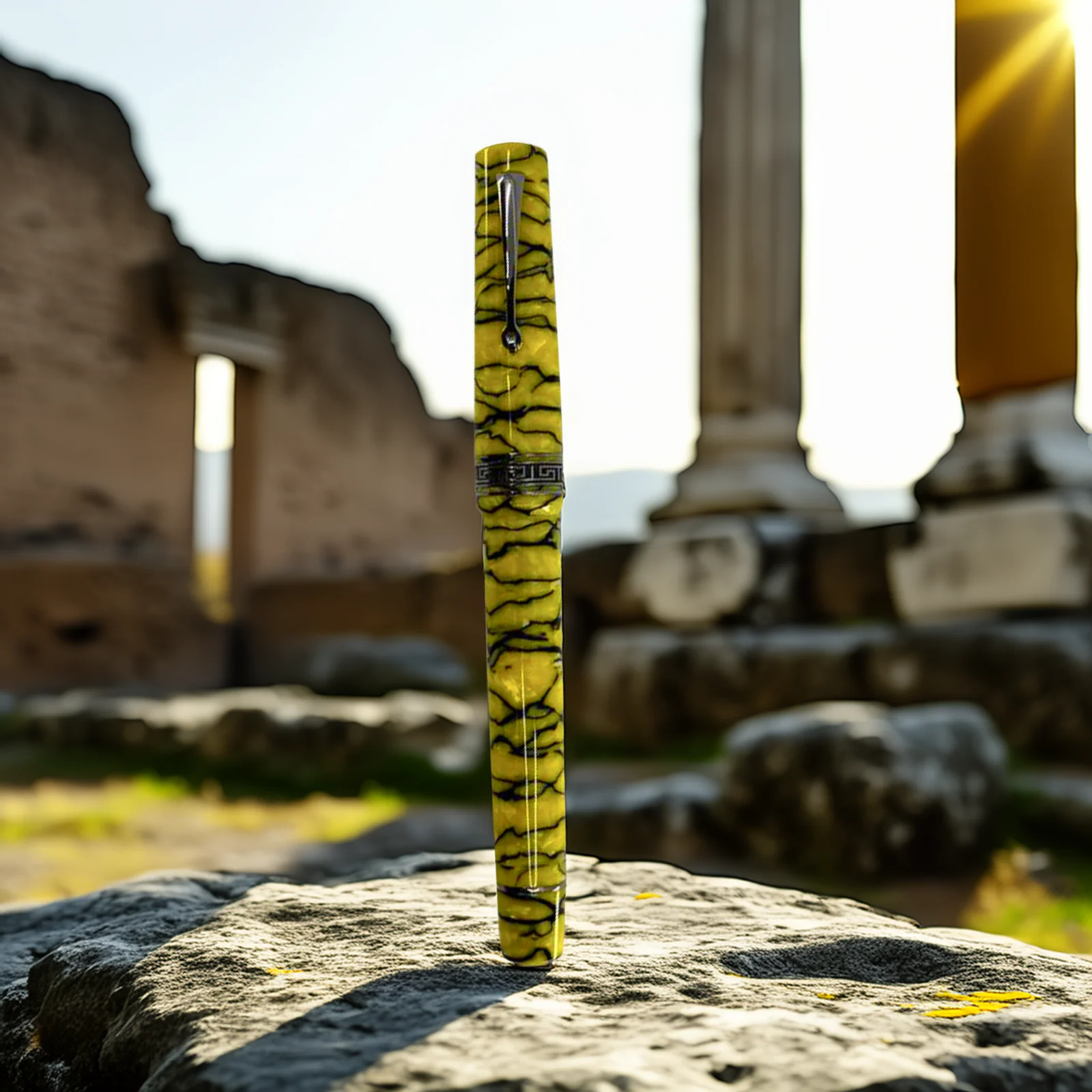Introducing the ASC Bologna Extra Pompeii II Bespoke 2025—a pen that feels as timeless as the ruins that inspired it. Crafted from a rare celluloid originally seen in Delta’s Rediscover Pompeii, its vivid yellow base streaked with bold black veining brings to mind volcanic stone touched by sunlight. The material is both historic and energetic, radiating a presence that’s impossible to ignore. Thanks to a small, rediscovered stock of this celluloid, ASC has brought it back for a limited run of JUST 50 PENS.