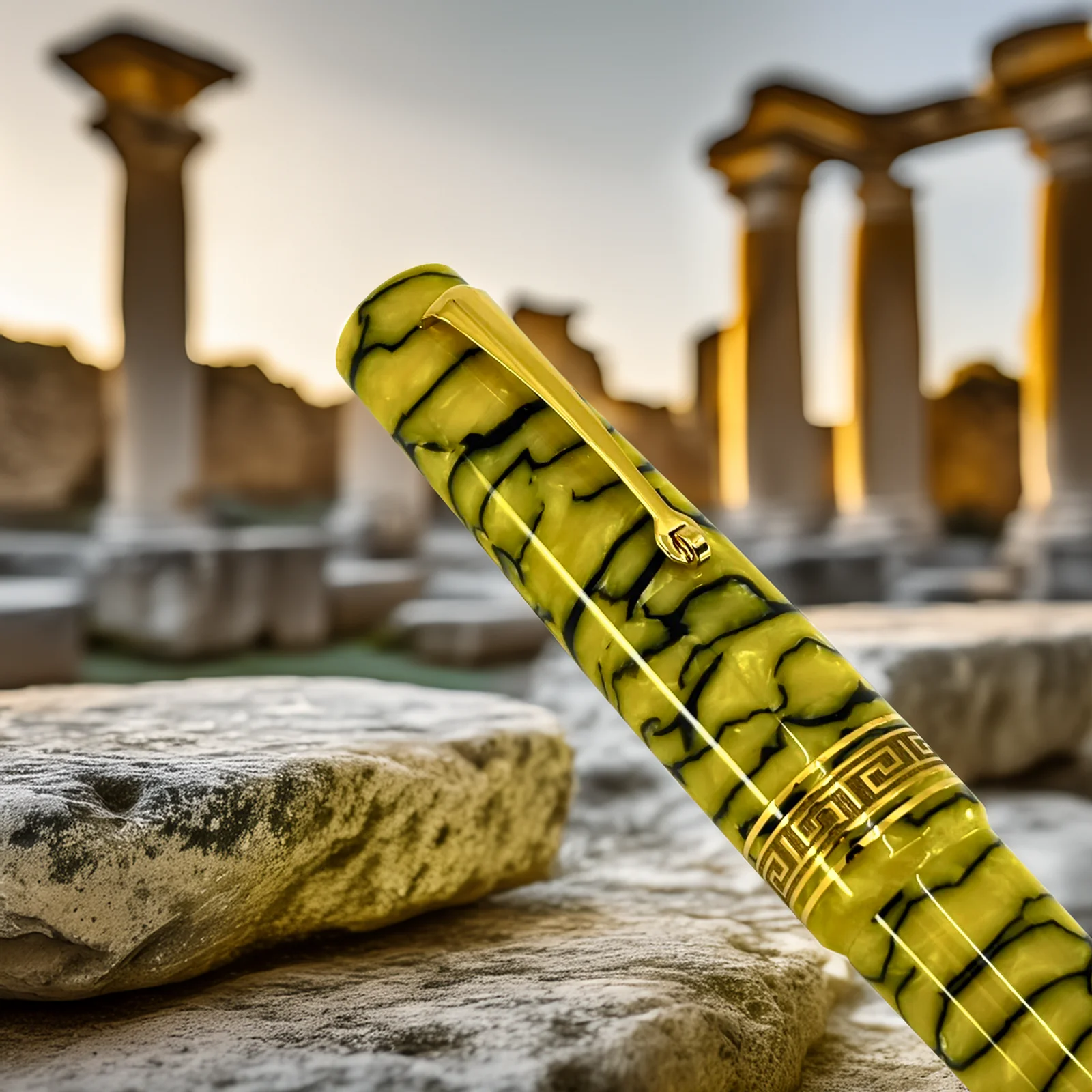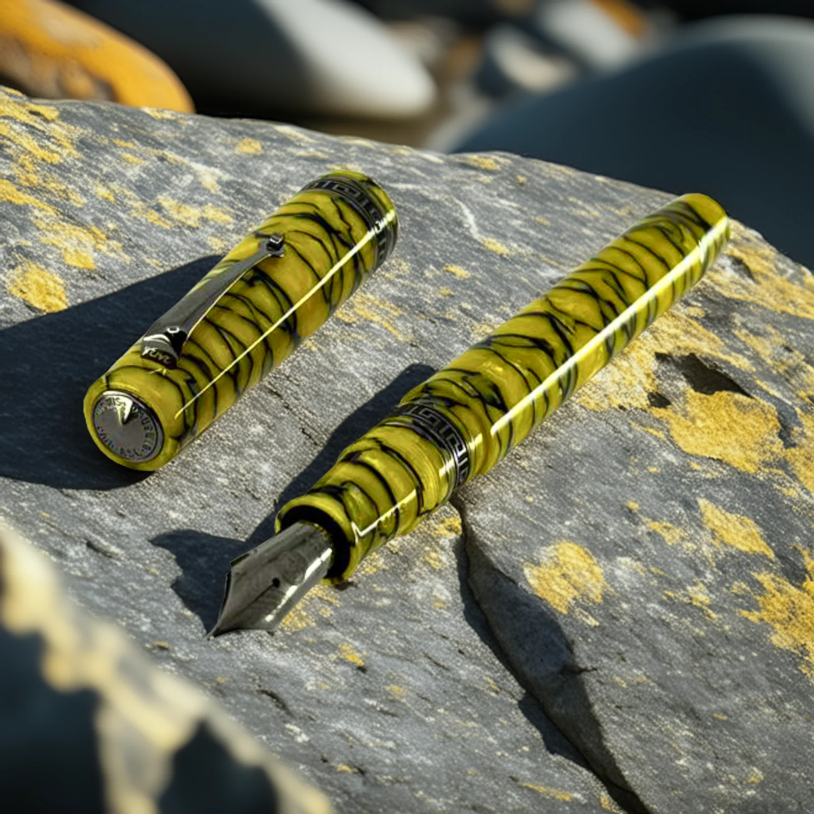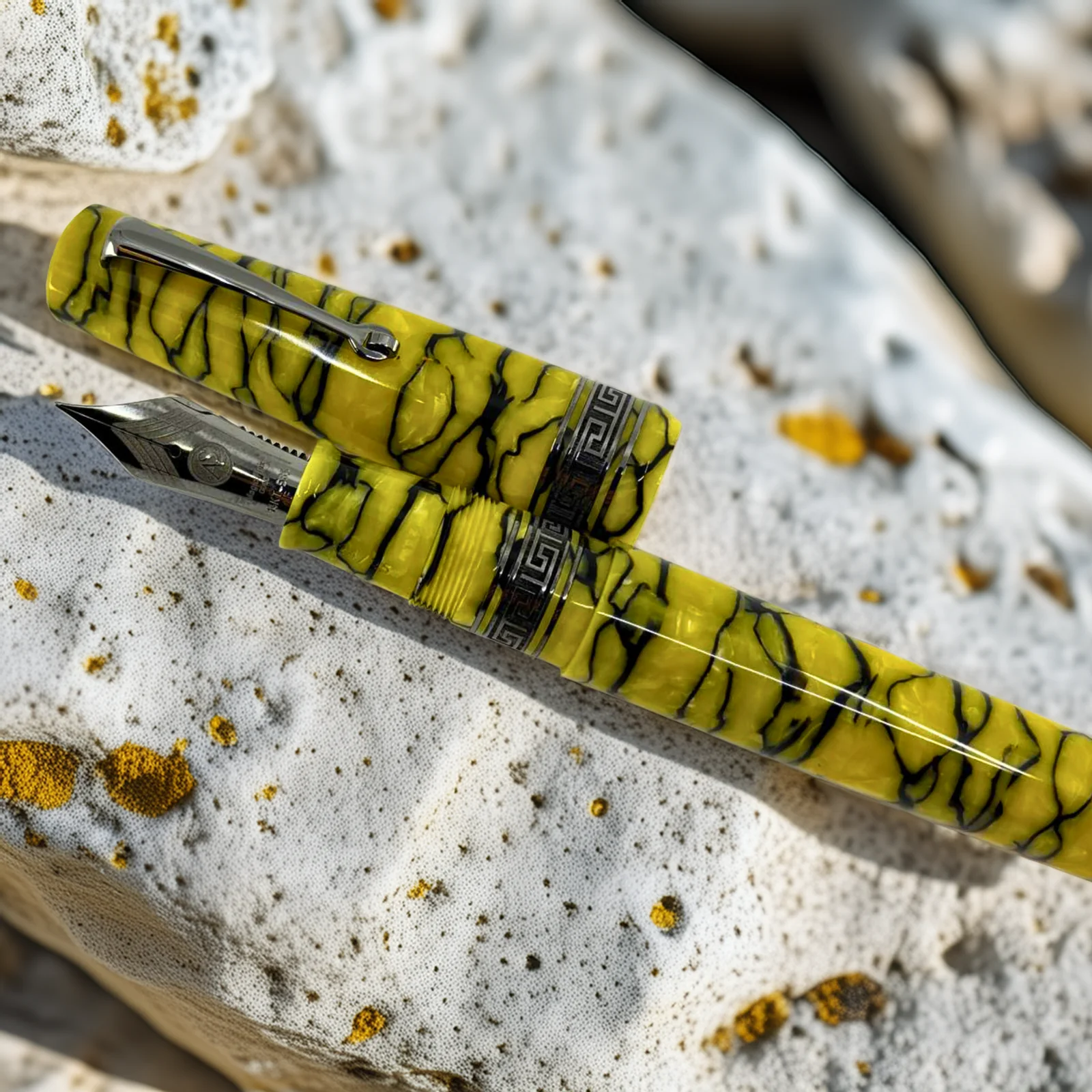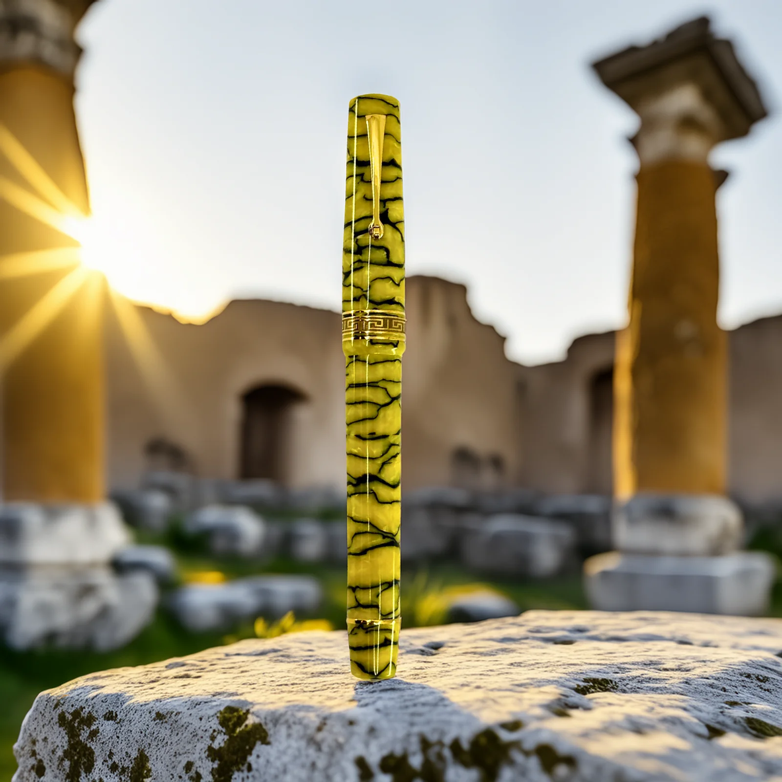 Introducing the ASC Bologna Extra Pompeii II Bespoke 2025—a pen that feels as timeless as the ruins that inspired it. Crafted from a rare celluloid originally seen in Delta’s Rediscover Pompeii, its vivid yellow base streaked with bold black veining brings to mind volcanic stone touched by sunlight. The material is both historic and energetic, radiating a presence that’s impossible to ignore. Thanks to a small, rediscovered stock of this celluloid, ASC has brought it back for a limited run of JUST 50 PENS.