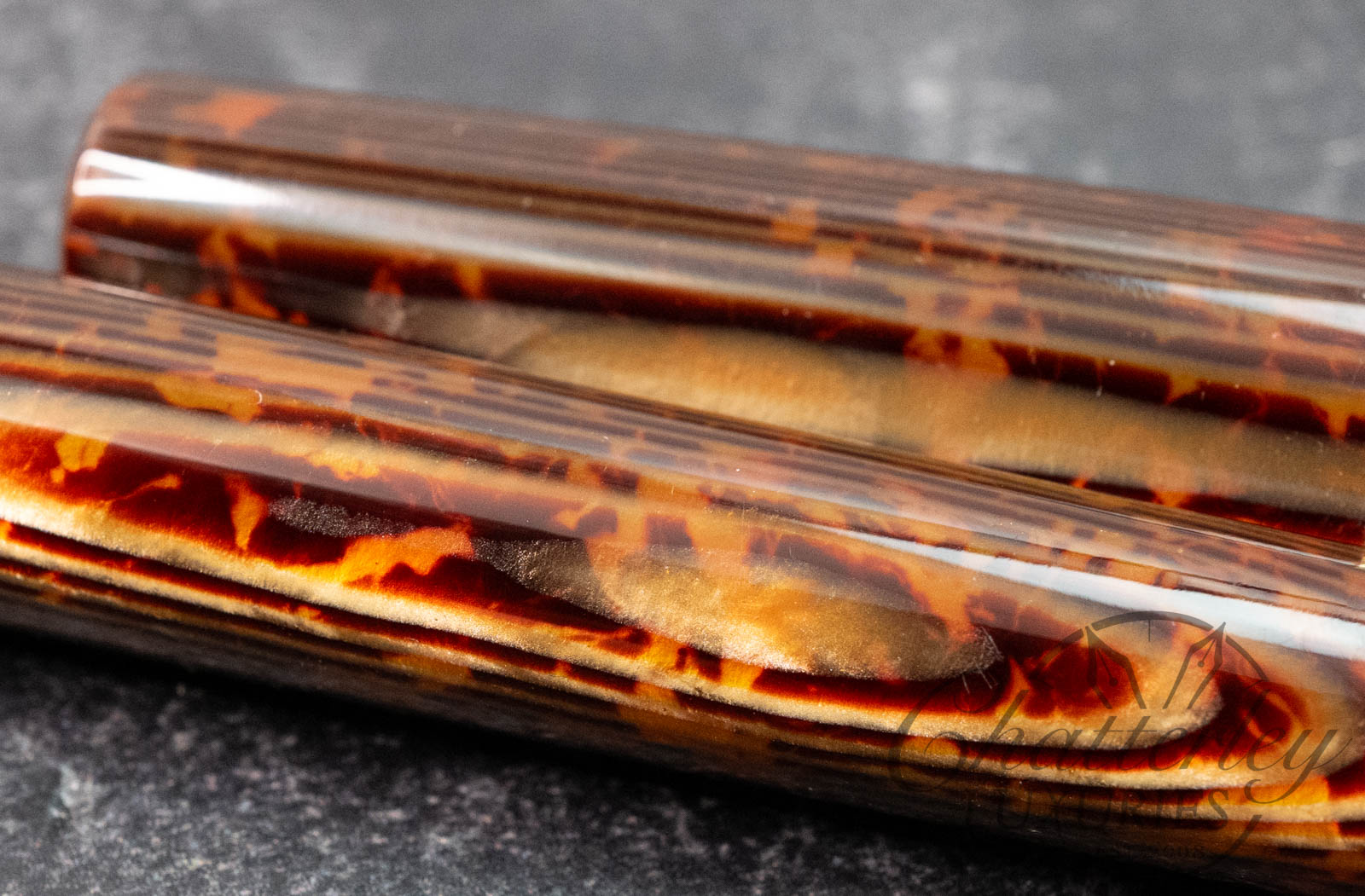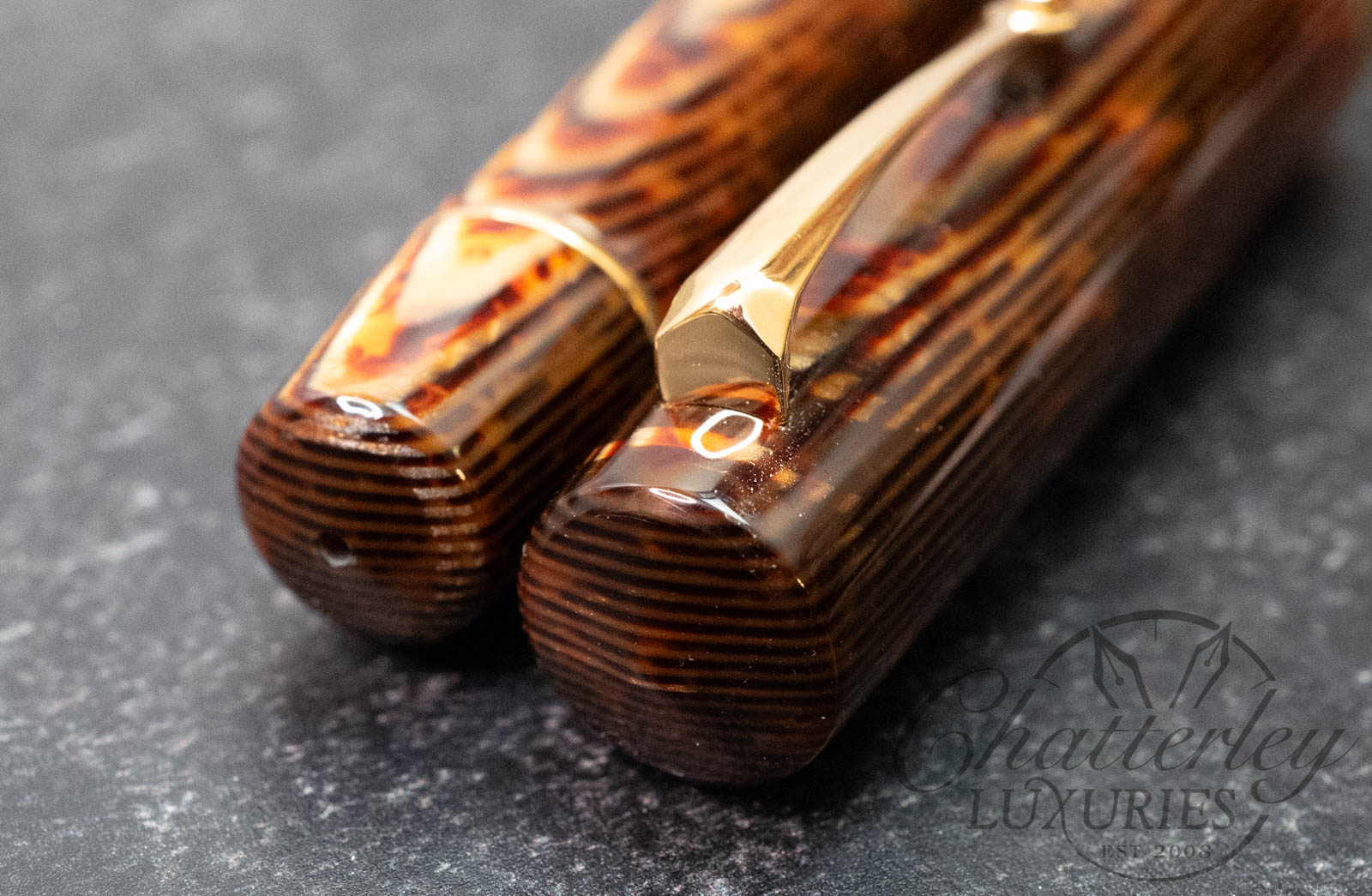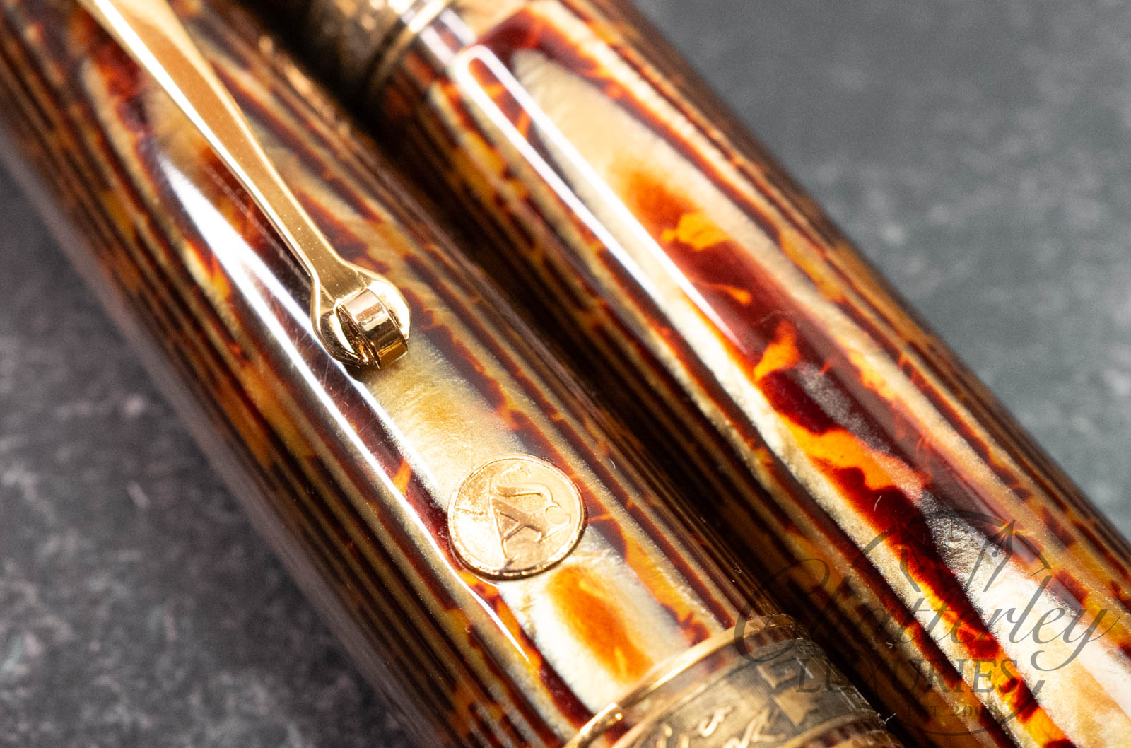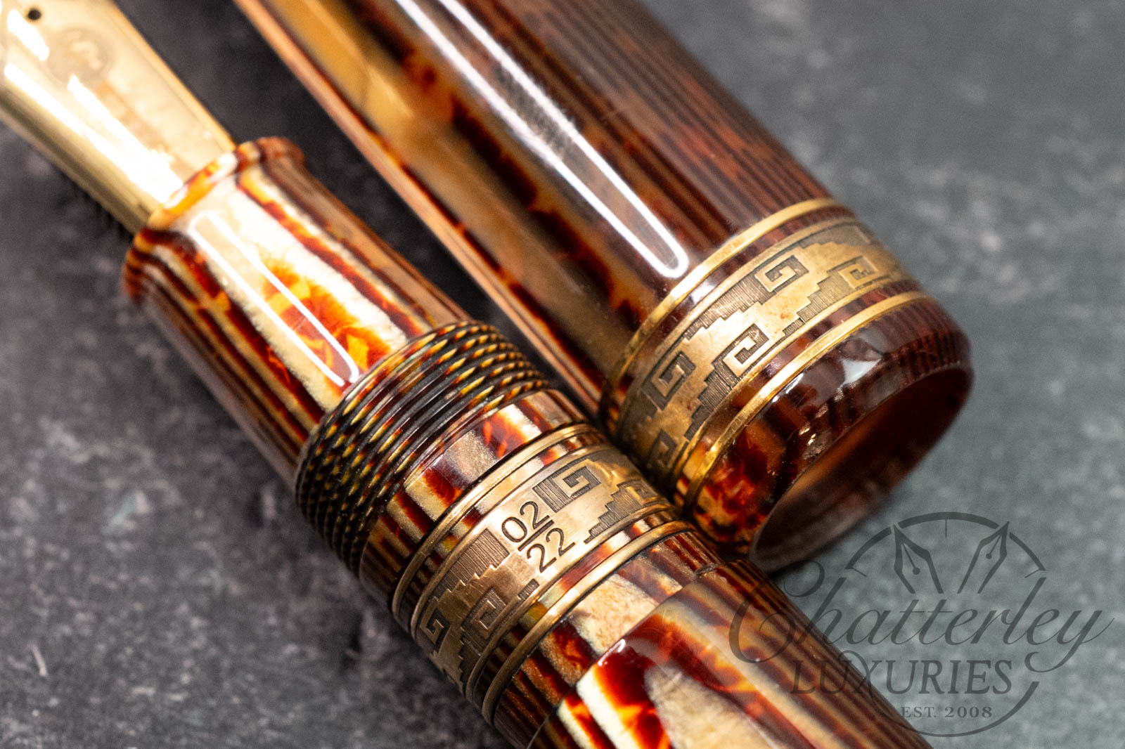 In addition to the 14k solid gold nib, each pen features a high capacity compressor filling system, art deco style engraved rings, and an ebonite feed.