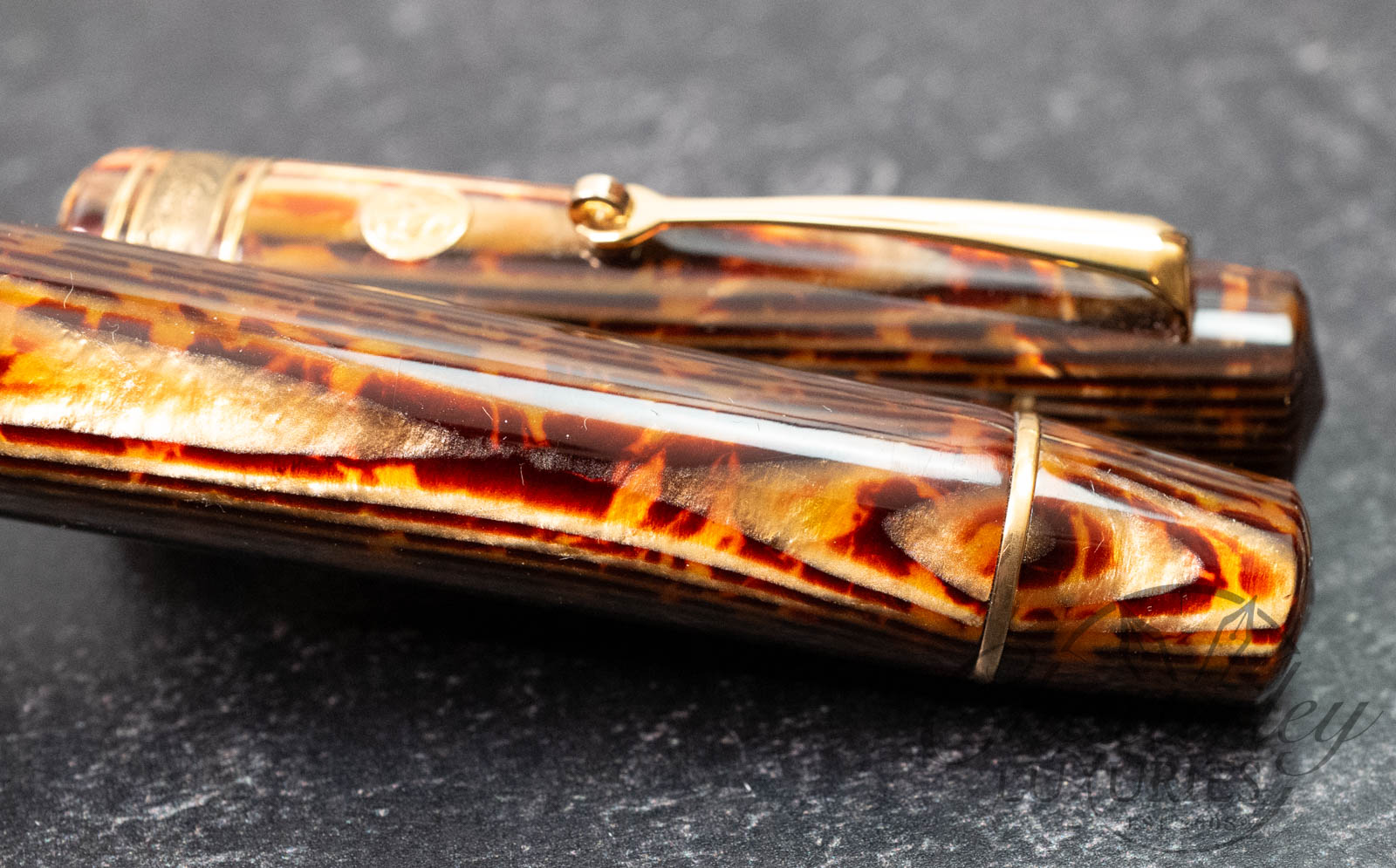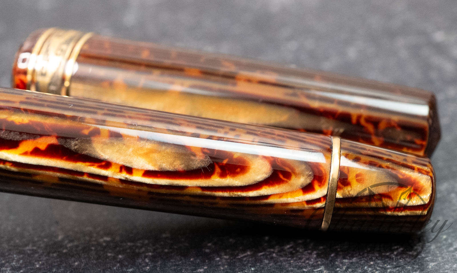 This pen is lovingly used and does not come with a box or papers. It is equipped with a 14k Magic Flex Gatsby Engraved #8 nib. It fills via a Pneumatic Filling System.