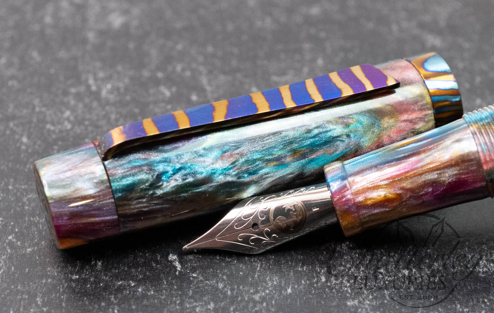 Atelier Lusso Carina 15 Rainbow Resin Fountain Pen with a Striped Timascus Clip