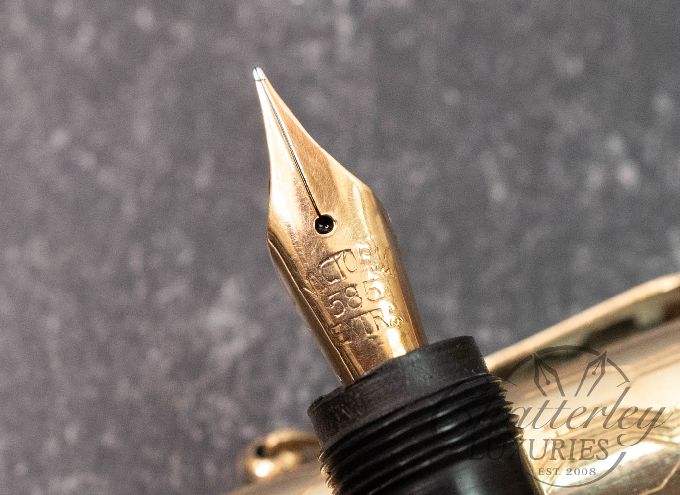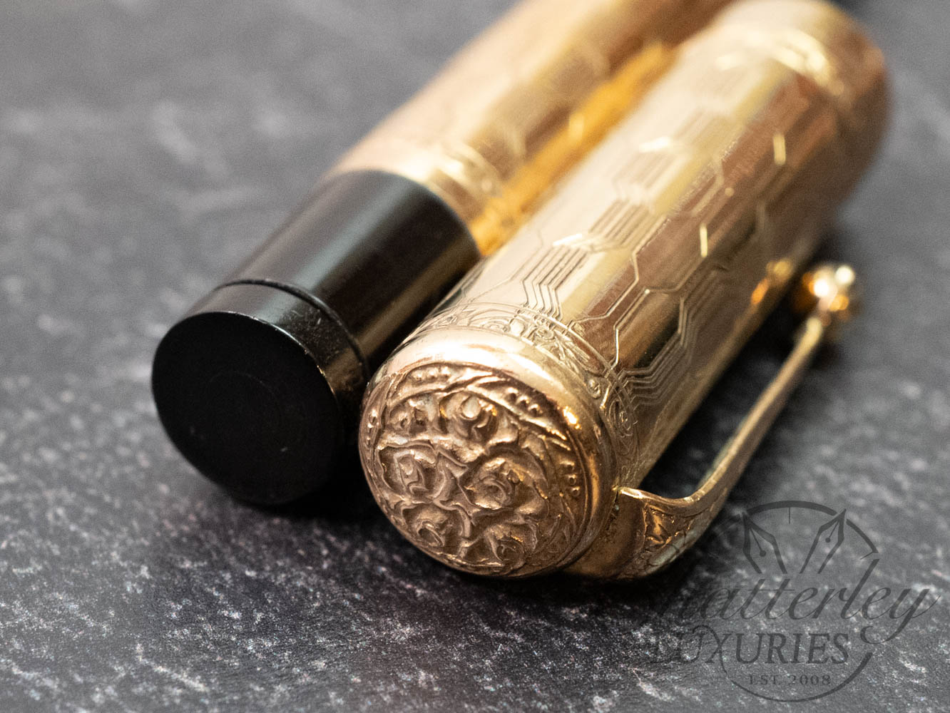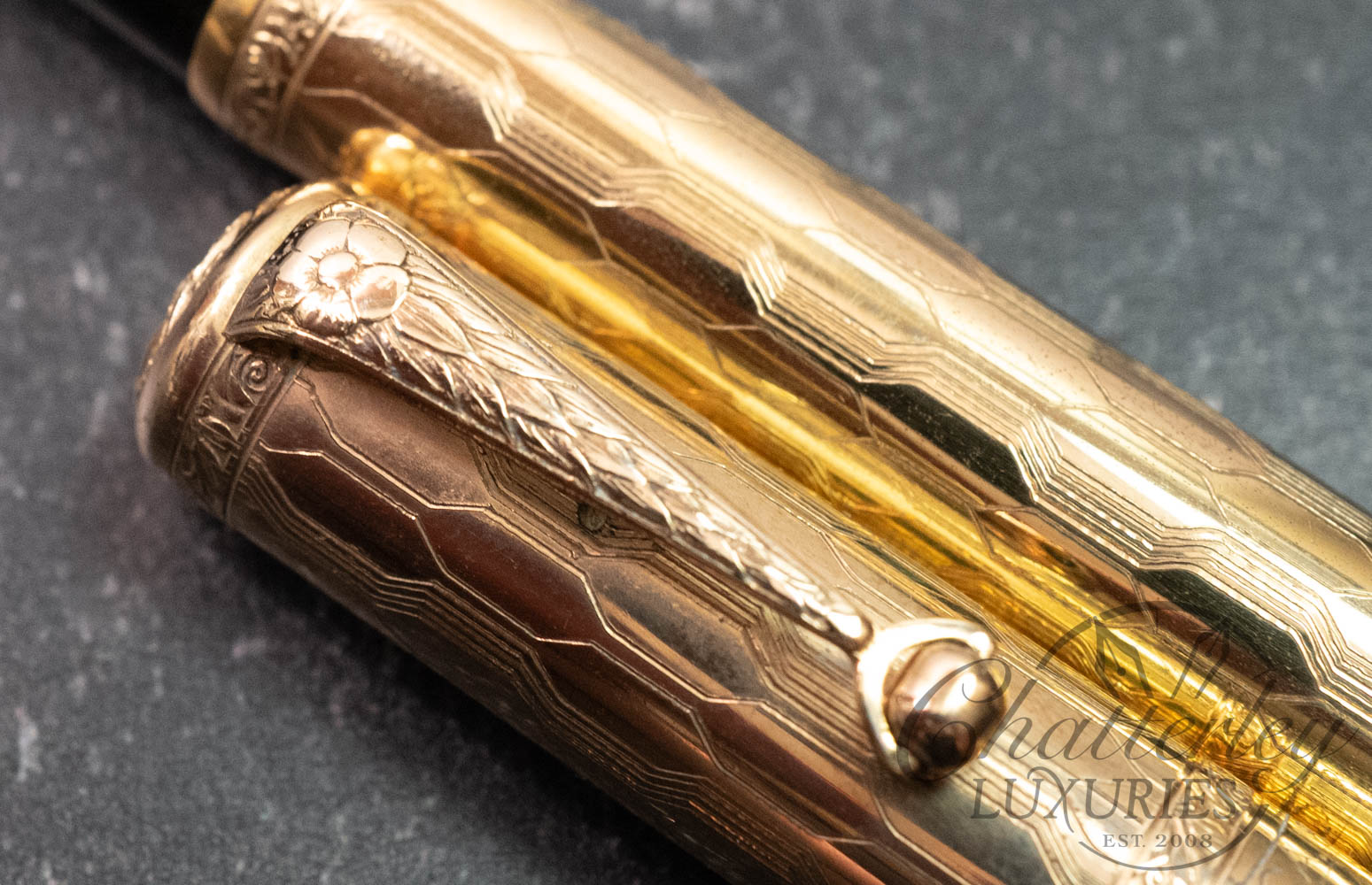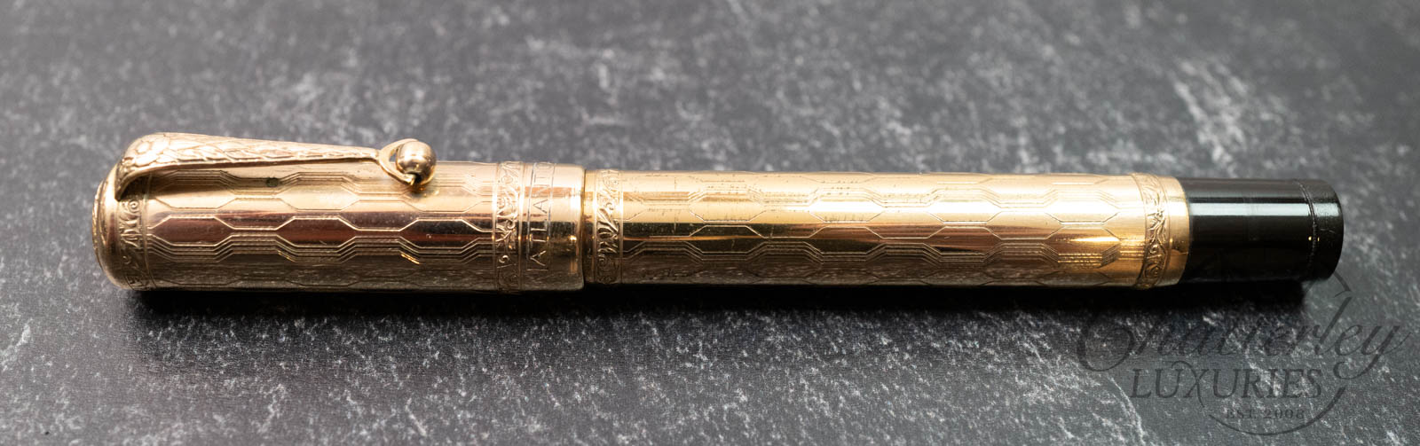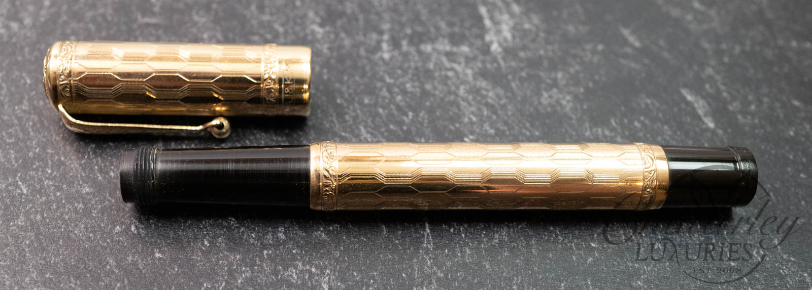 This vintage pen is close to 100 years old, it has seen regular use and shows signs of having been lovingly owned through the years. There is some clear oxidation occurring on the inside of the cap. It is equipped with a 14k Fine Flex nib and fills via Eye Dropper. The gold-filled trim, cap and body are rolled 18ct gold. (Writing Sample at the bottom)