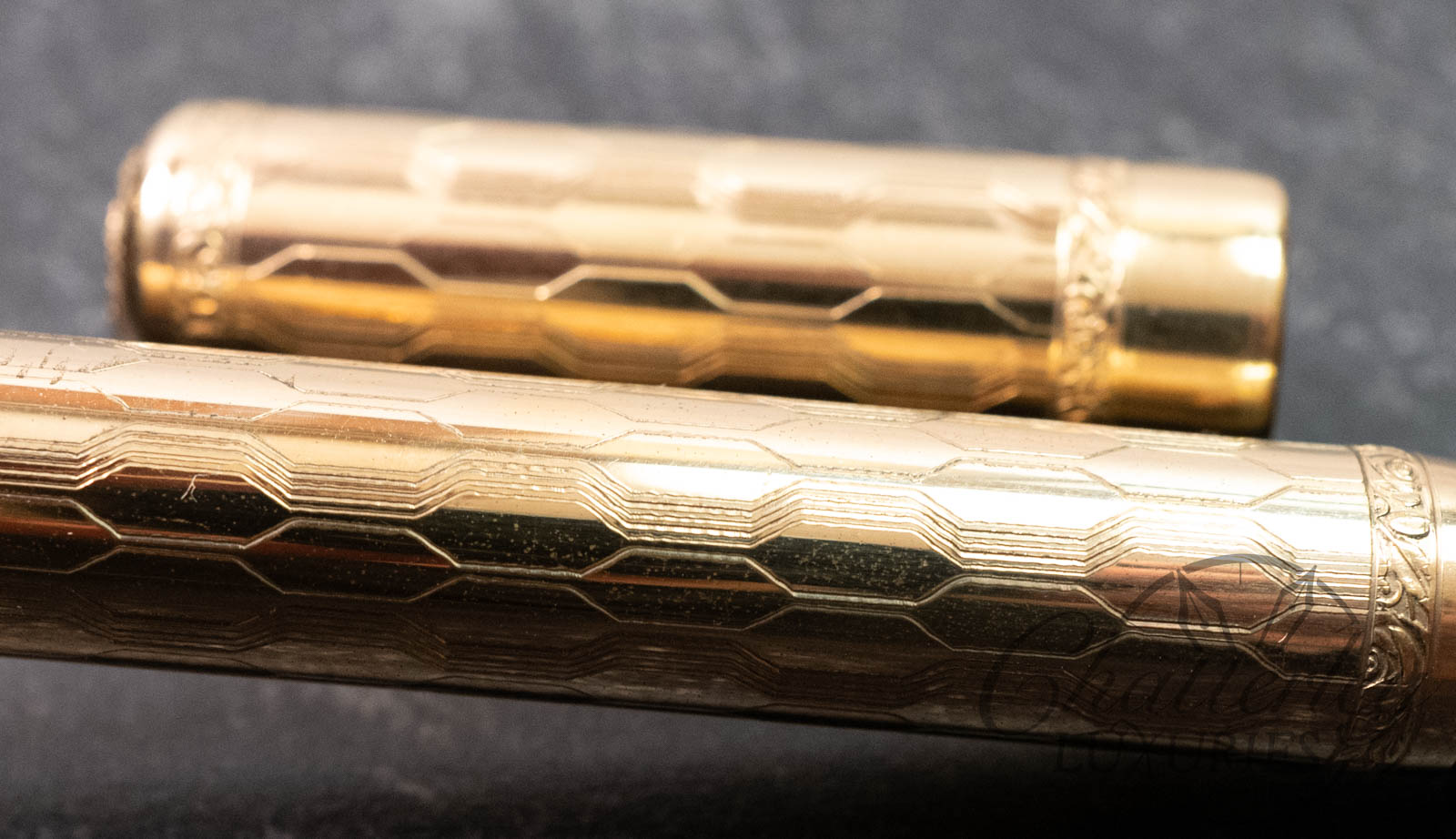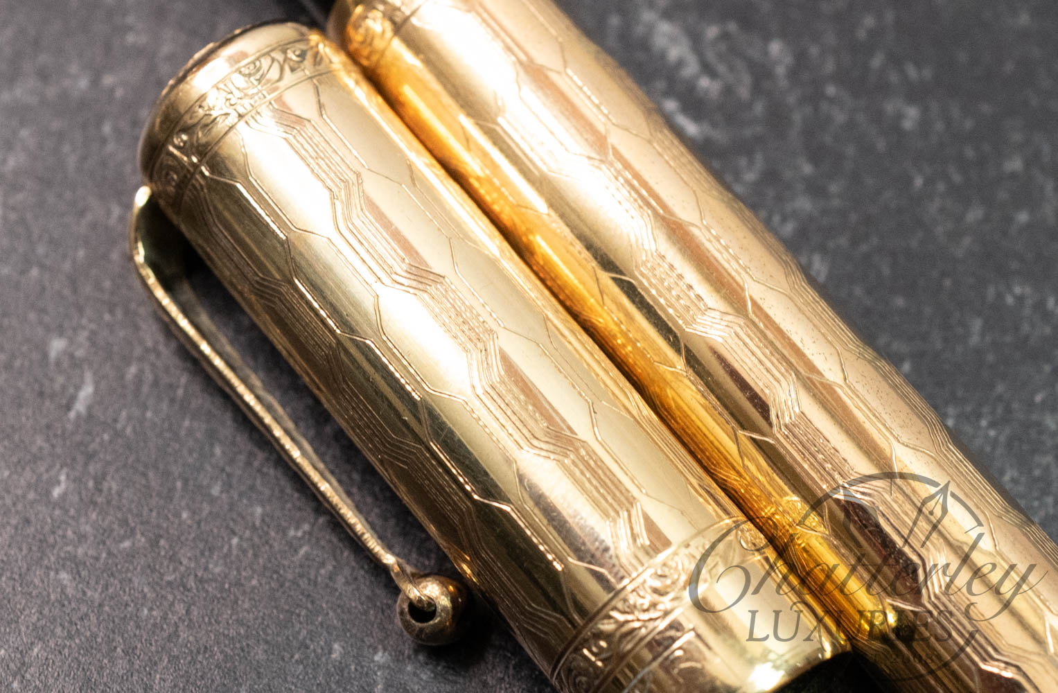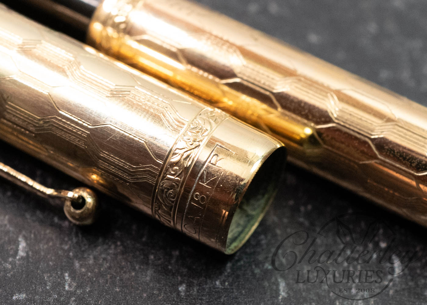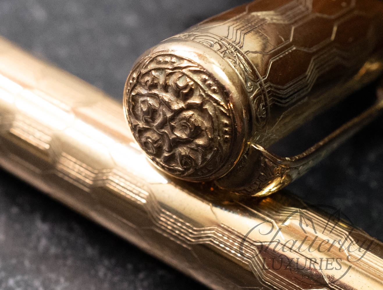 This vintage pen is close to 100 years old, it has seen regular use and shows signs of having been lovingly owned through the years. There is some clear oxidation occurring on the inside of the cap. It is equipped with a 14k Fine Flex nib and fills via Eye Dropper. The gold-filled trim, cap and body are rolled 18ct gold. (Writing Sample at the bottom)