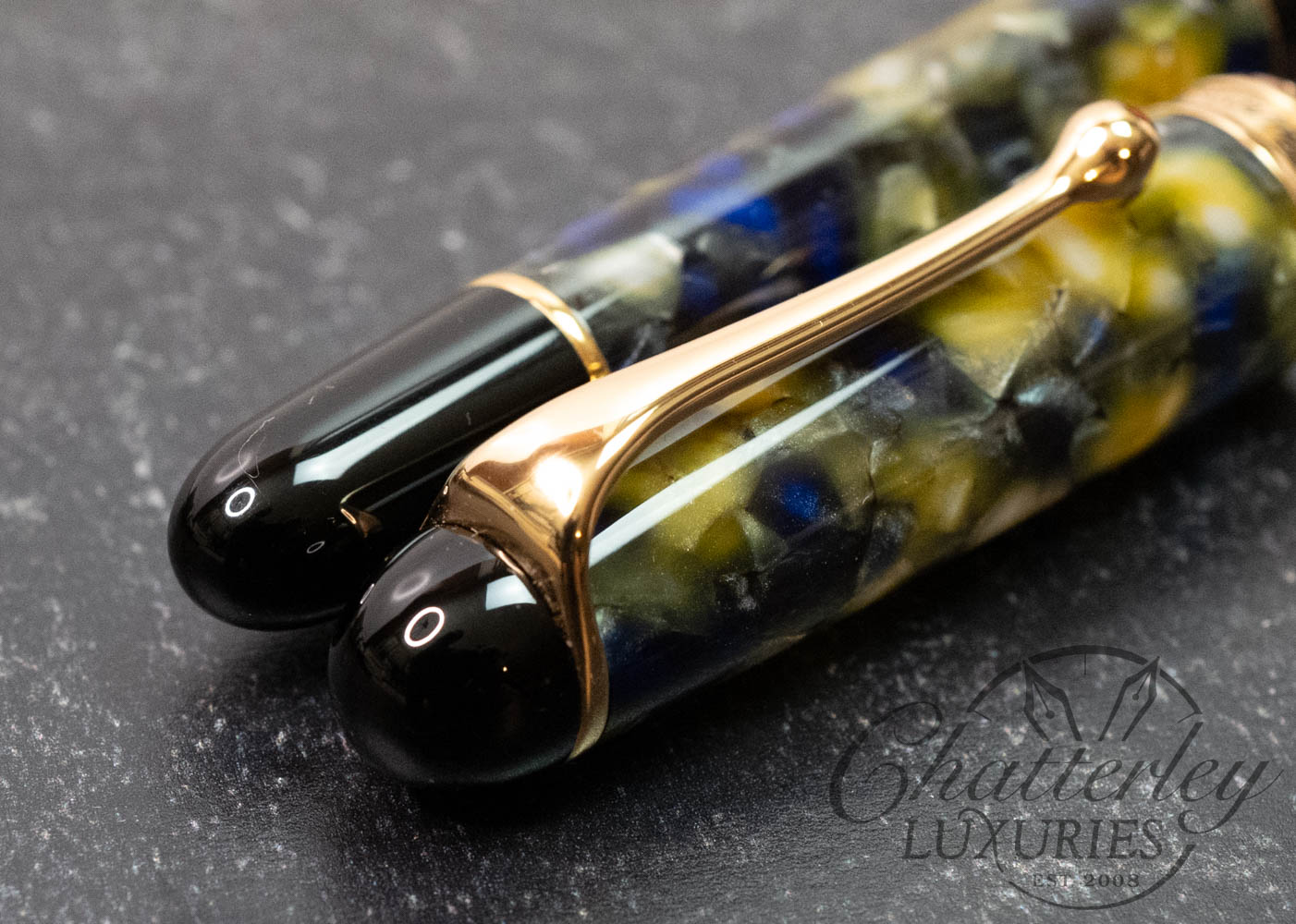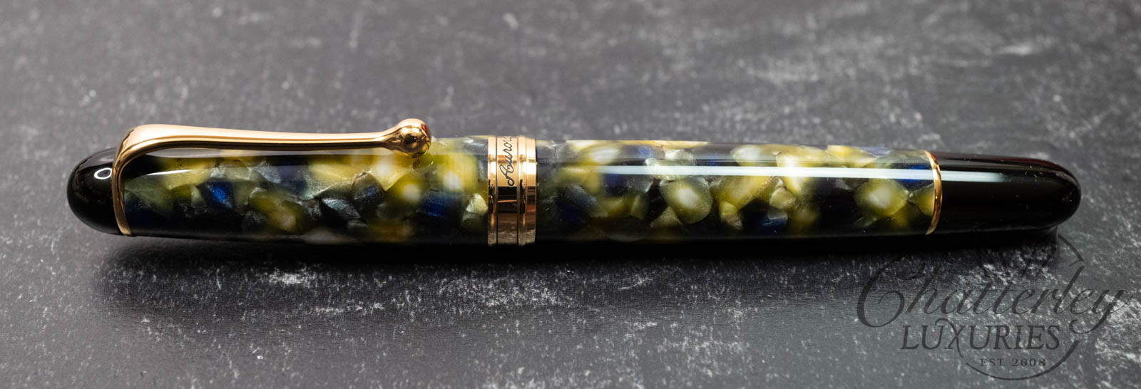 The Aurora 888 Saturno is made entirely in-house, including the nib and ebonite feed. The cap and barrel are made from Auroloide while the cap’s finial, grip section, and piston knob are made from black resin. All the metal trim is plated in yellow gold to match the solid 18k yellow gold nib. Each Aurora 888 Saturno fountain pen is engraved with its limited edition number out of 888 on the top of the cap, opposite the clip.