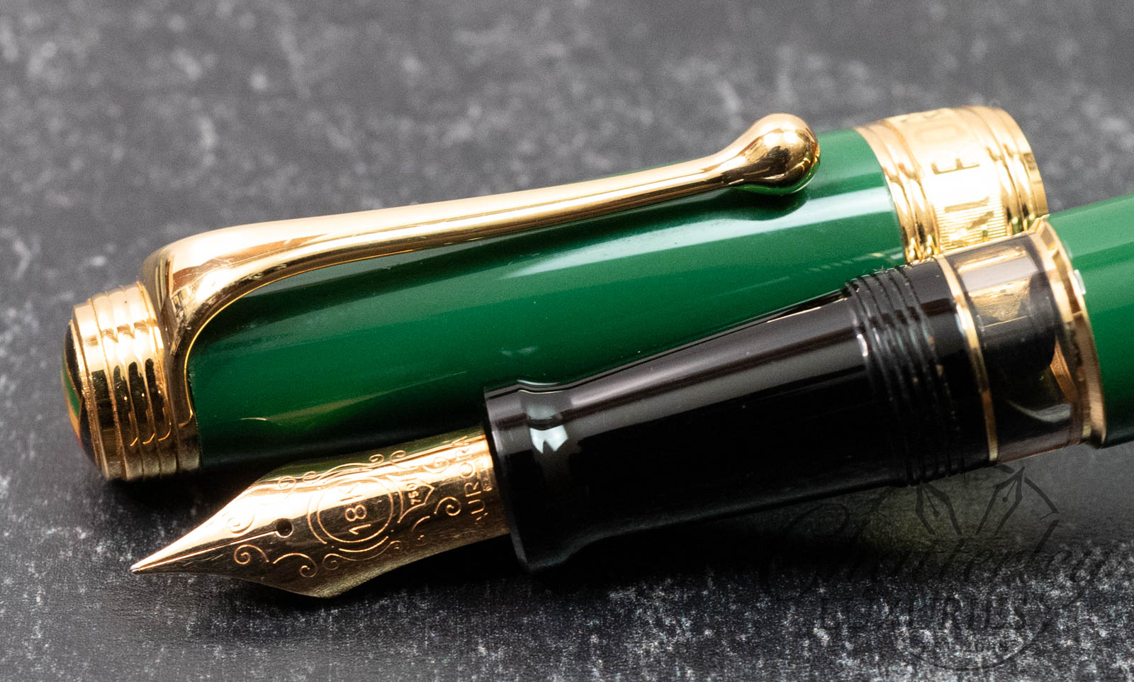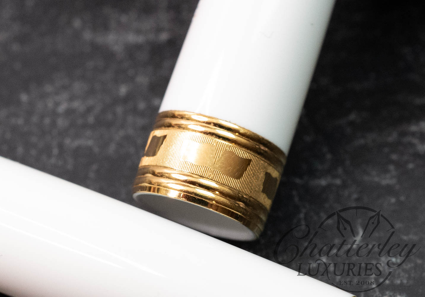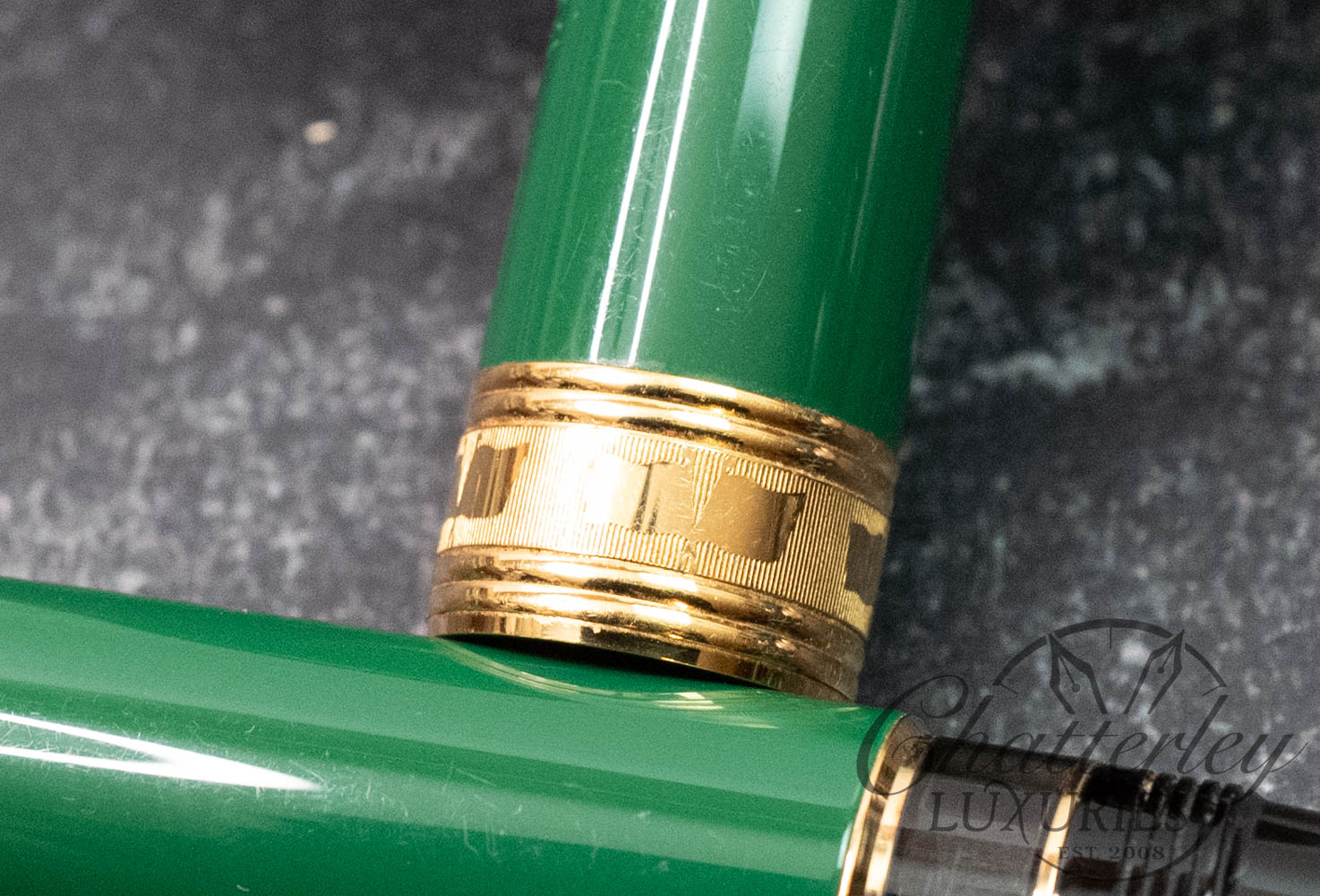 This pen set is lovingly used and does not come with a box or papers. The green fountain pen is equipped with an 18k Fine nib, the white pen is equipped with an 18k Medium nib and the red is equipped with an 18k Broad nib. These pens fill using a Piston Filling system. The white fountain pen has a cracked cap on two different sides (see last image).