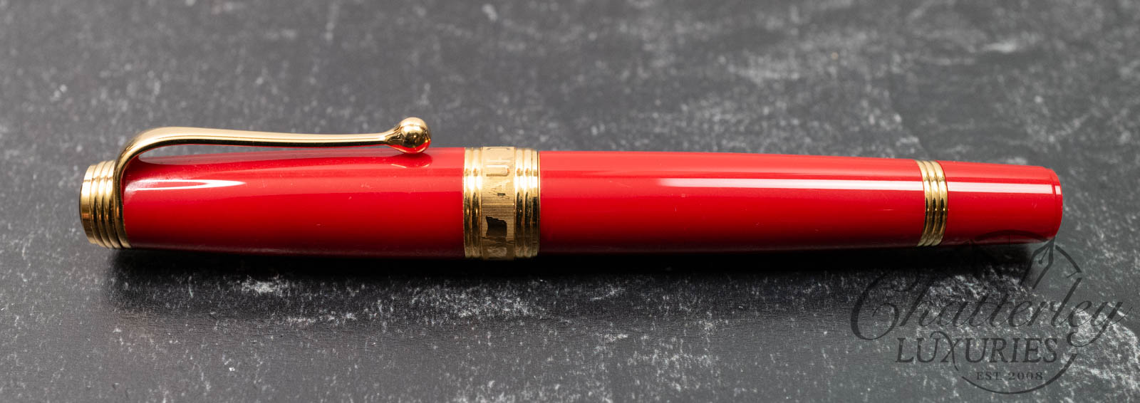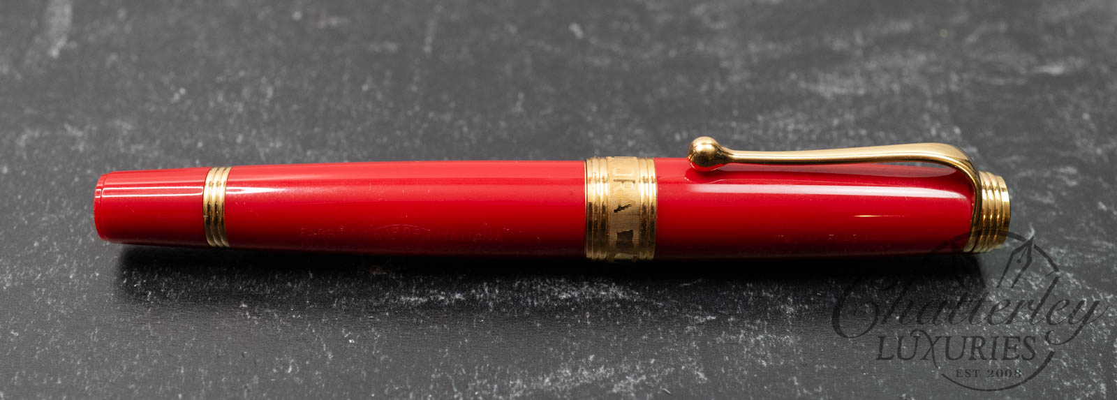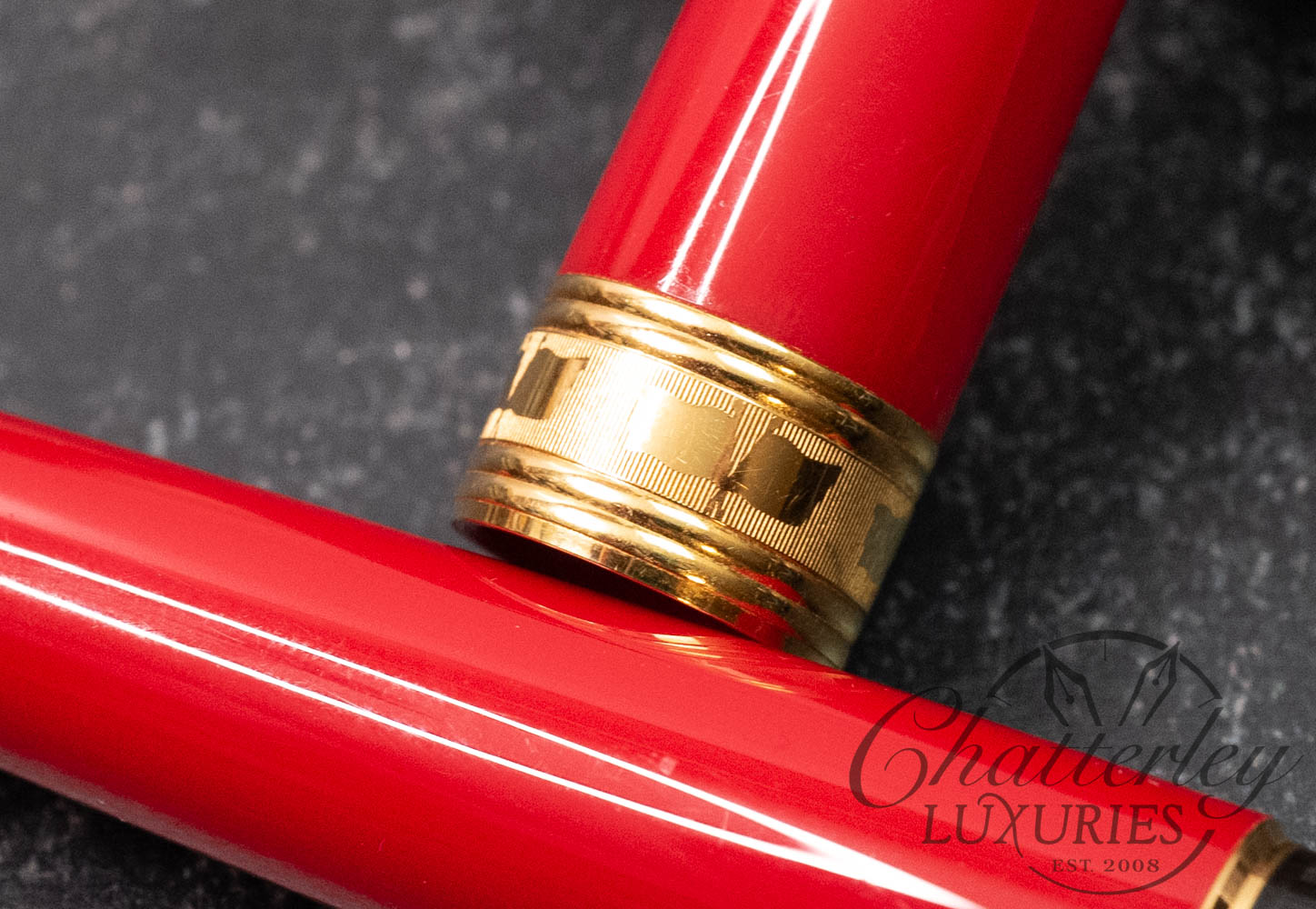 This pen set is lovingly used and does not come with a box or papers. The green fountain pen is equipped with an 18k Fine nib, the white pen is equipped with an 18k Medium nib and the red is equipped with an 18k Broad nib. These pens fill using a Piston Filling system. The white fountain pen has a cracked cap on two different sides (see last image).