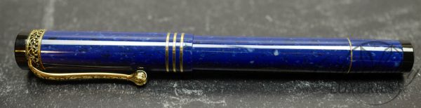 This Aurora Internazionale fountain pen has a cap and barrel made in marbled blue Auroloide. It is complemented by gold-plated trim, and an 18kt solid gold nib. Limited Edition of only 919 numbered pieces.