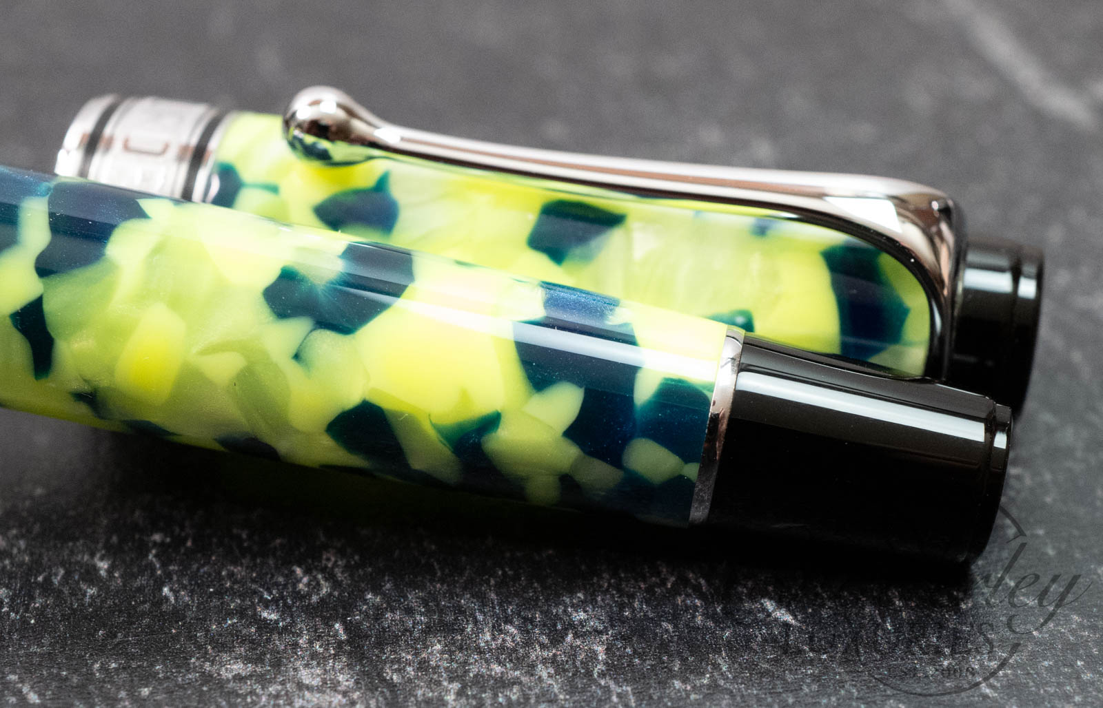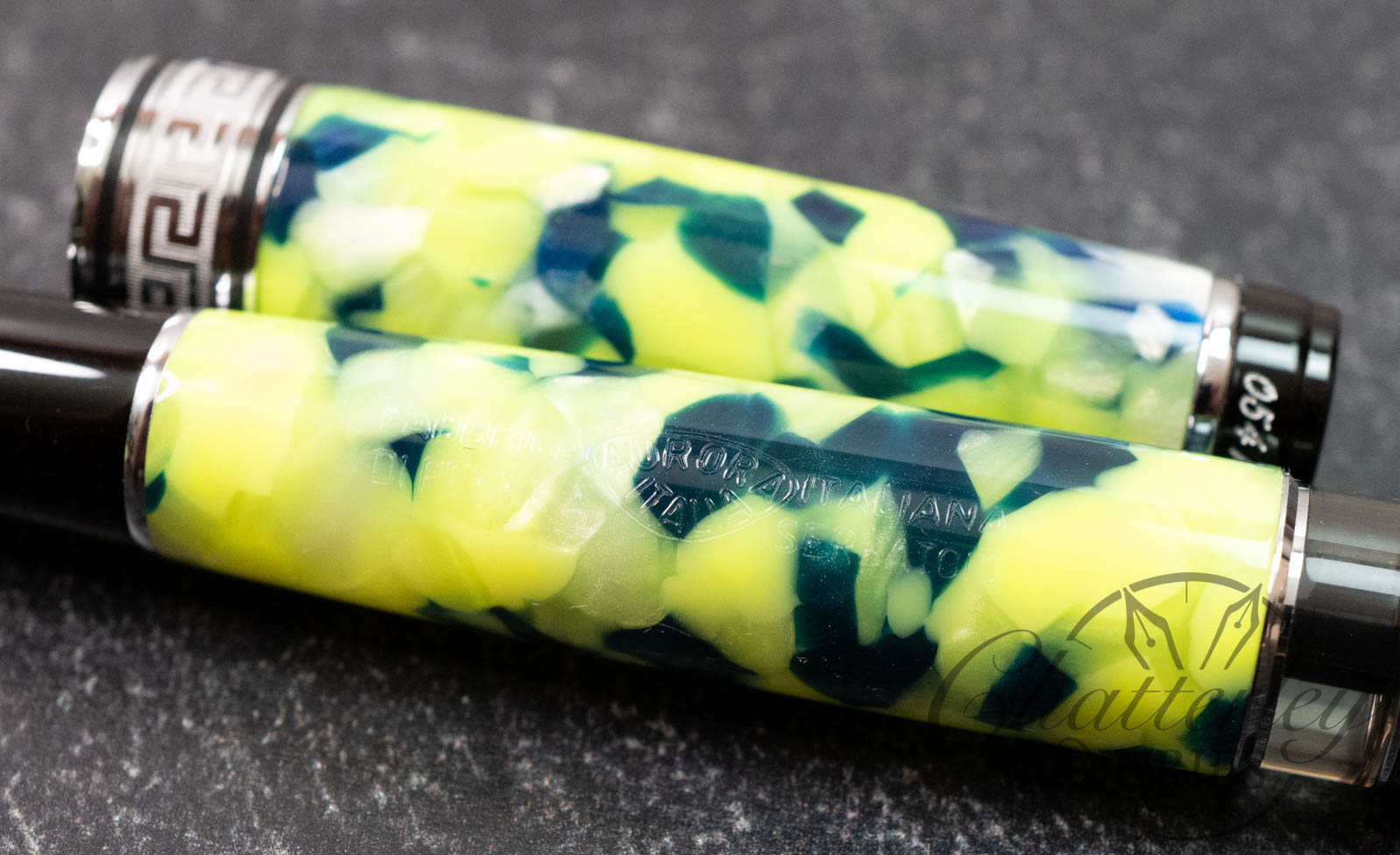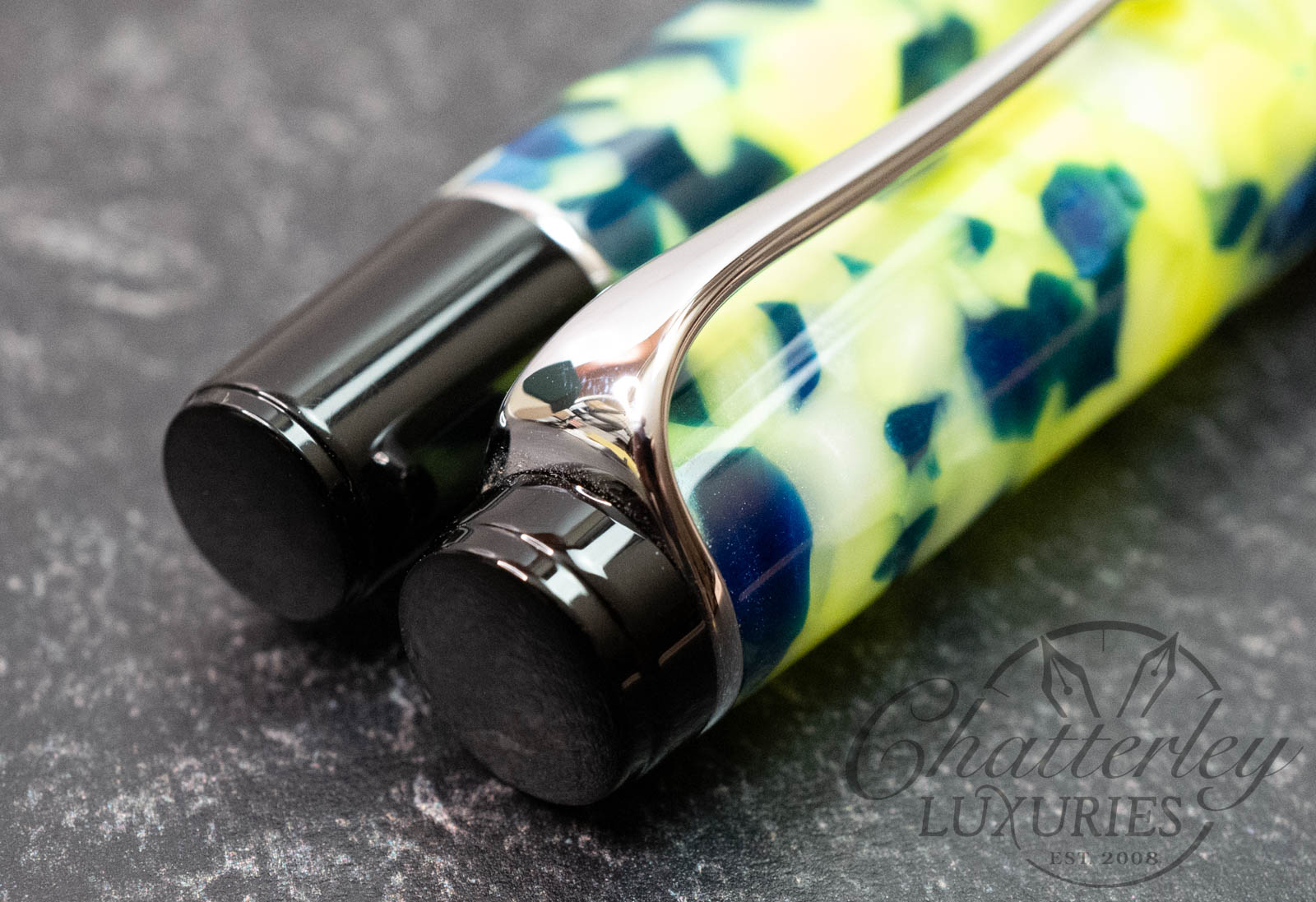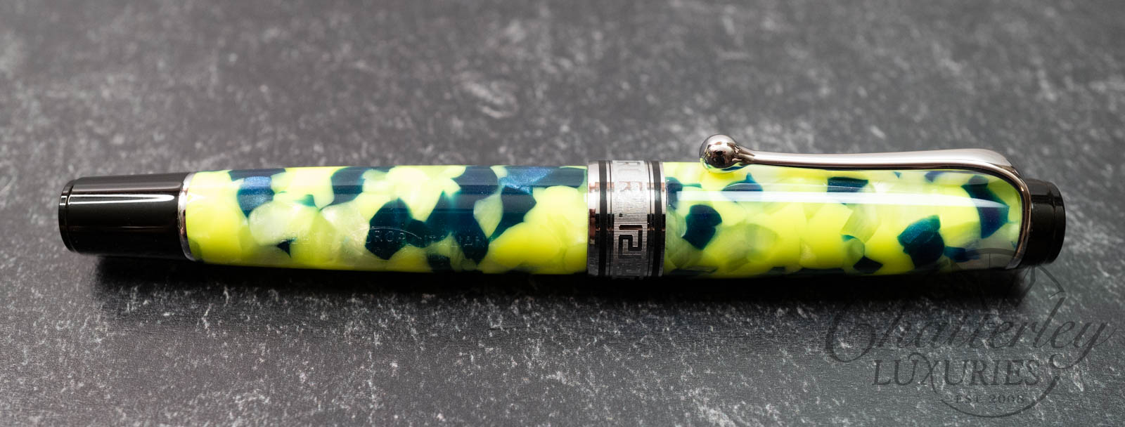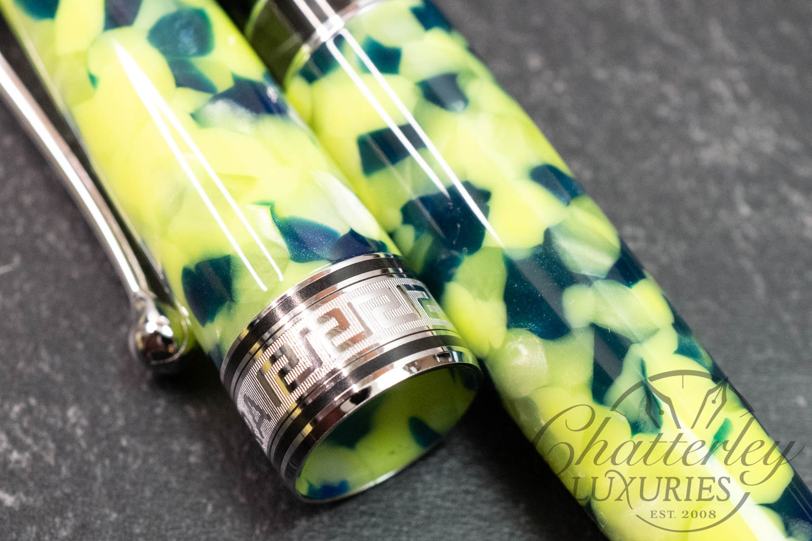 The Optima 365 FLUO is a striking limited-edition fountain pen from Aurora, crafted in only 365 numbered pieces. Featuring a vibrant fluorescent yellow and blue marbled Auroloide cap and barrel with chrome trims, this pen is both bold and collectible. It boasts an 18kt rhodium-treated solid gold nib for a smooth writing experience, while the engraved serial number makes each piece unique. Packaged in a sleek black leatherette case, the Optima 365 FLUO even includes a glow-in-the-dark sleeve, adding an extra touch of distinction.