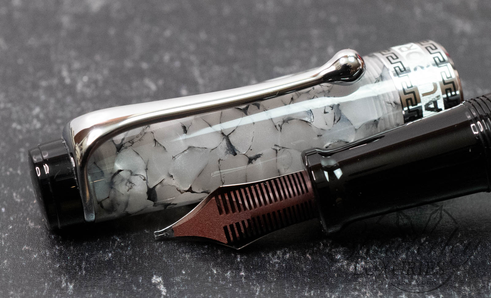 The fountain pen features the traditional piston refill mechanism and hidden reservoir.
