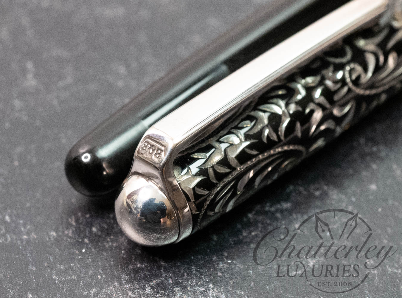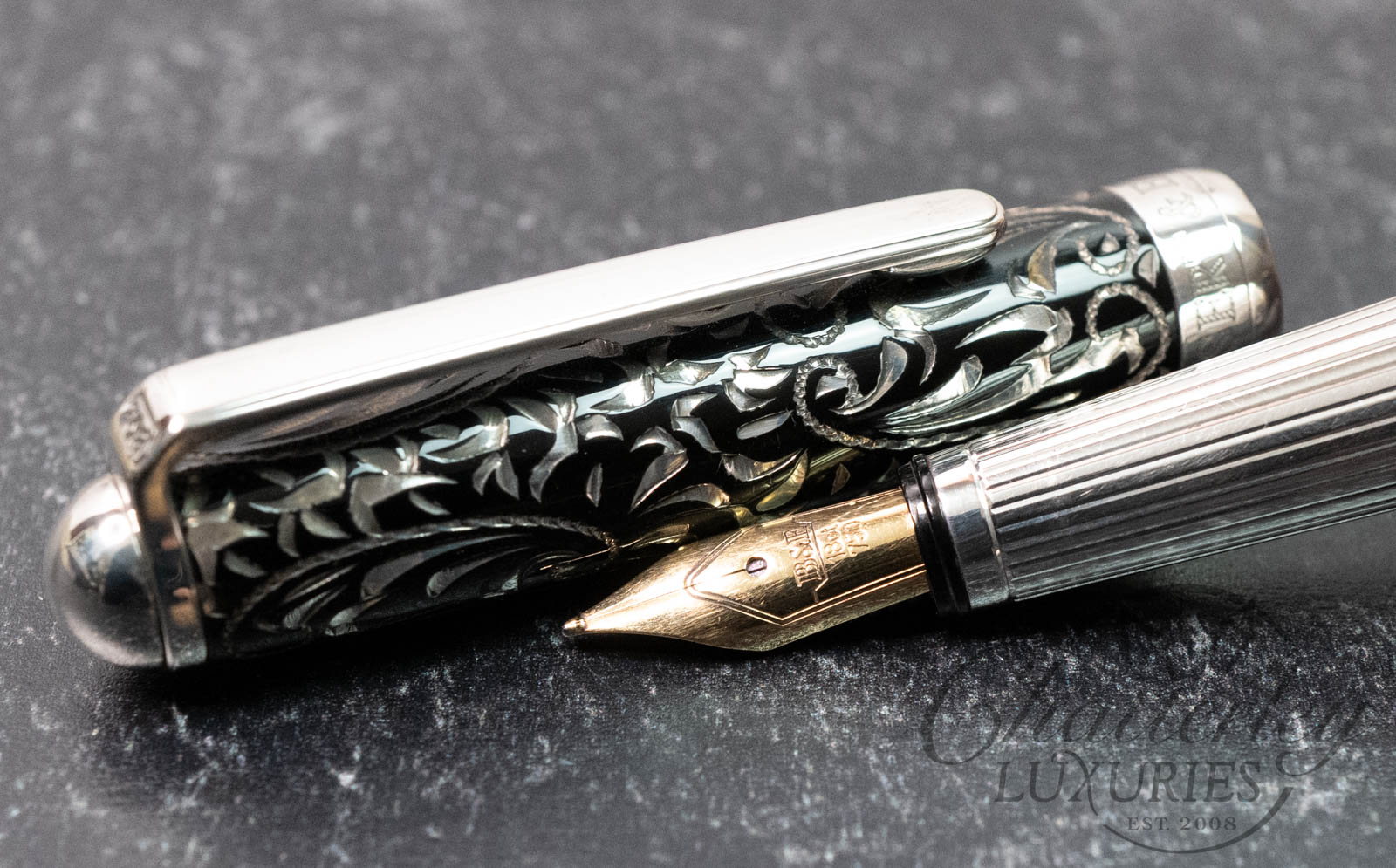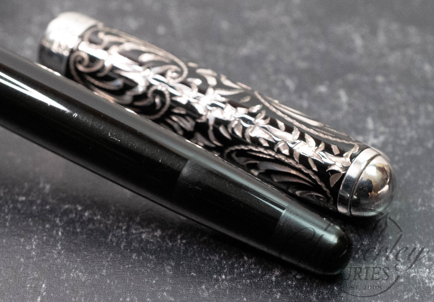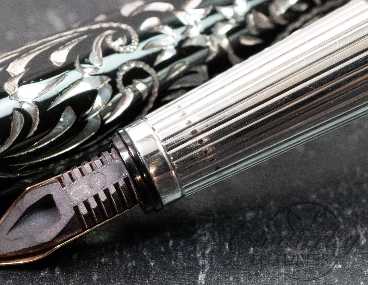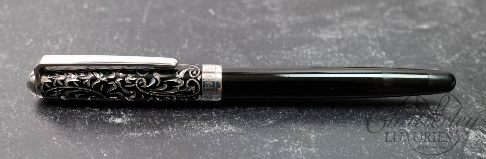 This pen is lovingly used and comes complete with a box and papers. It is equipped with an 18k Medium nib and fills via a Cartridge Convertor/Cartridge (included).