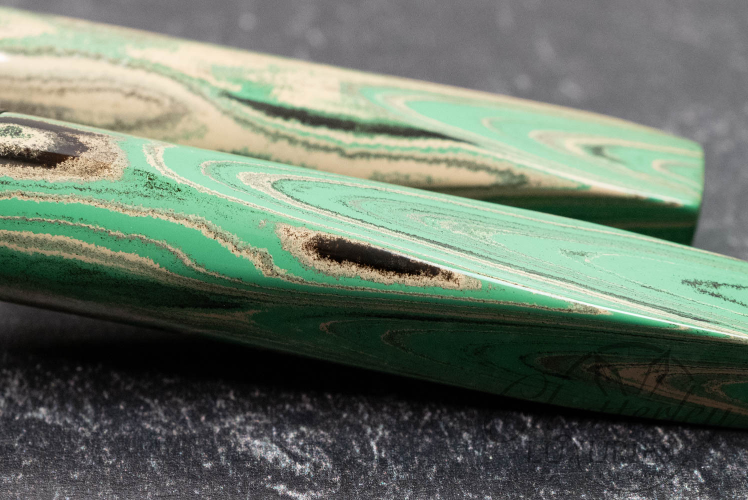 The Chateau Shinogi showcases the artwork of Shawn Newton and the innovative use of German Ebonite, a unique and high-quality hard rubber (vulcanite) produced by Schönberger Ebonite Manufaktur GmbH (SEM) in Germany. Known for its excellent polishing, durability, and vibrant color, this material is highly prized for crafting luxury fountain pens. It provides a warm, comfortable and durable feel that, if properly maintained, can last a lifetime.