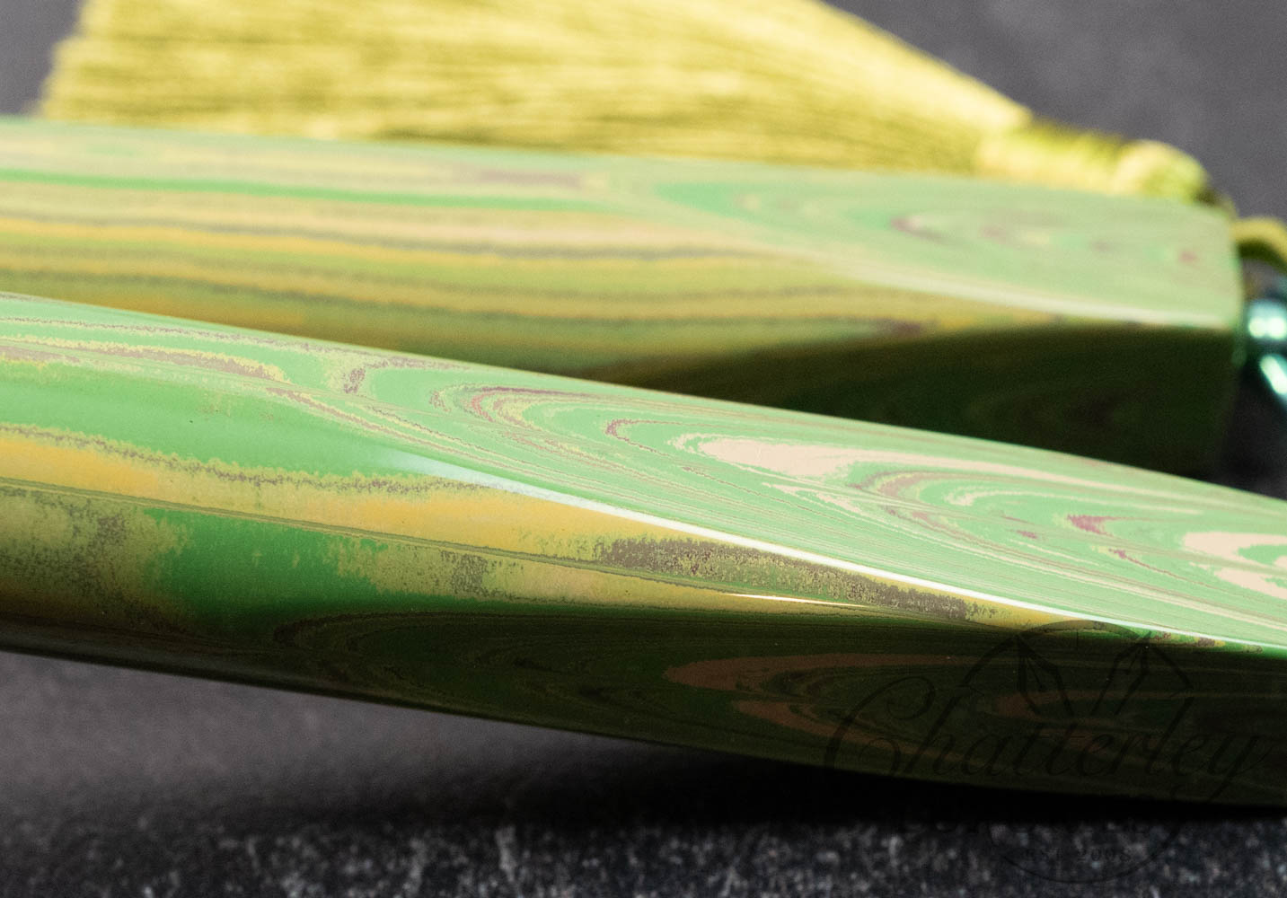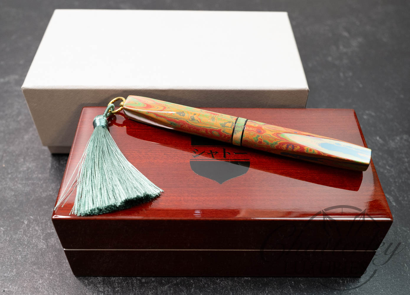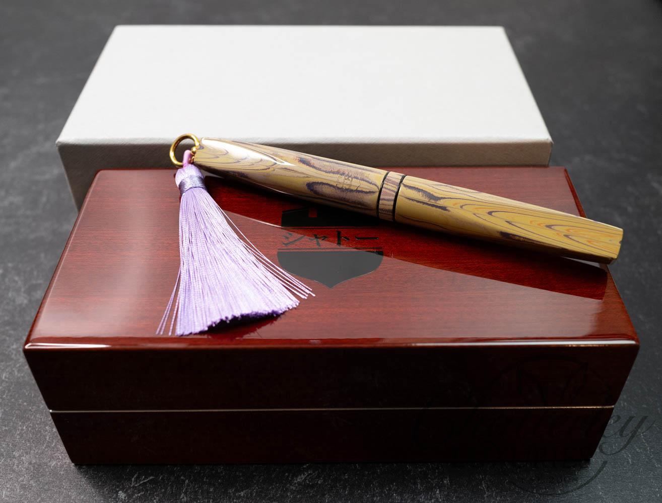 Chateau Shinogi Guntō takes its name from Japanese swords. “Shinogi” refers to the defining ridge line on a blade. Displayed here in the pen’s faceted profile. “Guntō” references Japanese military swords, traditionally finished with tassels, which inspired the tassel details.