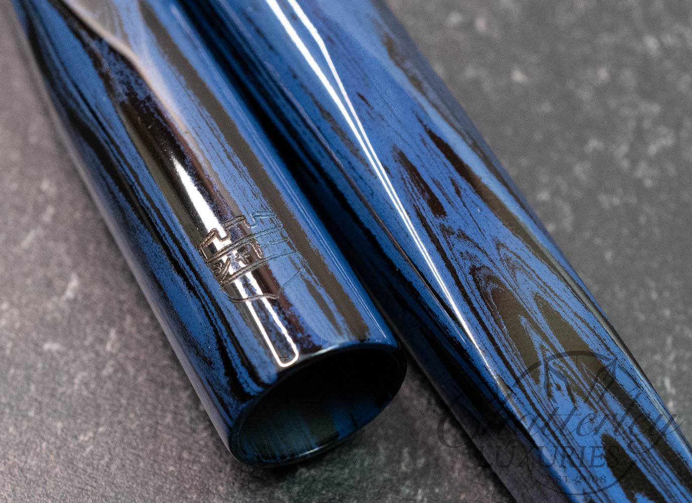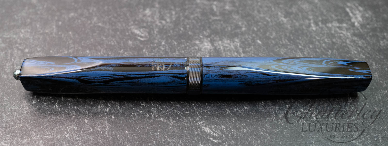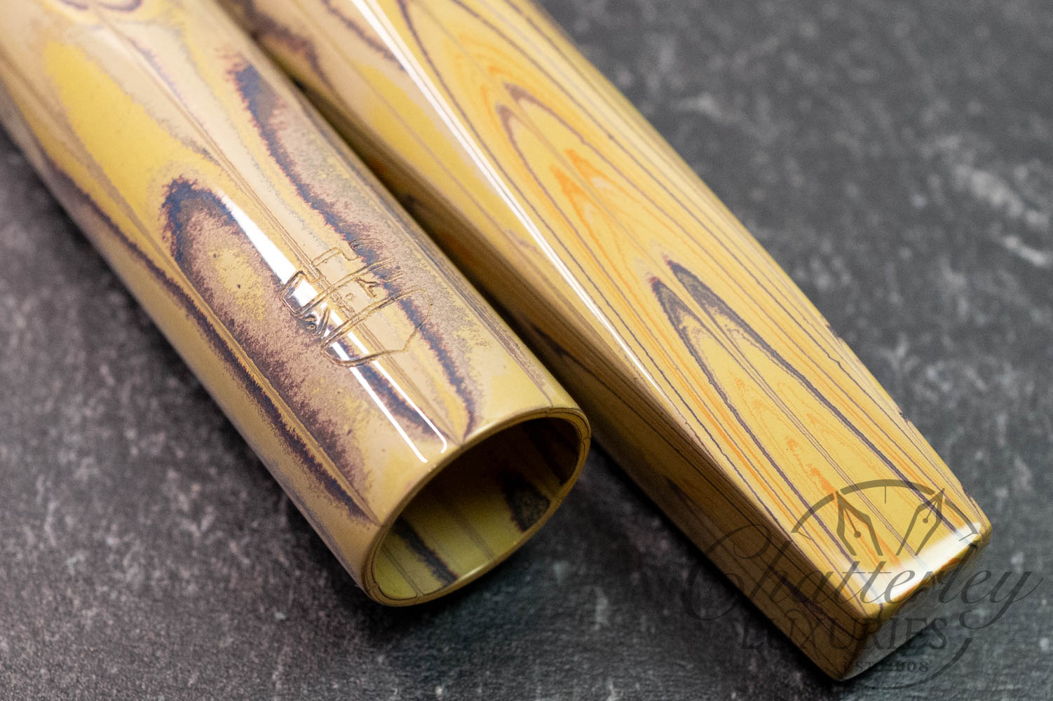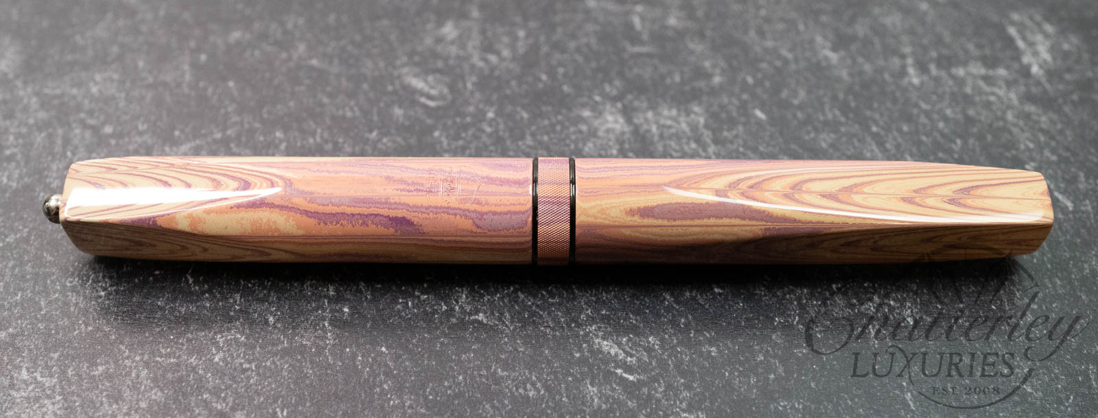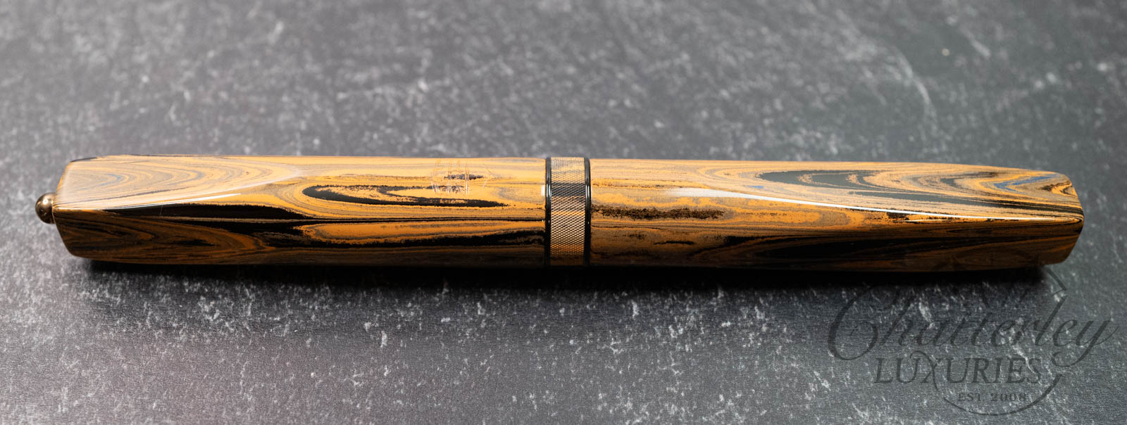 These pen highlight Shawn Newton’s craftsmanship and the exceptional German ebonite—premium hard rubber (vulcanite) produced by Schönberger Ebonite Manufaktur GmbH (SEM) in Germany. Prized for its durability, depth of color, and ability to take a remarkable polish, SEM ebonite offers a warm, comfortable feel in hand and—when properly cared for—can last a lifetime. Ebonite is created through the vulcanization of natural rubber, producing a dense, non-conductive material with a rich, lacquer-like gloss. Compared to acrylic, it’s known for a more organic “optic and haptic” (We have pens in ebonite 100 years old that look new still)