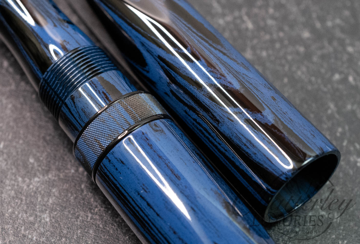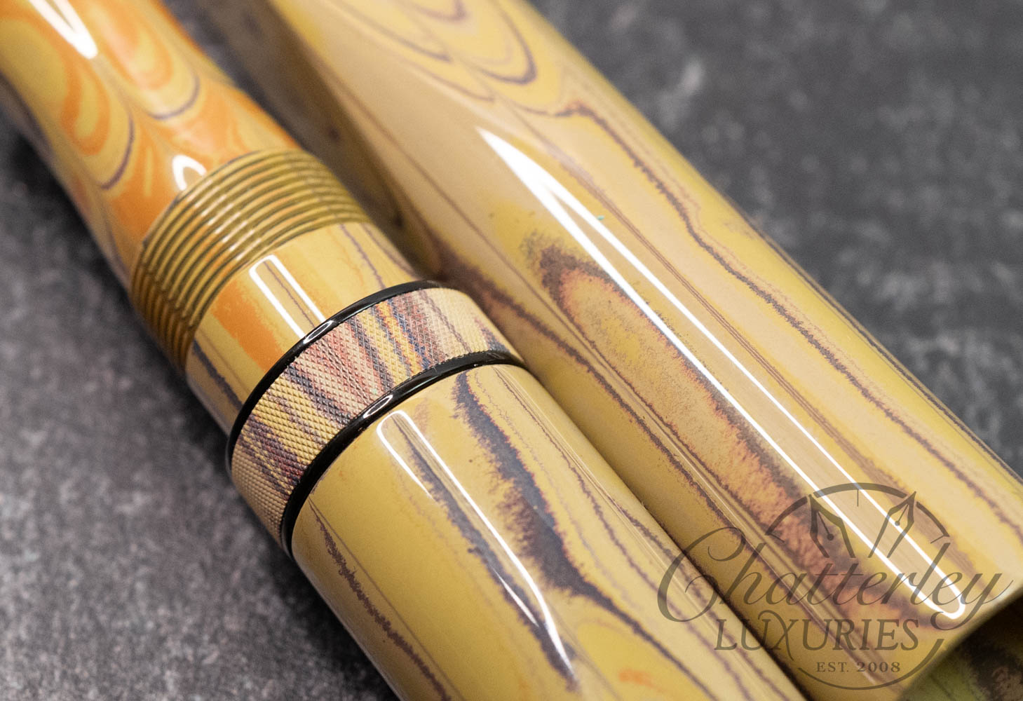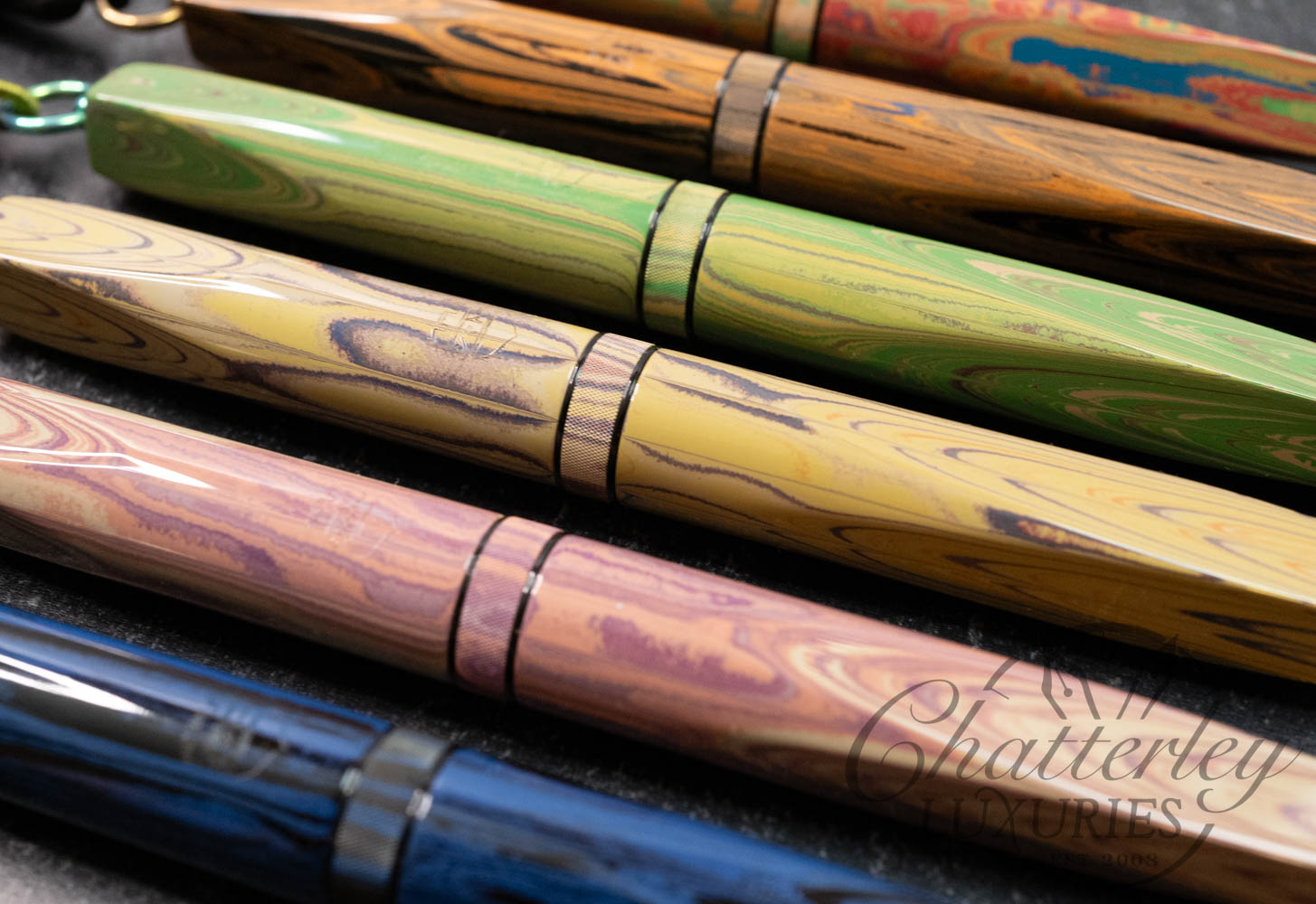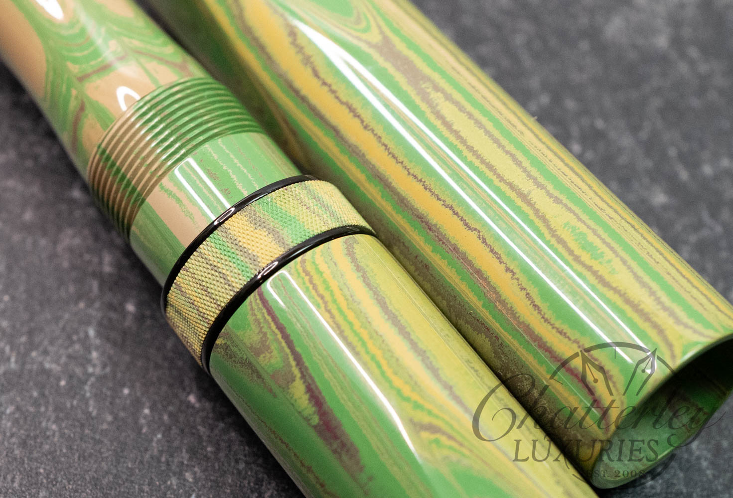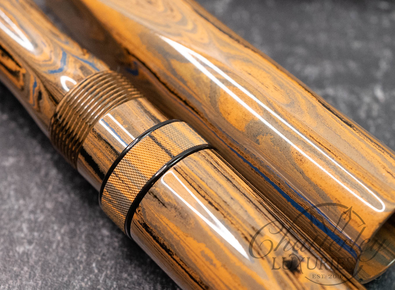 These pen highlight Shawn Newton’s craftsmanship and the exceptional German ebonite—premium hard rubber (vulcanite) produced by Schönberger Ebonite Manufaktur GmbH (SEM) in Germany. Prized for its durability, depth of color, and ability to take a remarkable polish, SEM ebonite offers a warm, comfortable feel in hand and—when properly cared for—can last a lifetime. Ebonite is created through the vulcanization of natural rubber, producing a dense, non-conductive material with a rich, lacquer-like gloss. Compared to acrylic, it’s known for a more organic “optic and haptic” (We have pens in ebonite 100 years old that look new still)