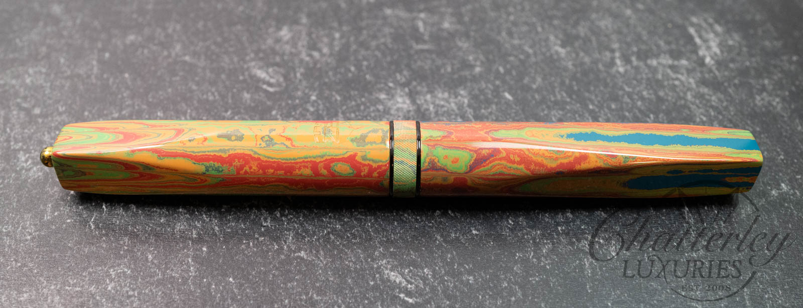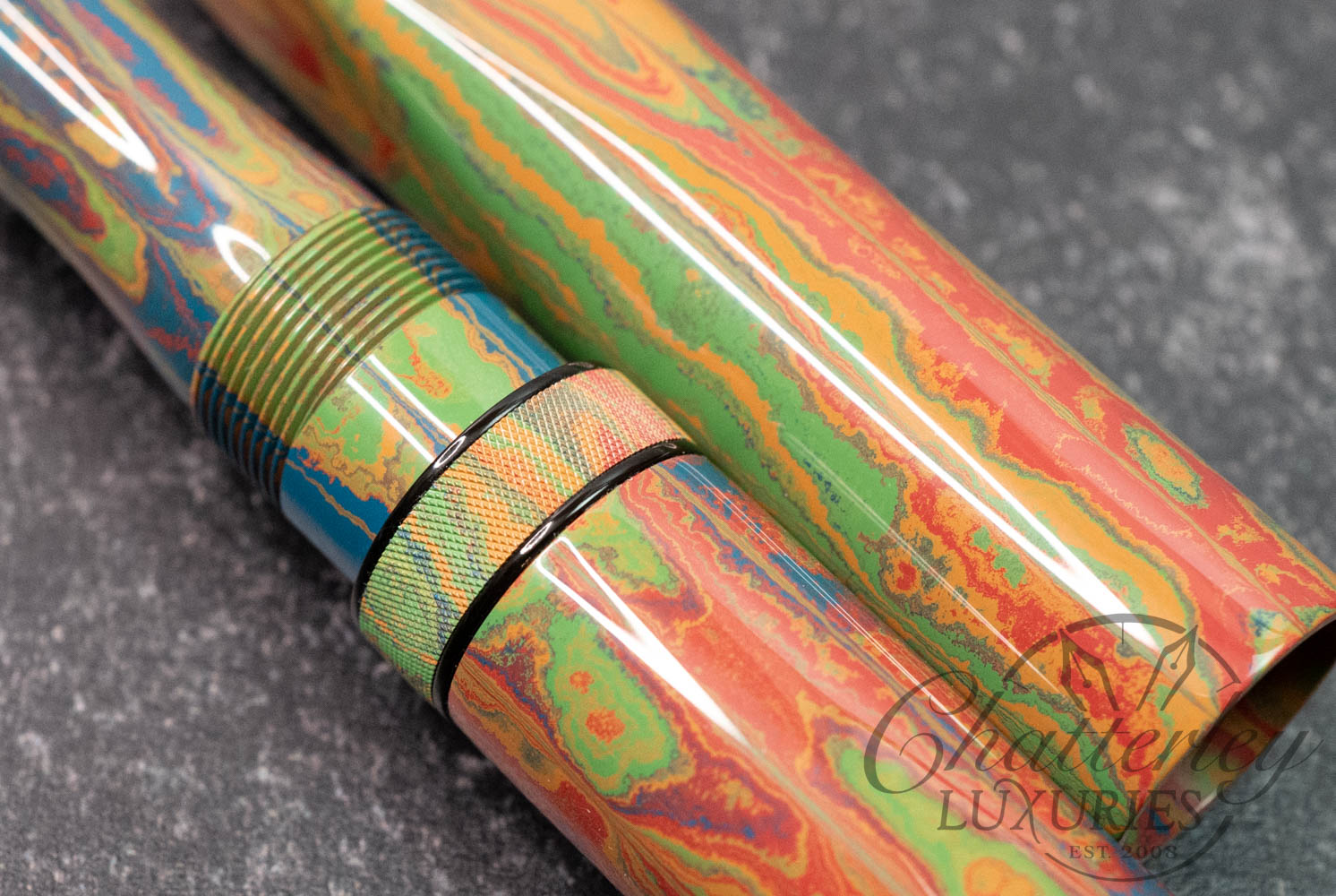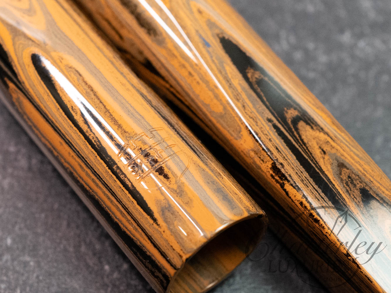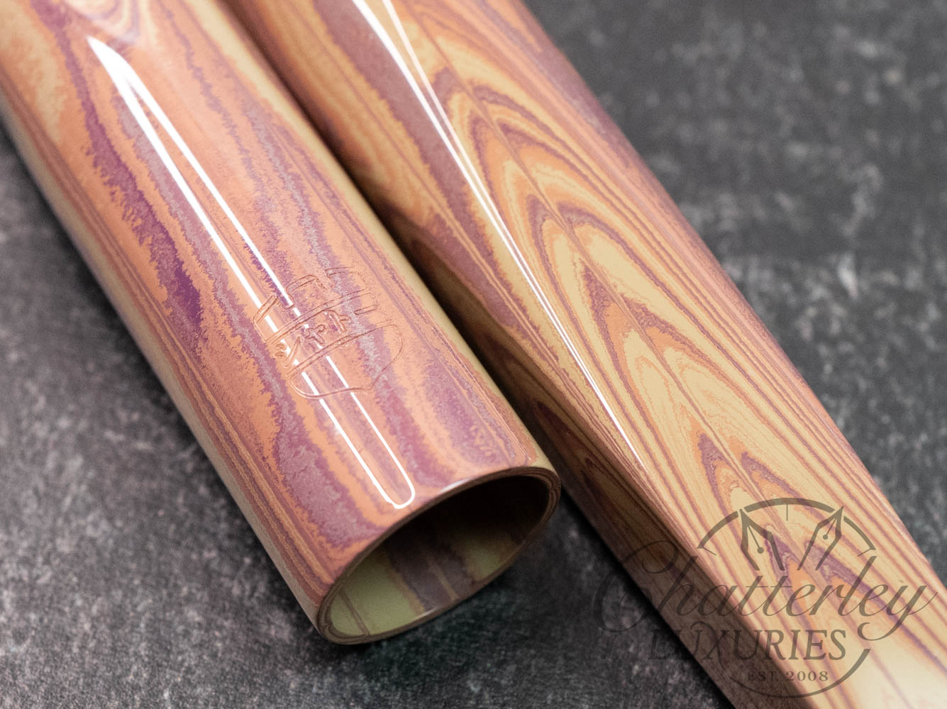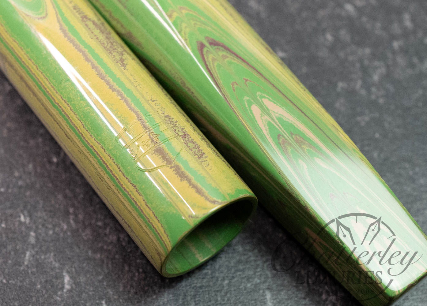 These pen highlight Shawn Newton’s craftsmanship and the exceptional German ebonite—premium hard rubber (vulcanite) produced by Schönberger Ebonite Manufaktur GmbH (SEM) in Germany. Prized for its durability, depth of color, and ability to take a remarkable polish, SEM ebonite offers a warm, comfortable feel in hand and—when properly cared for—can last a lifetime. Ebonite is created through the vulcanization of natural rubber, producing a dense, non-conductive material with a rich, lacquer-like gloss. Compared to acrylic, it’s known for a more organic “optic and haptic” (We have pens in ebonite 100 years old that look new still)