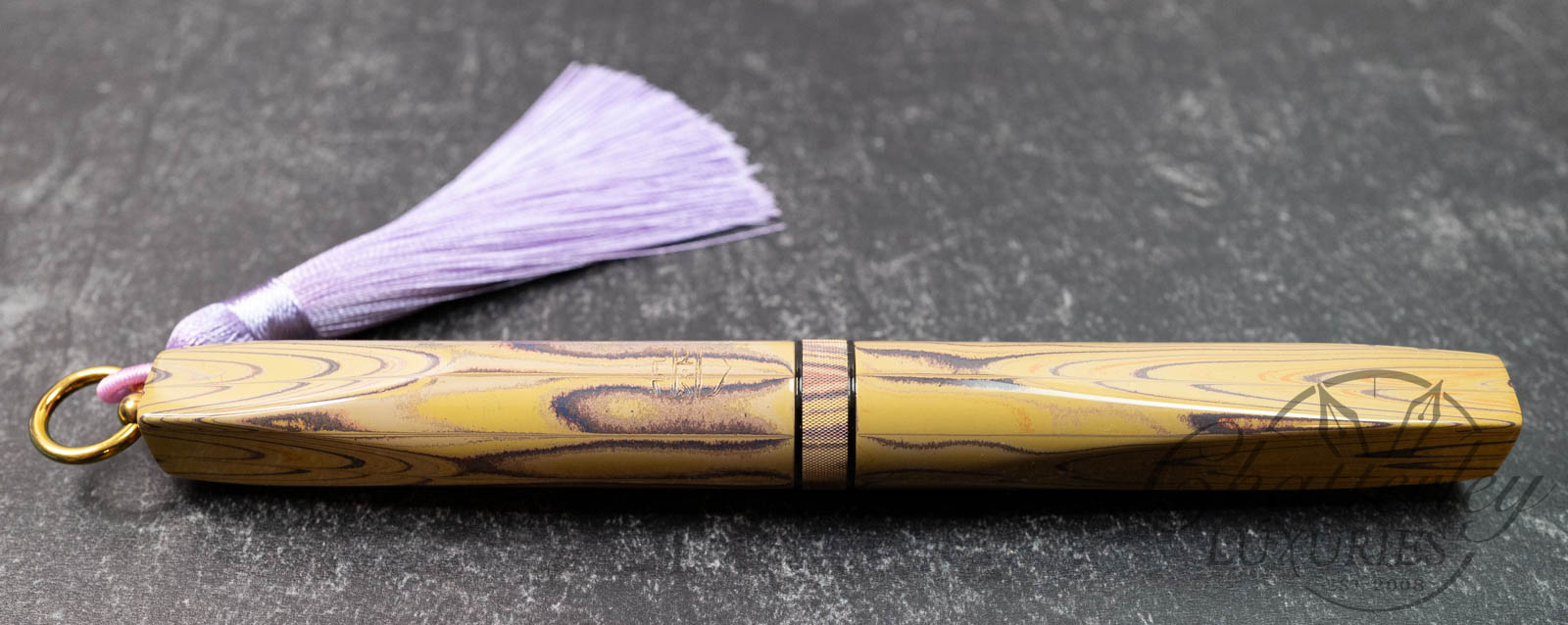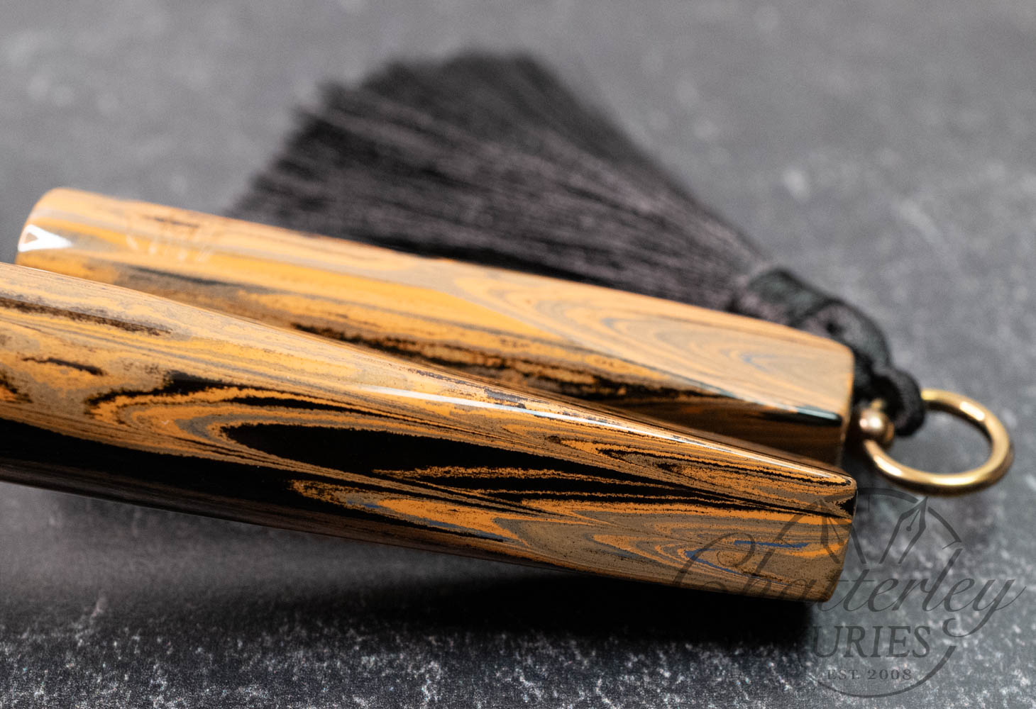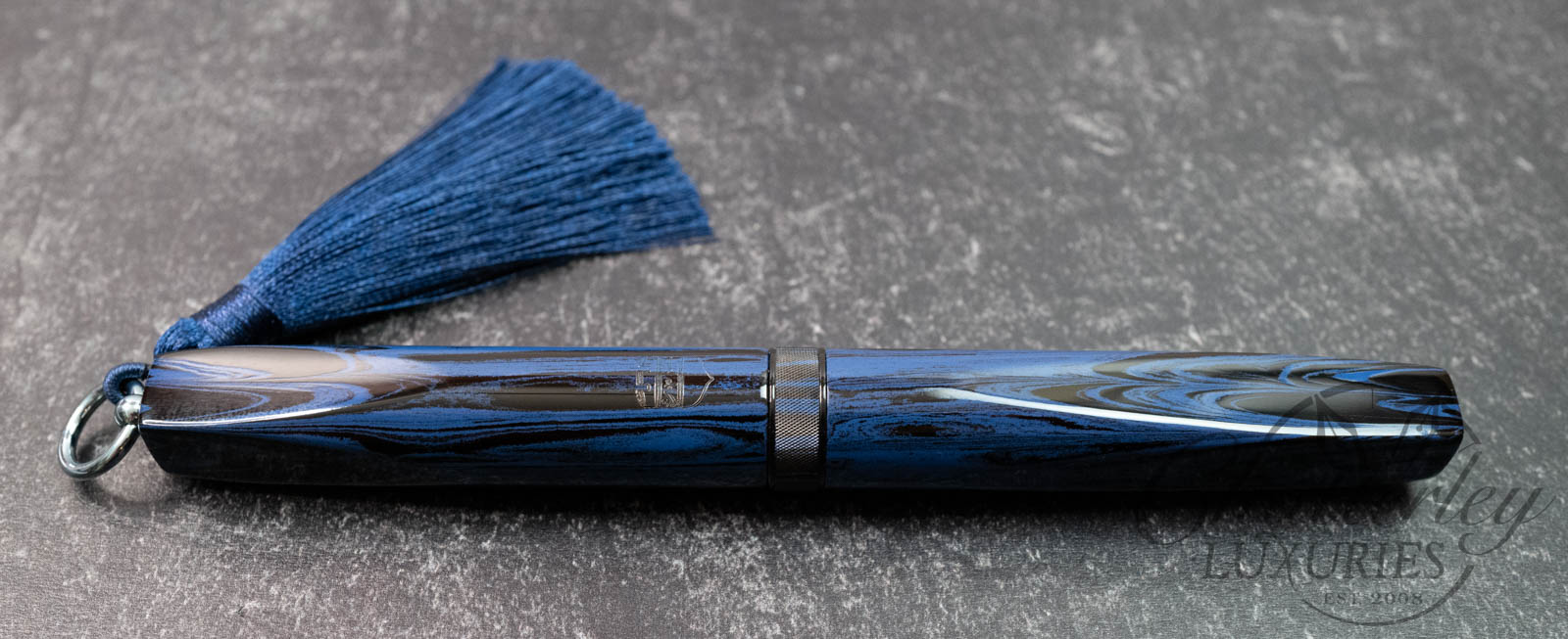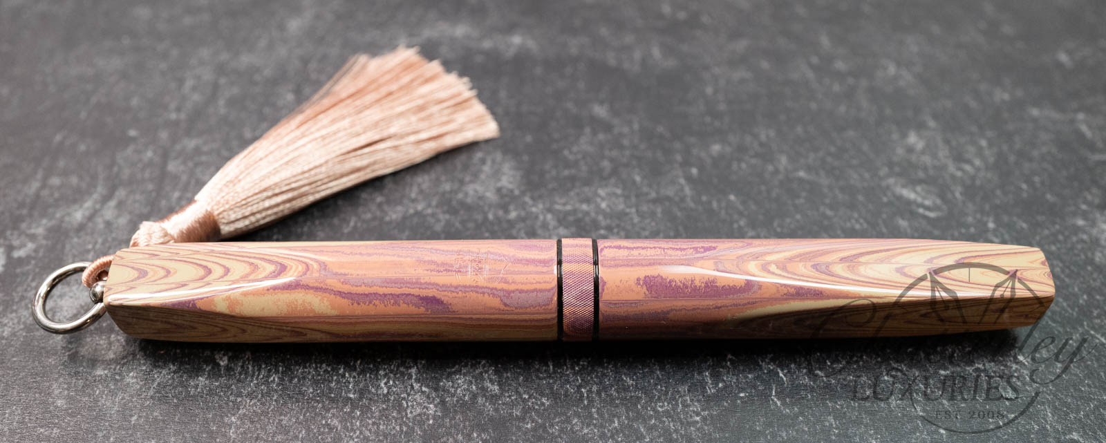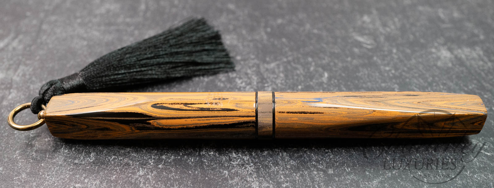 Trim details are executed to the same standard: removable top-cap rings are hand-made in Arkansas from custom titanium rings and heat-treated for color. The middle ring is hand-carved and knurled from matching ebonite, with additional rings finished in polished black ebonite. Tassels are hand-crafted in the U.S., made in Pennsylvania.