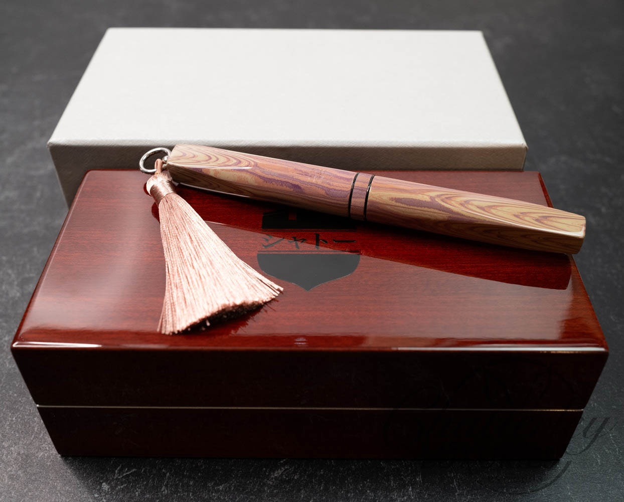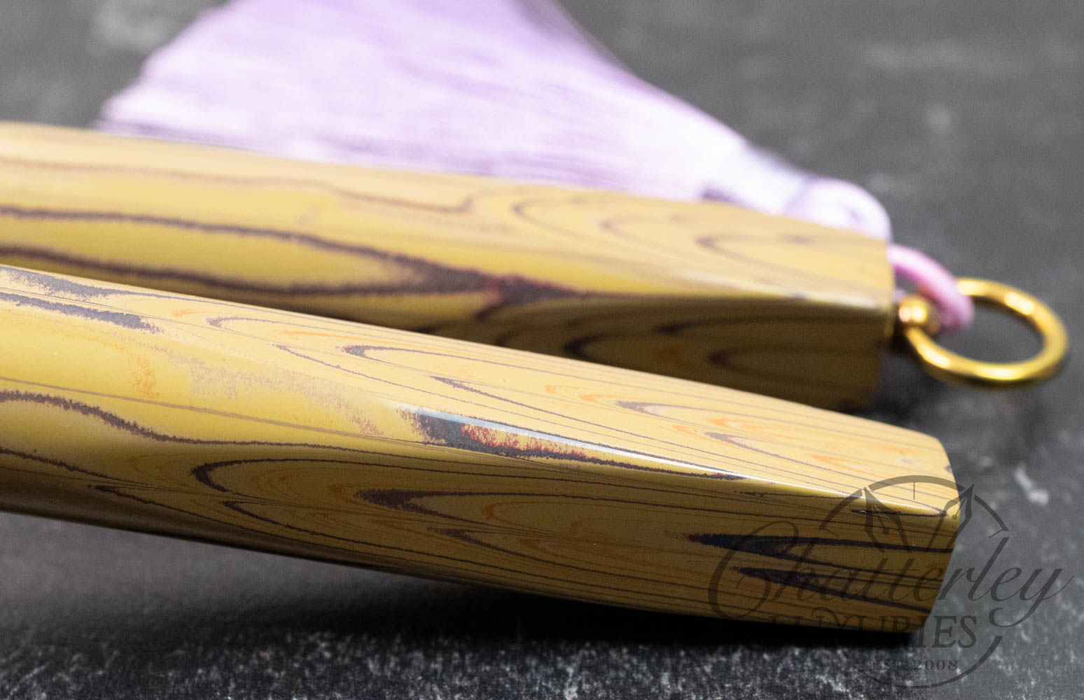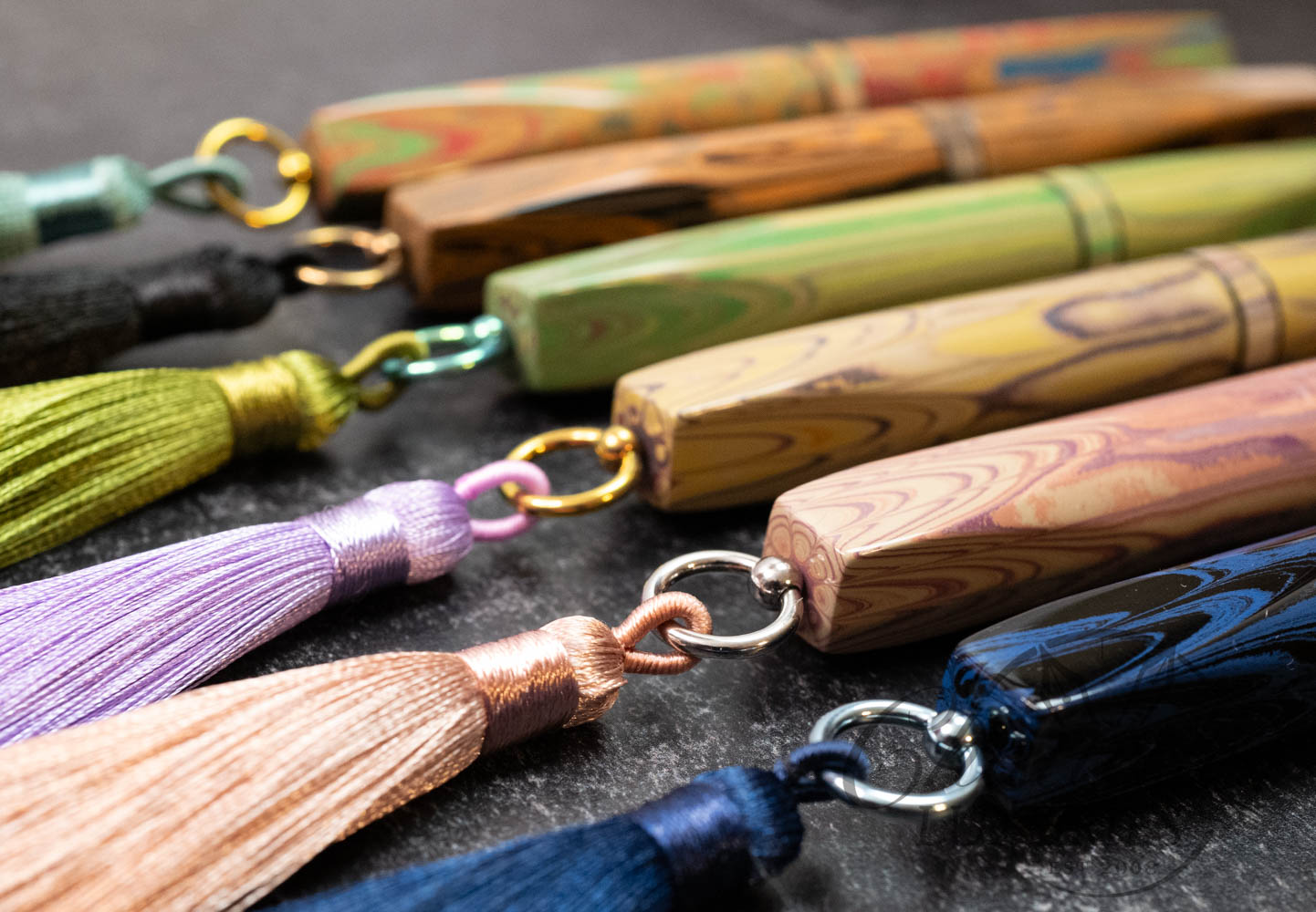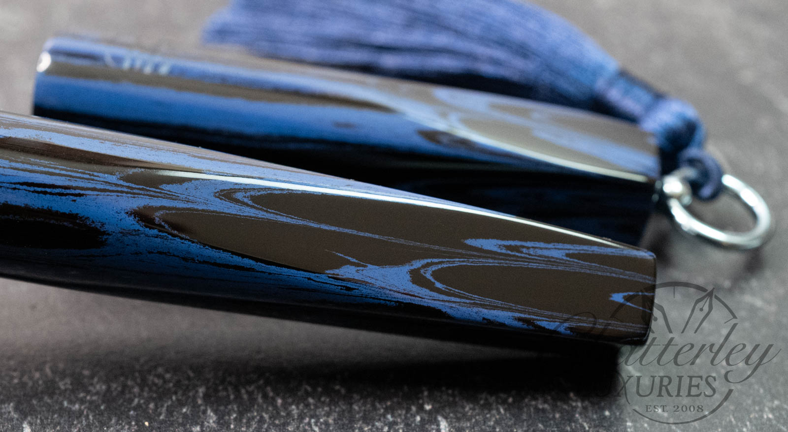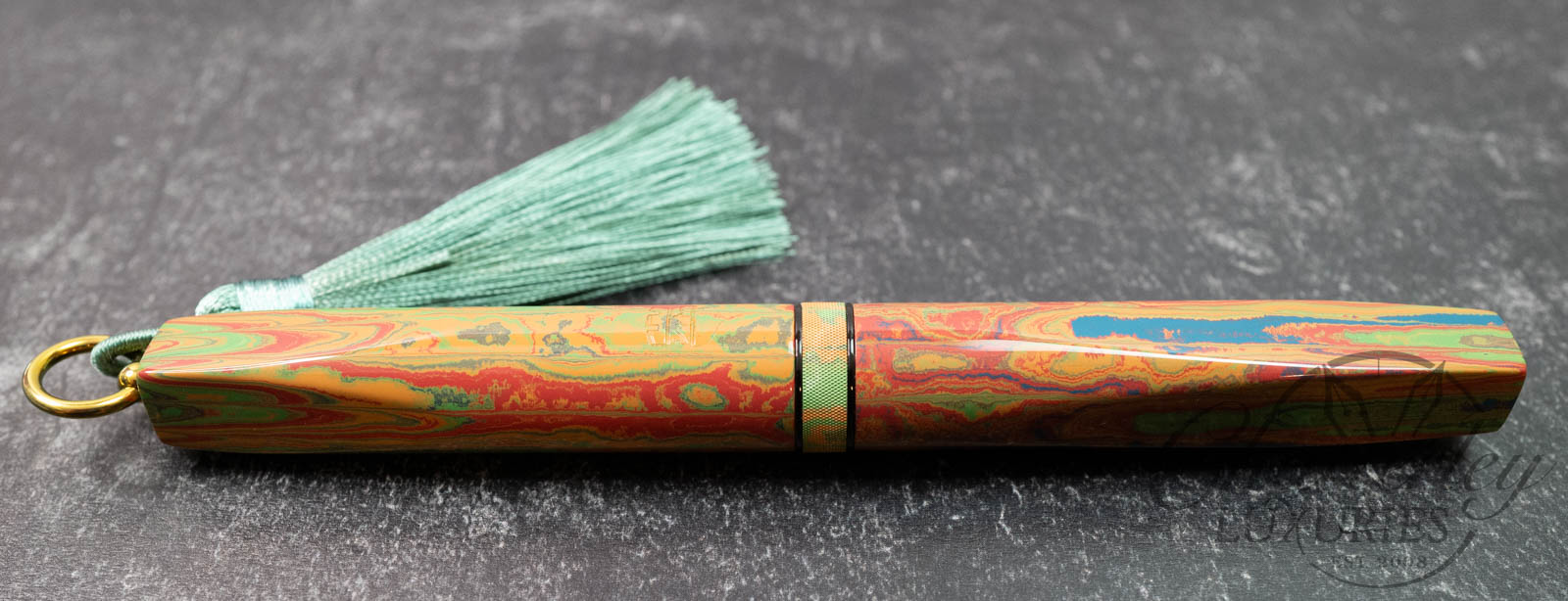 Trim details are executed to the same standard: removable top-cap rings are hand-made in Arkansas from custom titanium rings and heat-treated for color. The middle ring is hand-carved and knurled from matching ebonite, with additional rings finished in polished black ebonite. Tassels are hand-crafted in the U.S., made in Pennsylvania.