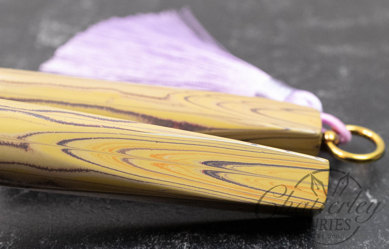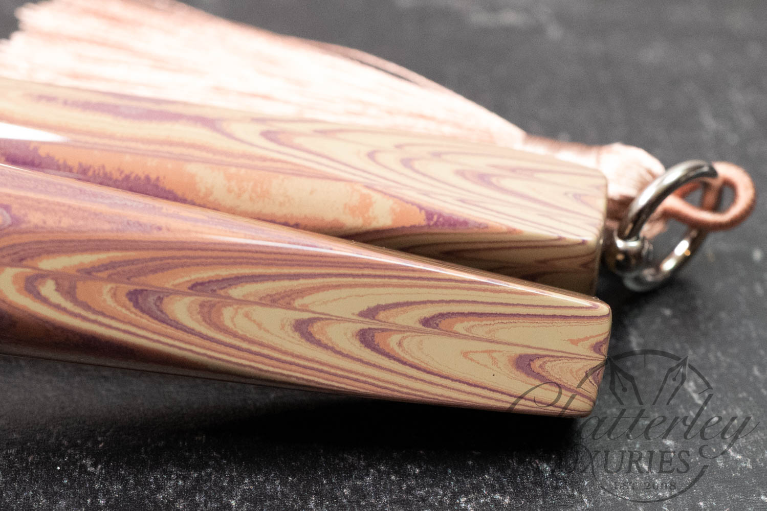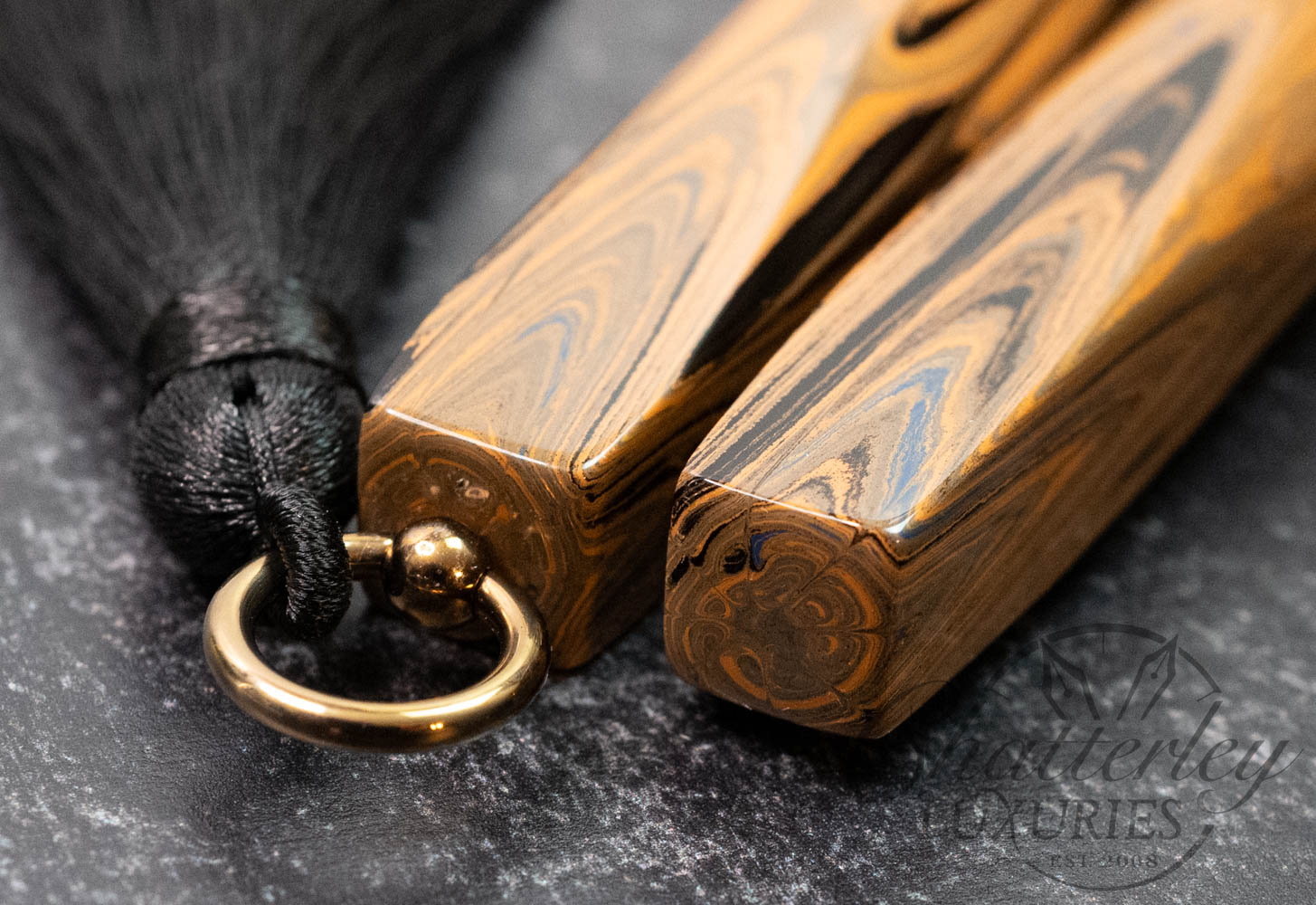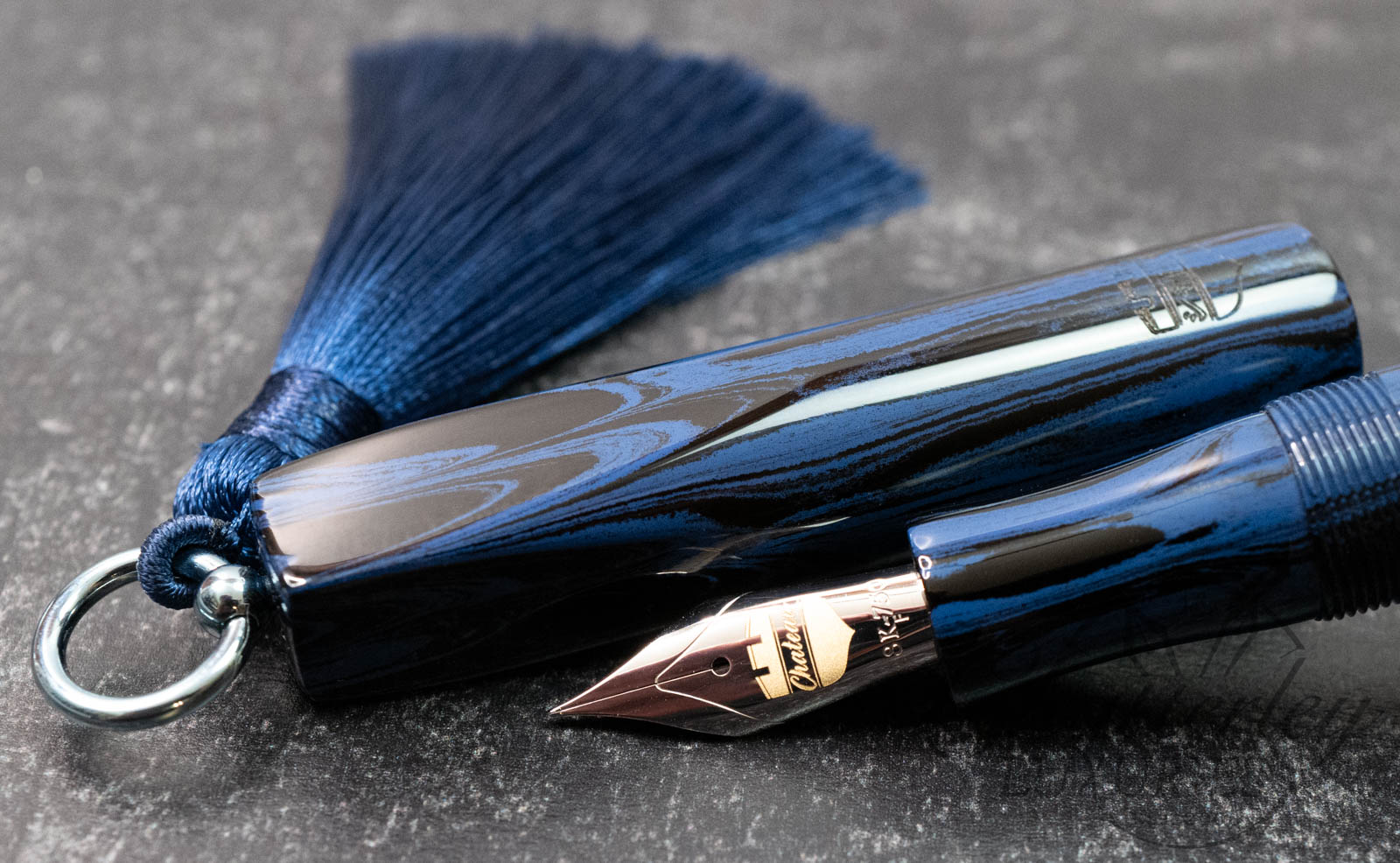 Trim details are executed to the same standard: removable top-cap rings are hand-made in Arkansas from custom titanium rings and heat-treated for color. The middle ring is hand-carved and knurled from matching ebonite, with additional rings finished in polished black ebonite. Tassels are hand-crafted in the U.S., made in Pennsylvania.