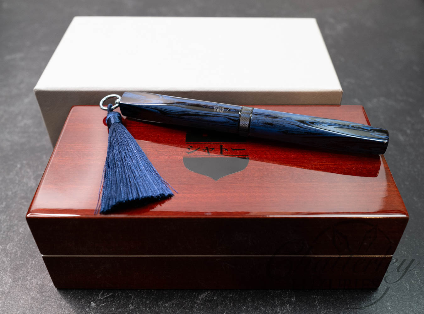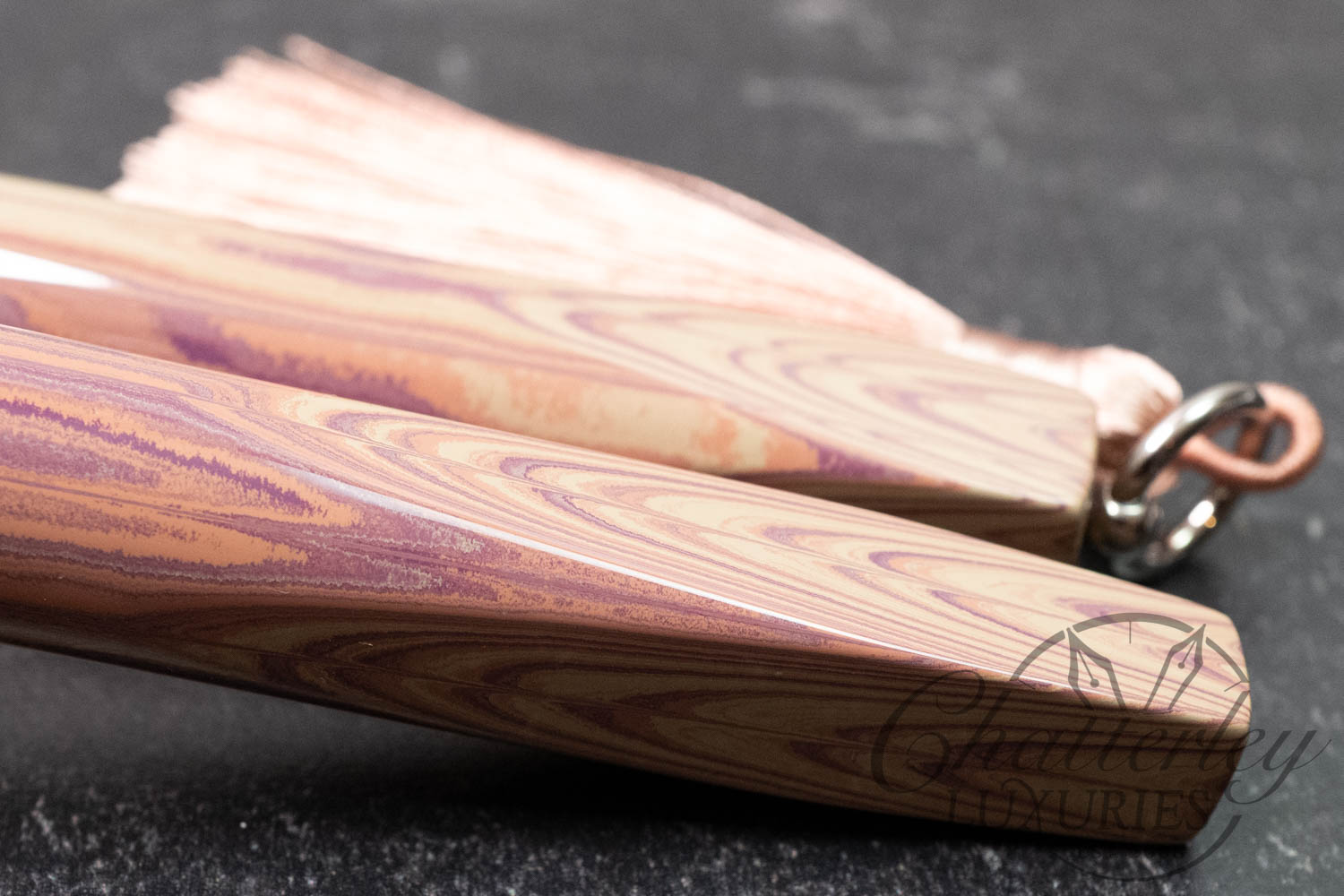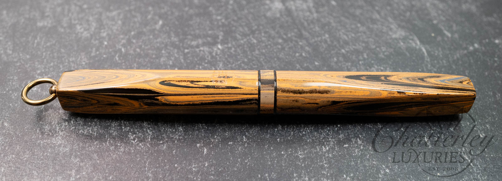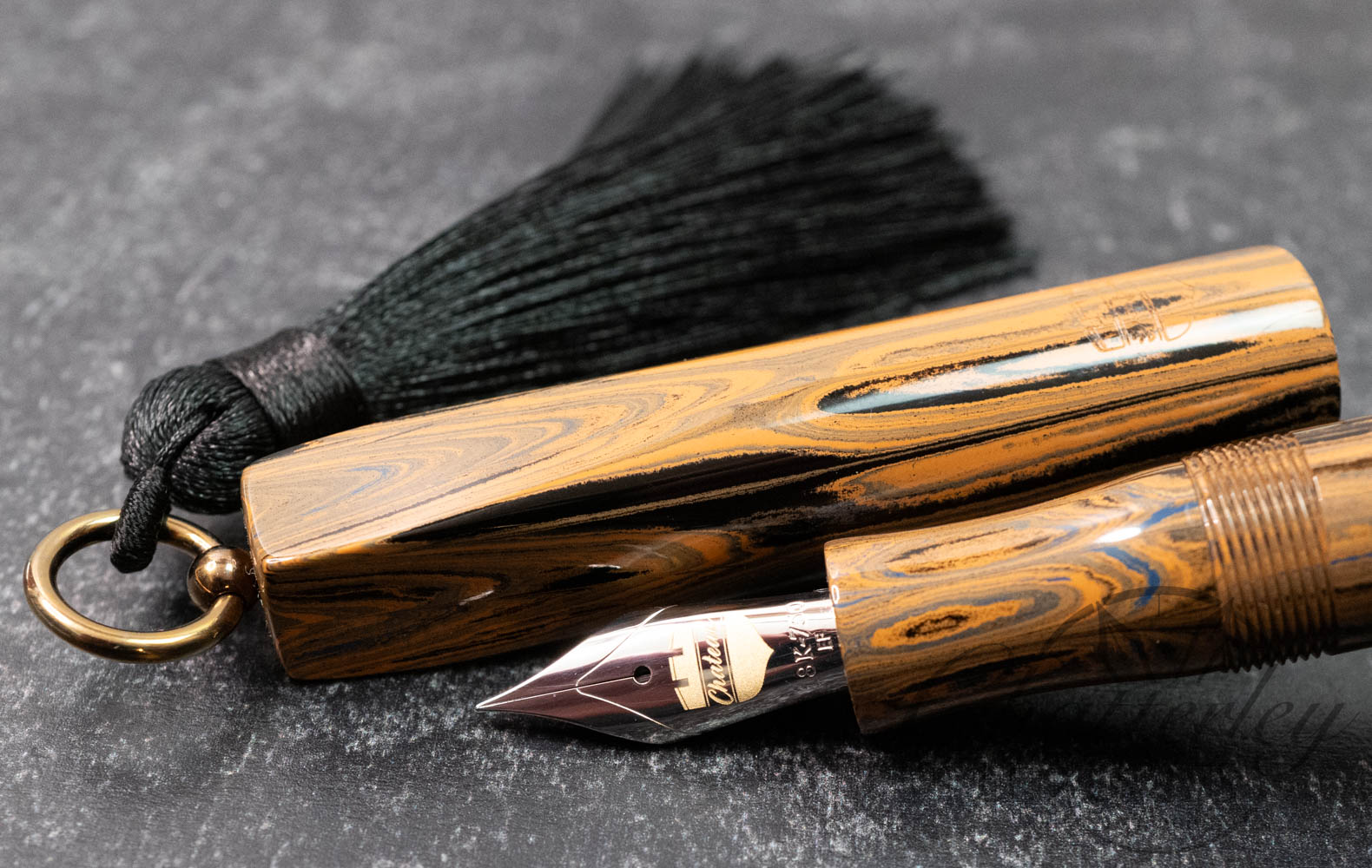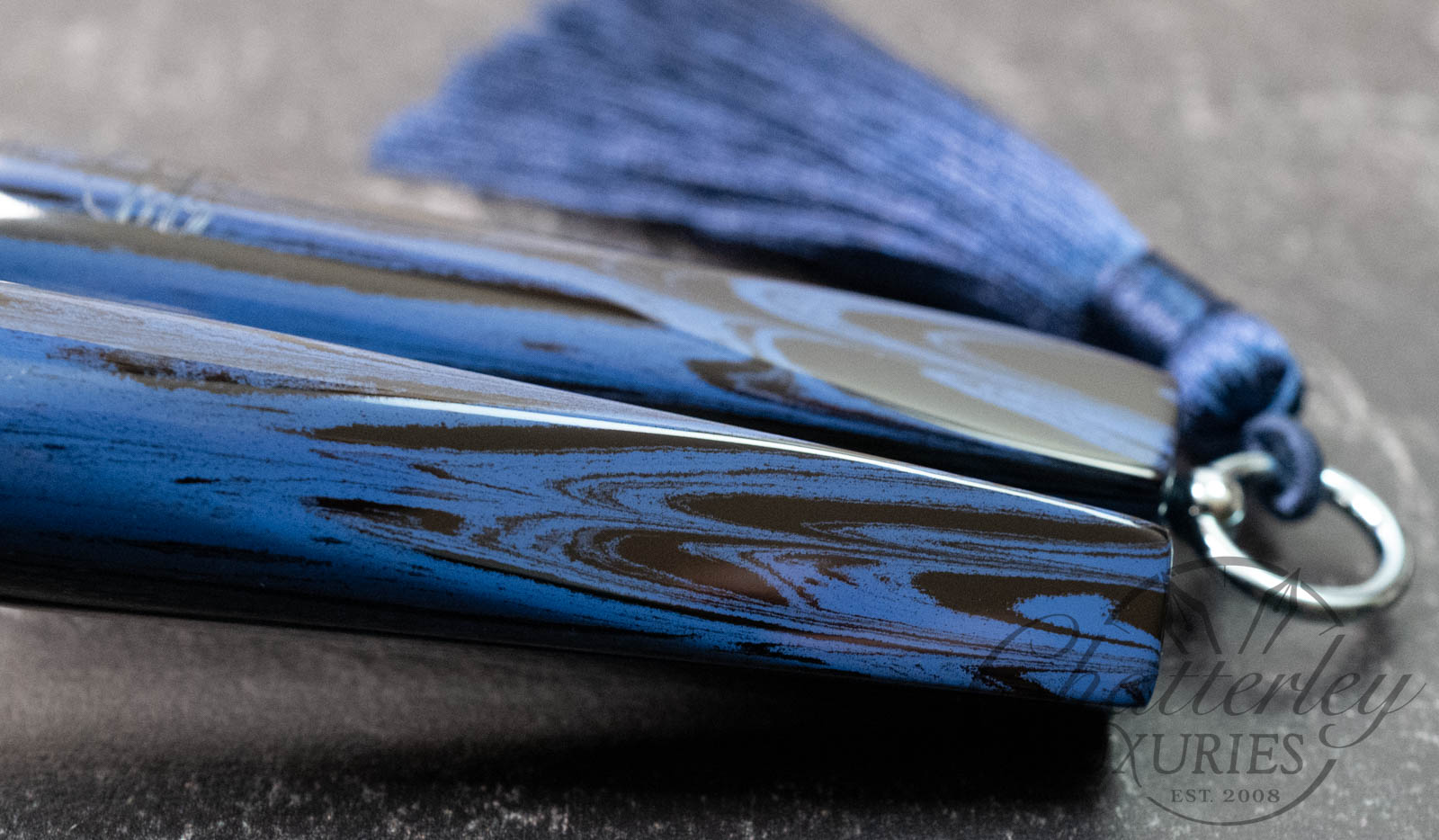 Trim details are executed to the same standard: removable top-cap rings are hand-made in Arkansas from custom titanium rings and heat-treated for color. The middle ring is hand-carved and knurled from matching ebonite, with additional rings finished in polished black ebonite. Tassels are hand-crafted in the U.S., made in Pennsylvania.