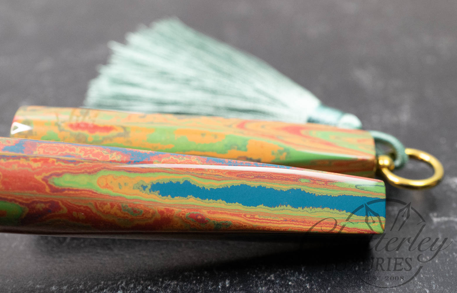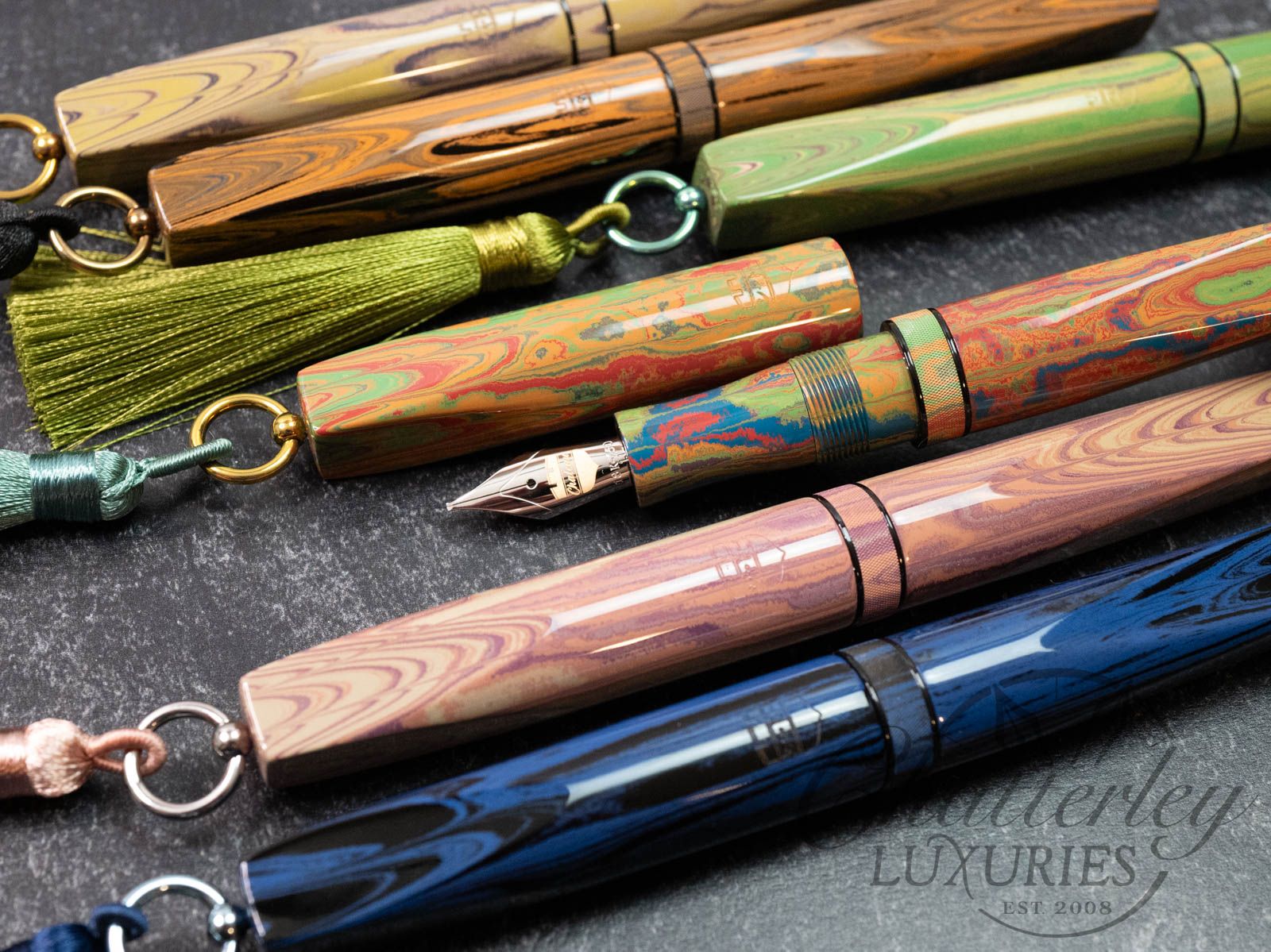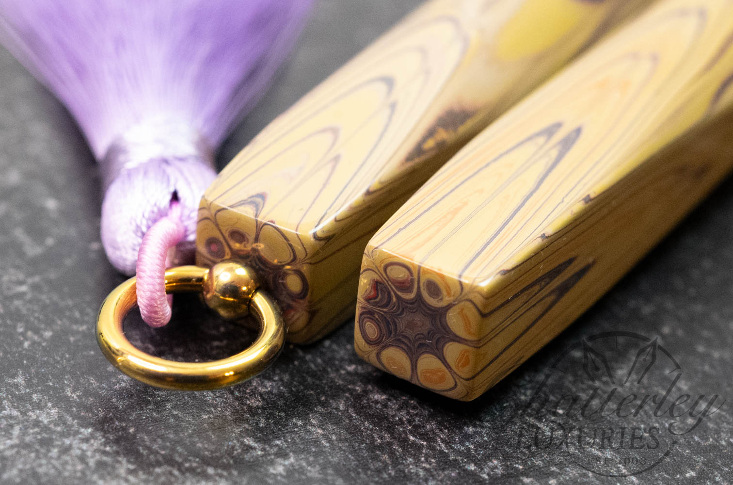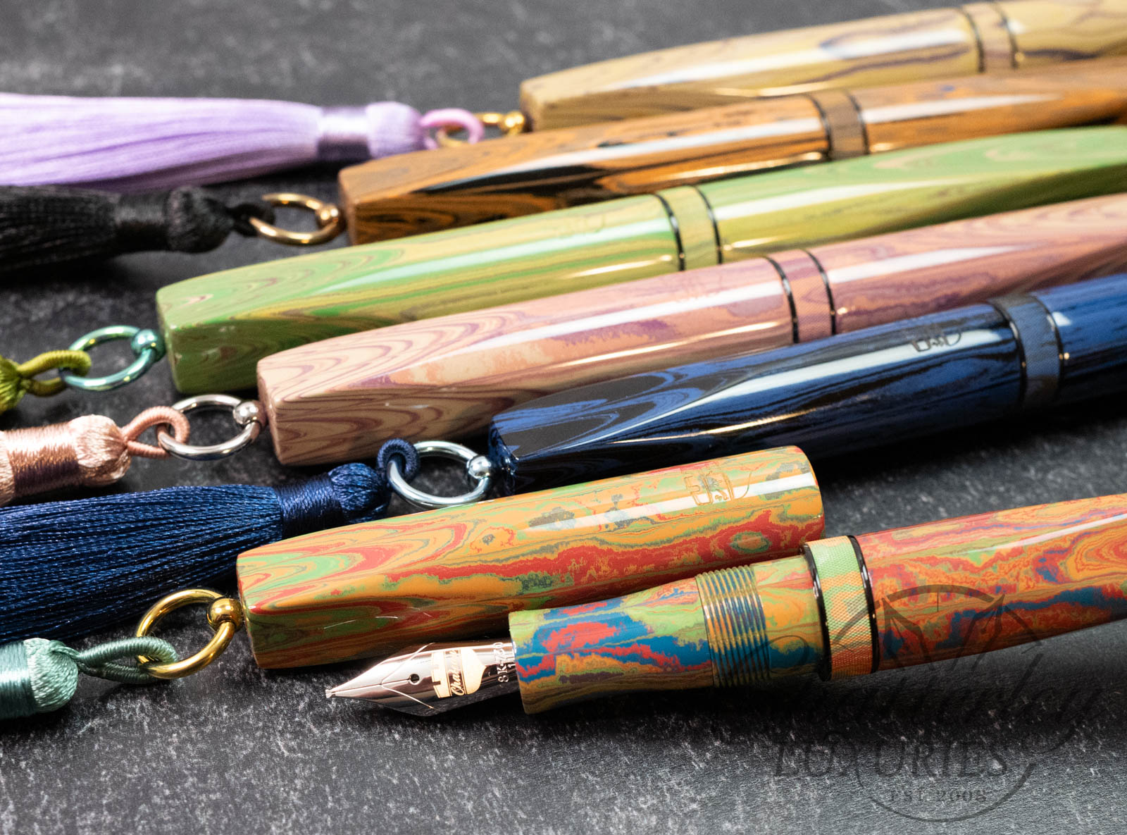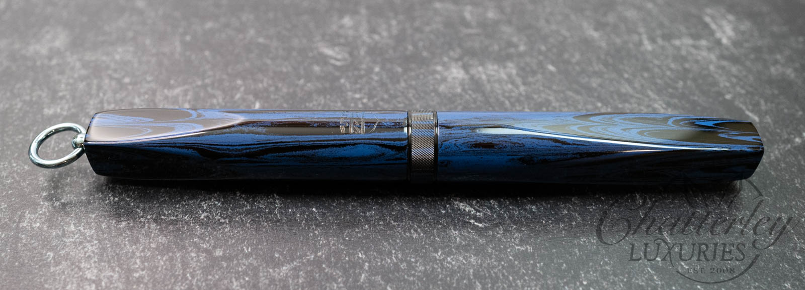 Trim details are executed to the same standard: removable top-cap rings are hand-made in Arkansas from custom titanium rings and heat-treated for color. The middle ring is hand-carved and knurled from matching ebonite, with additional rings finished in polished black ebonite. Tassels are hand-crafted in the U.S., made in Pennsylvania.
