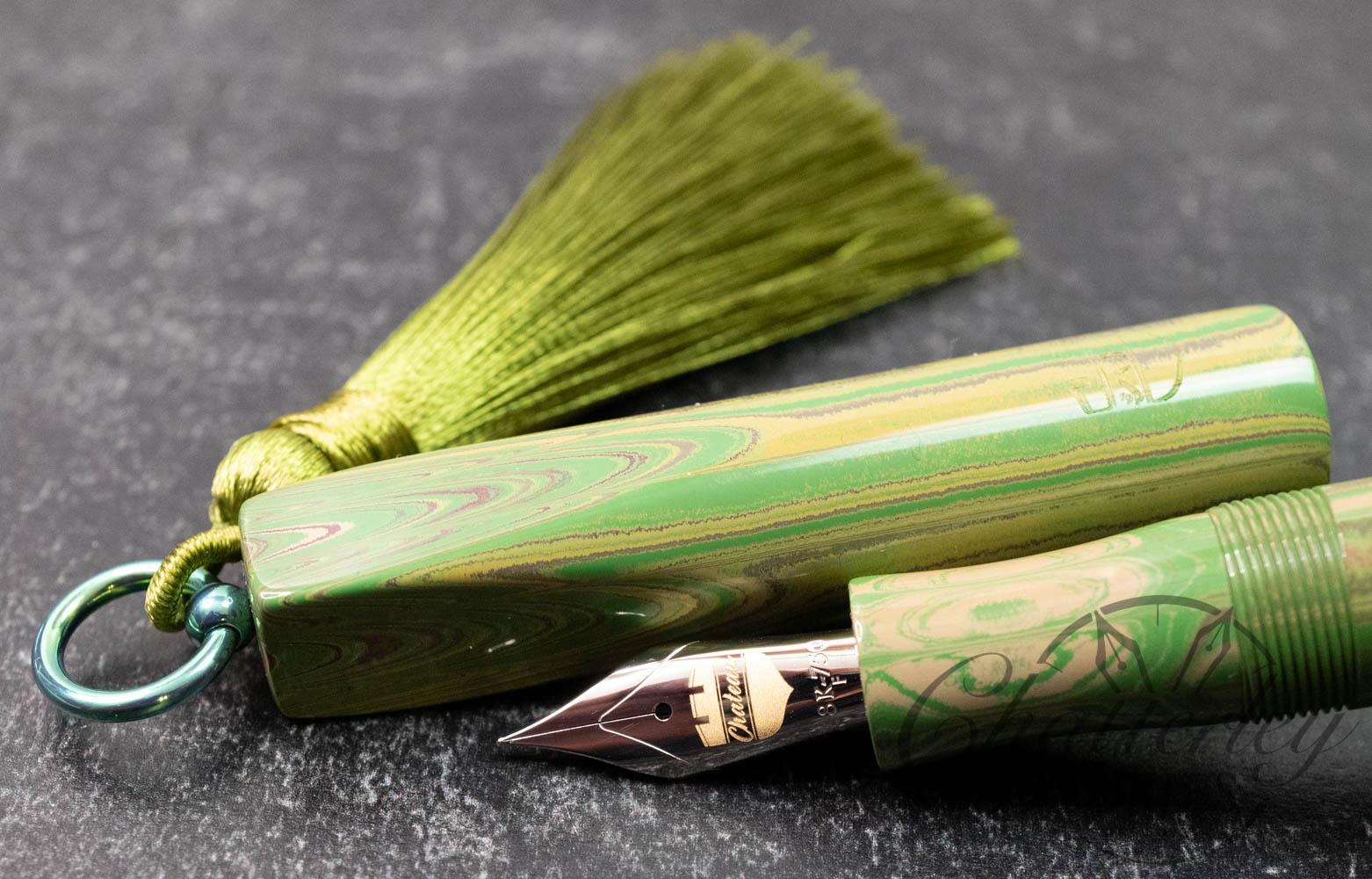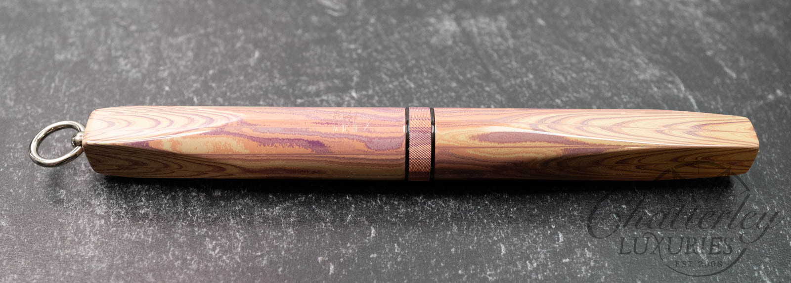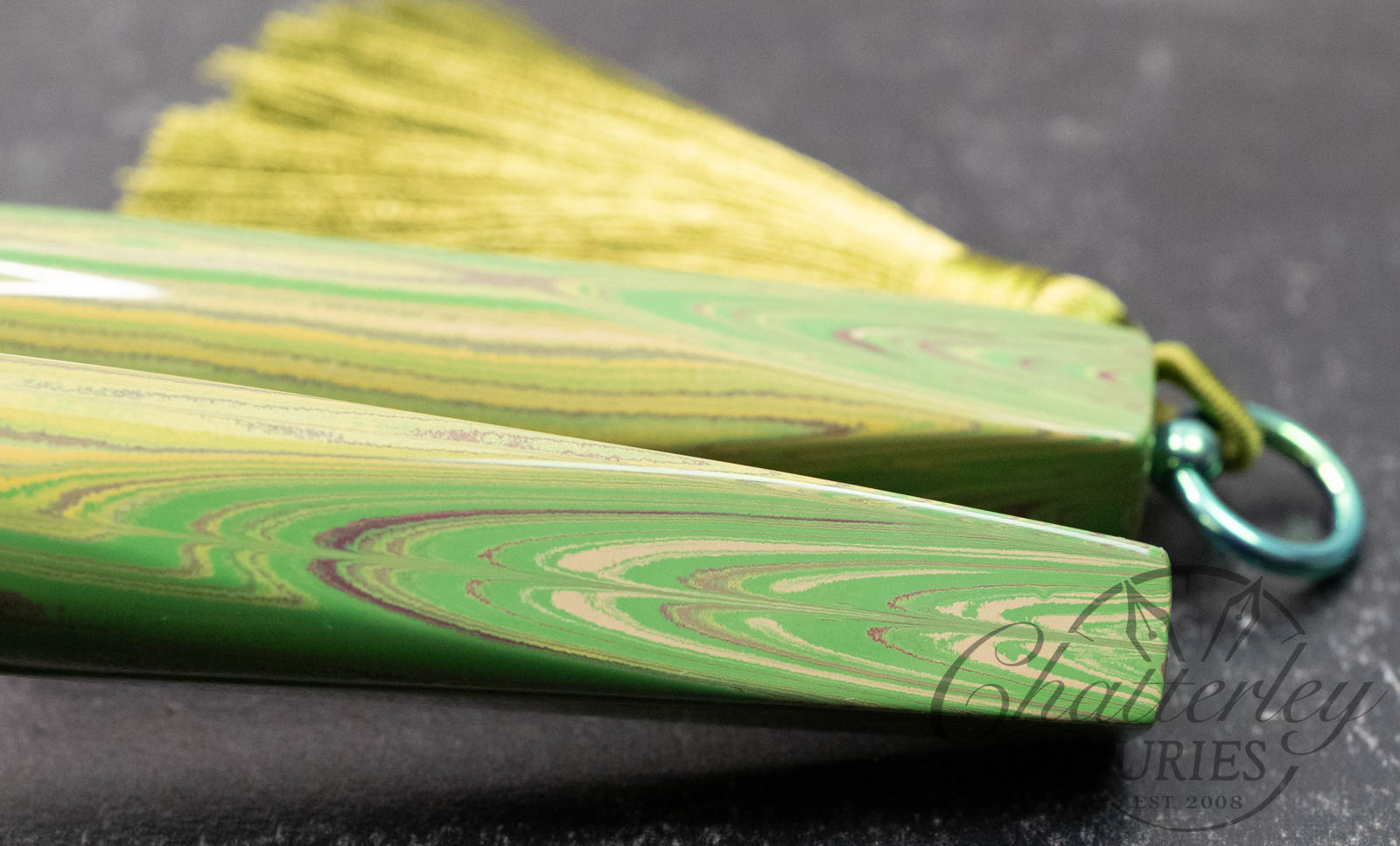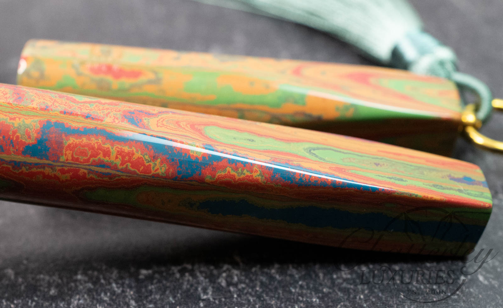 Trim details are executed to the same standard: removable top-cap rings are hand-made in Arkansas from custom titanium rings and heat-treated for color. The middle ring is hand-carved and knurled from matching ebonite, with additional rings finished in polished black ebonite. Tassels are hand-crafted in the U.S., made in Pennsylvania.