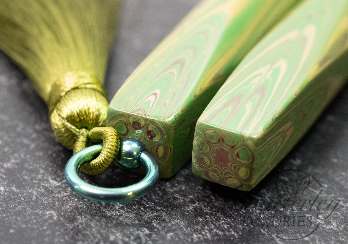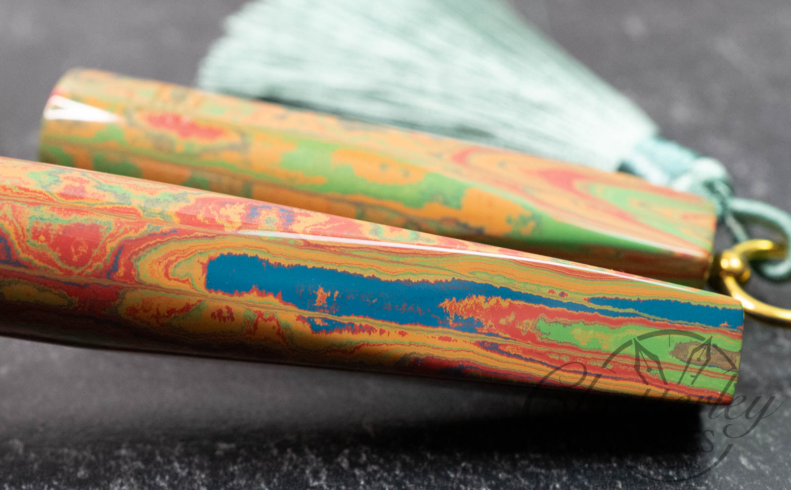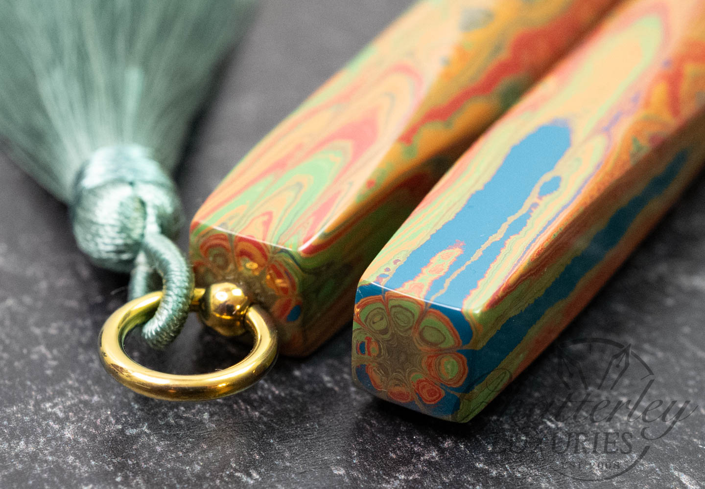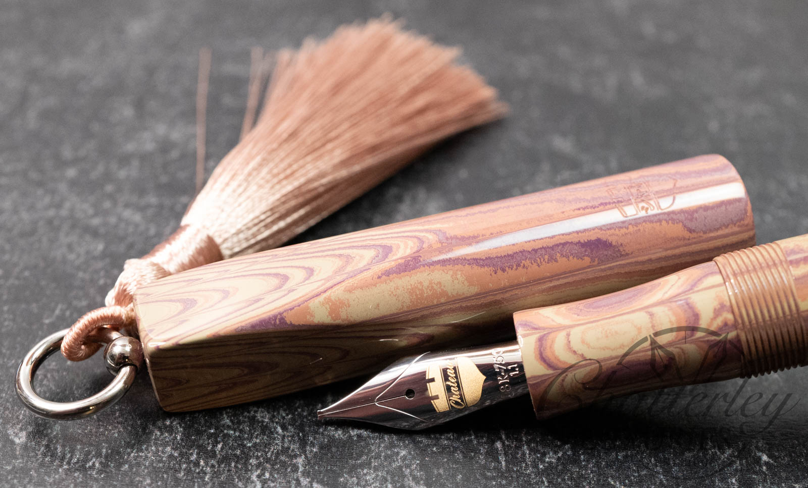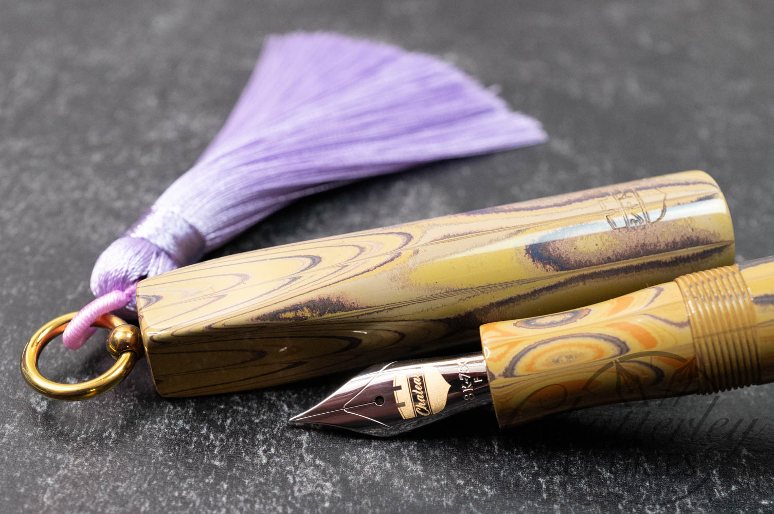 Trim details are executed to the same standard: removable top-cap rings are hand-made in Arkansas from custom titanium rings and heat-treated for color. The middle ring is hand-carved and knurled from matching ebonite, with additional rings finished in polished black ebonite. Tassels are hand-crafted in the U.S., made in Pennsylvania.