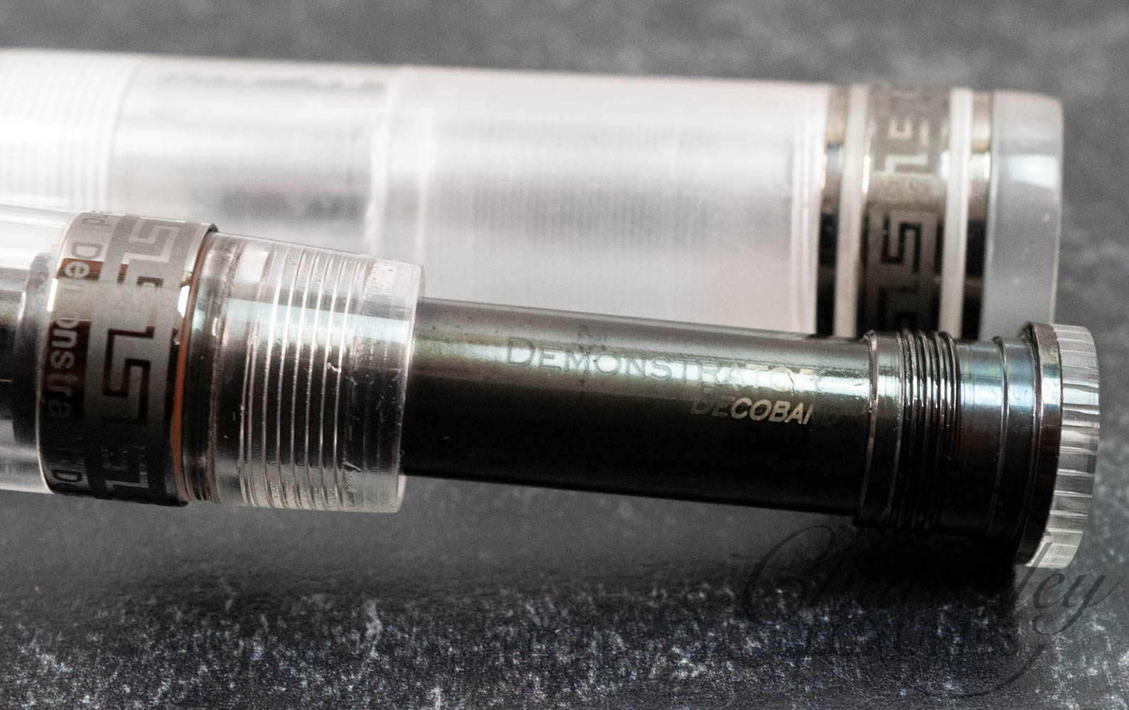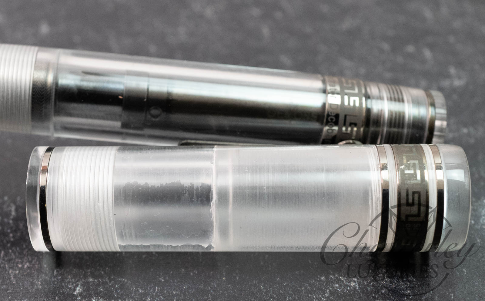 The parts prior to assembly are polished by using a polishing machine. But this only polishes the outside of the pen. So with 99% of the pens out there once this is done, there is just a final hand polish after assembly to ensure no scratches happen during assembly. But with the hand turned clear pens, this is not possible since they need to be polished on the inside. So every pen part has be hand polished on the inside, piece by meticulous piece. This is a very long process and makes these pens very unique.