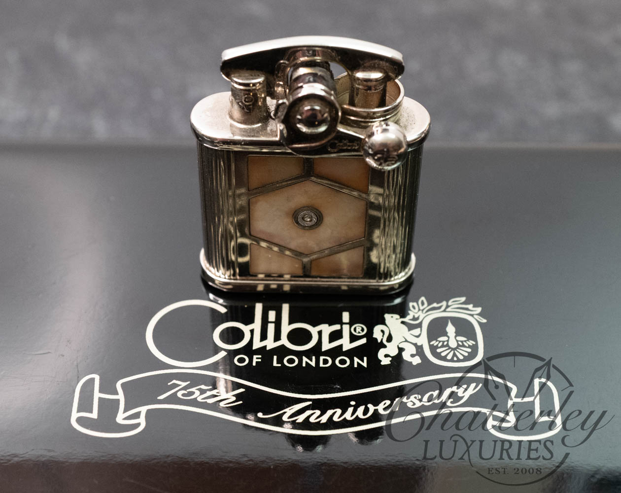 Colibri of London presents their Diamond 75th Anniversary Limited Edition Lighter crafted with Mother of Pearl and platinum plated trim. Made in Japan.