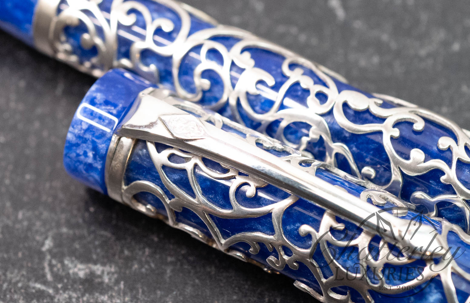 The Chatsworth Collection is a new overlay design commissioned for Conway Stewart by award winning artist Henry Simpole. This is by far the most detailed and intricate filigree design to date for Conway Stewart by Simpole, and for the first time we are making the Chatsworth collection available on a canvas choice of three of our most popular resins: Classic Black, Blue Stardust, and Red Stardust.