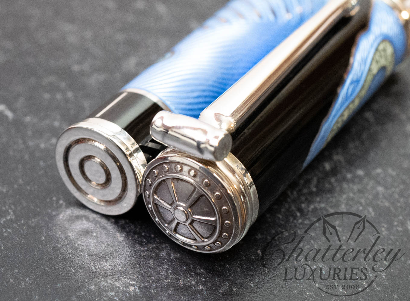 The Valhalla Collection’s unique filling system accommodates a cartridge, converter or eyedropper fill; a series of seals and “O” rings prevents the ink from leaving the chamber at any point. A roller ball version of the Trio is also available.