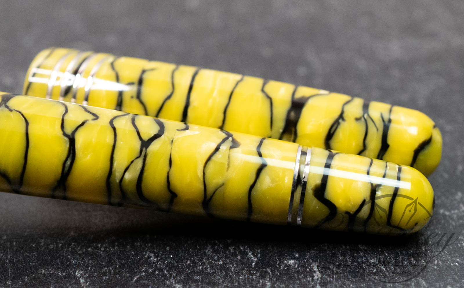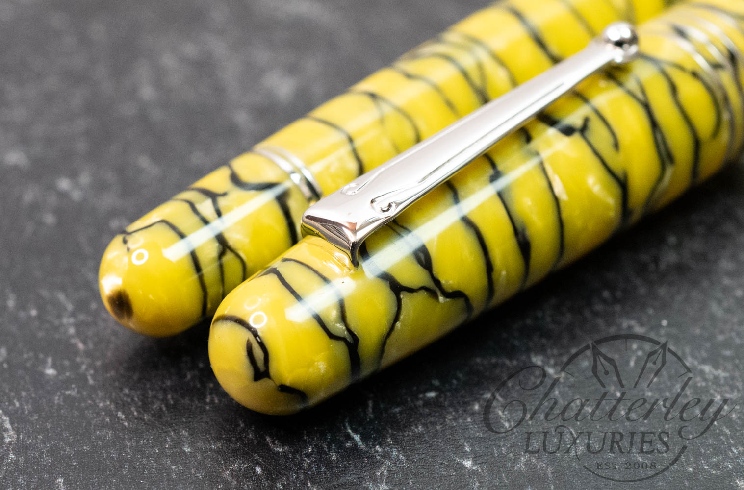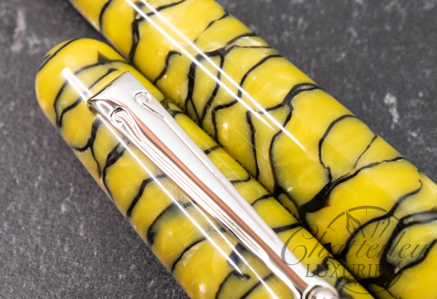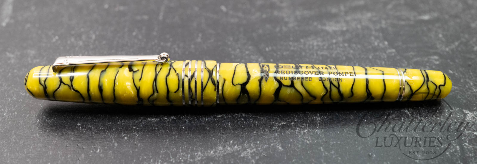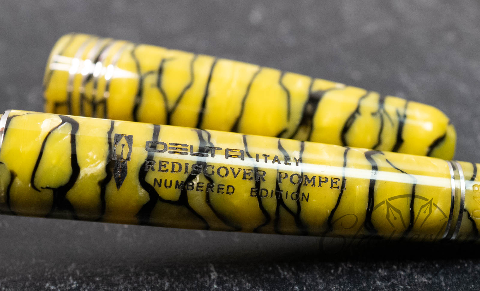 Delta Rediscover Pompeii 2025 is a numbered limited-edition fountain pen in yellow-and-black celluloid, created as a deliberate nod to Pompeii’s rediscovered color history—drawing from the original yellow ocher tones revealed through archaeological research.