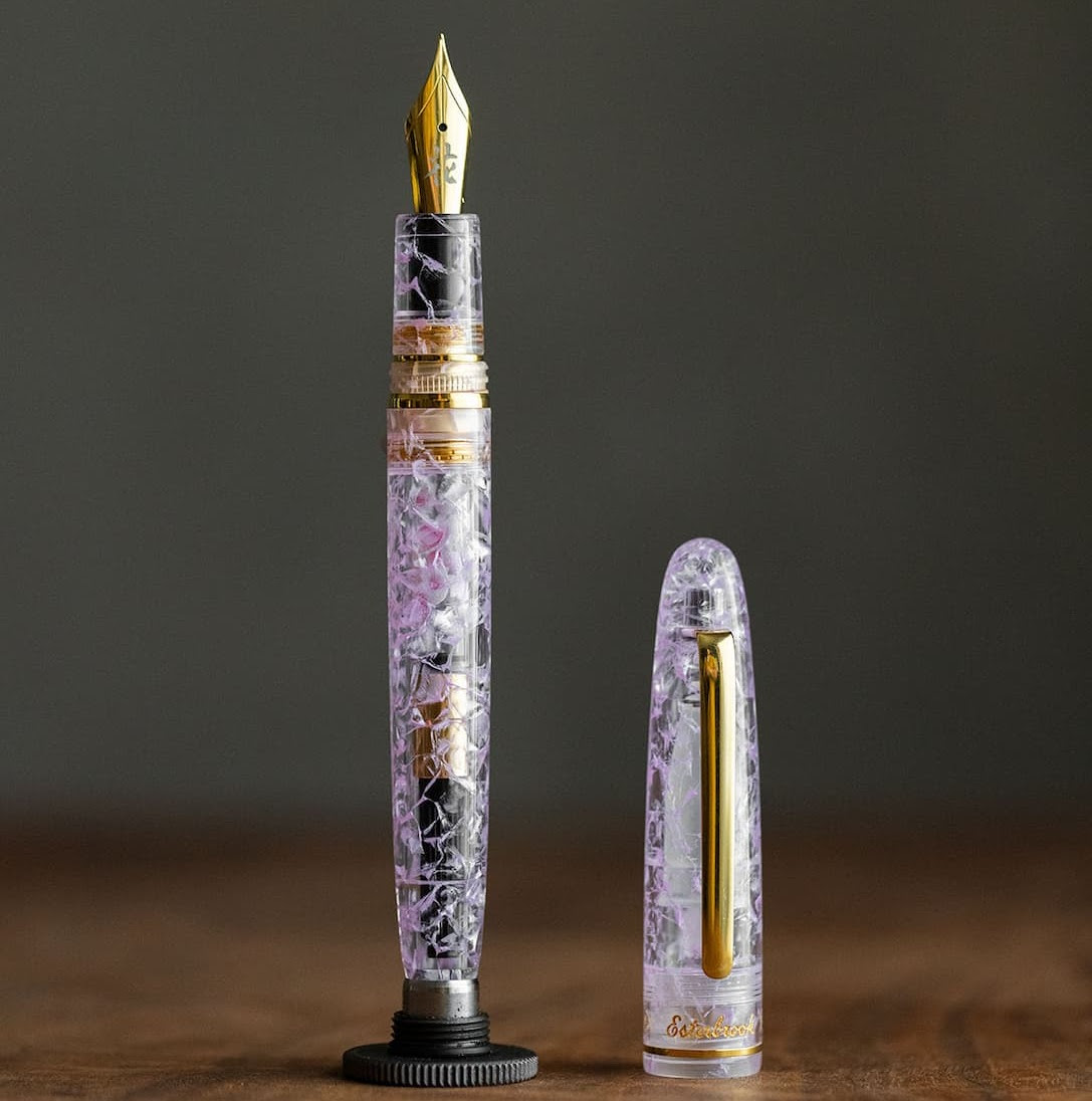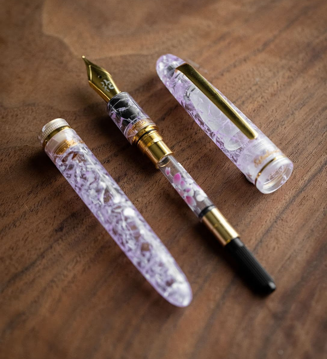 Please note: The Kachofugetsu Flower Estie does not come with the cushion-cap closer, so may feel slightly different than your other Esties. It still has the proper seal to keep your nib wet, but the spring-action may not be felt on this pen.