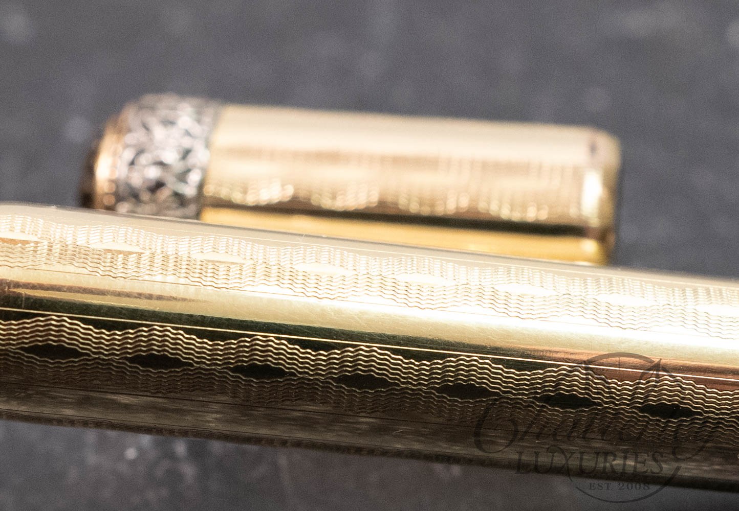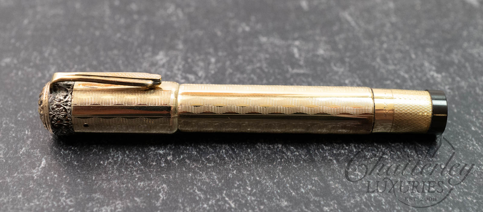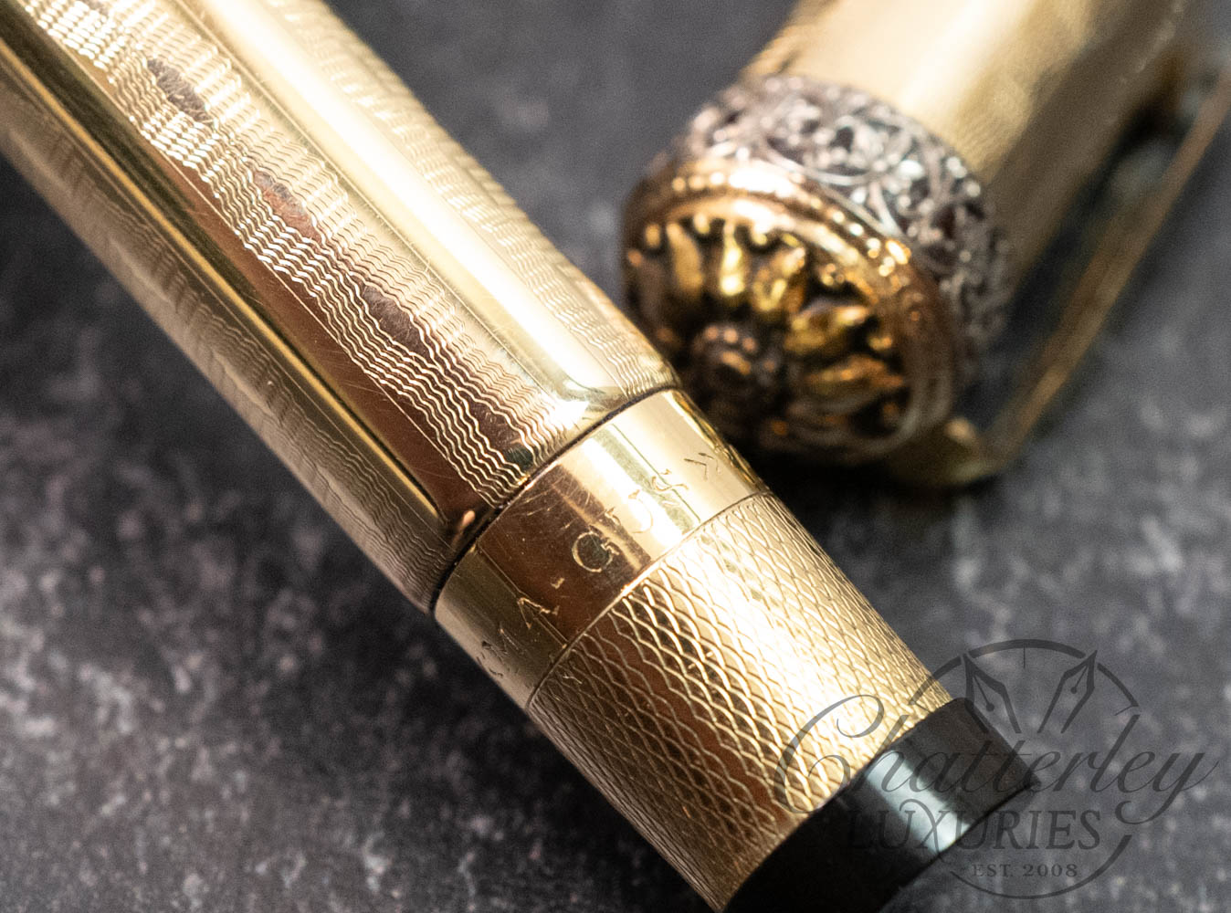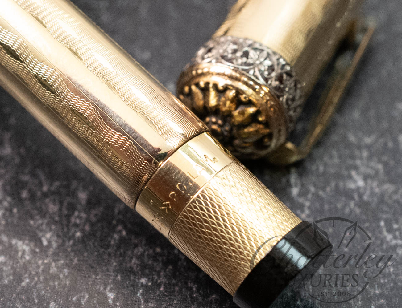 This vintage pen is close to 100 years old, it has seen regular use and shows signs of having been lovingly owned through the years. It is equipped with a 14k Fine nib and fills via Eye Dropper. The trim, cap and body are rolled 18ct gold. (Writing Sample at the bottom)