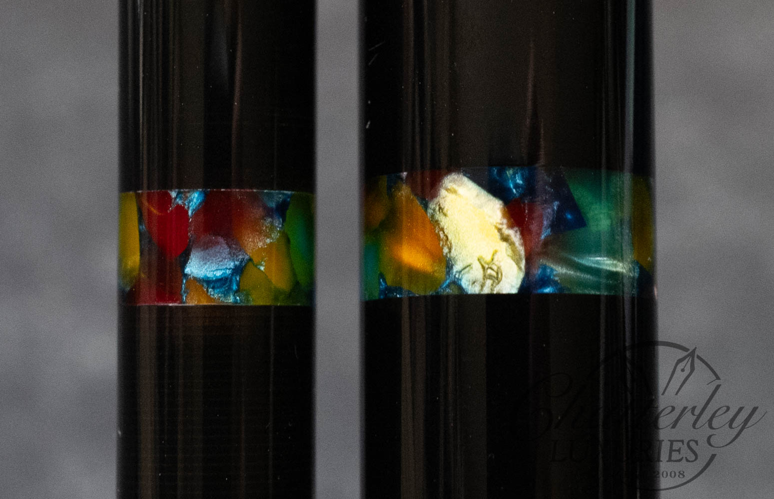 ♦ The 33 is made from solid bars of acrylic, machined in out shop with great care. This edition comes in black with Cathedral bands (colors of blues, reds, green & yellow).