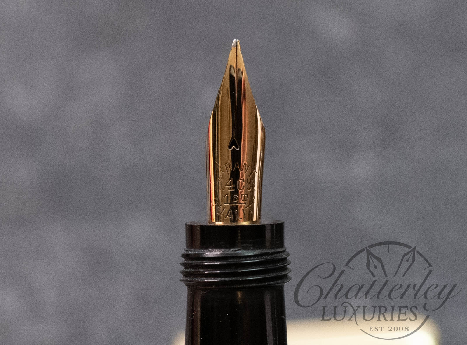 This vintage pen is close to 100 years old, it has seen regular use and shows signs of having been lovingly owned through the years. There is noticeable oxidation occurring on the cap and portions of the trim. It is equipped with a 14k Fine Flex nib and fills via Eye Dropper. The gold-filled trim, cap and body are rolled 18ct gold. (Writing Sample at the bottom)