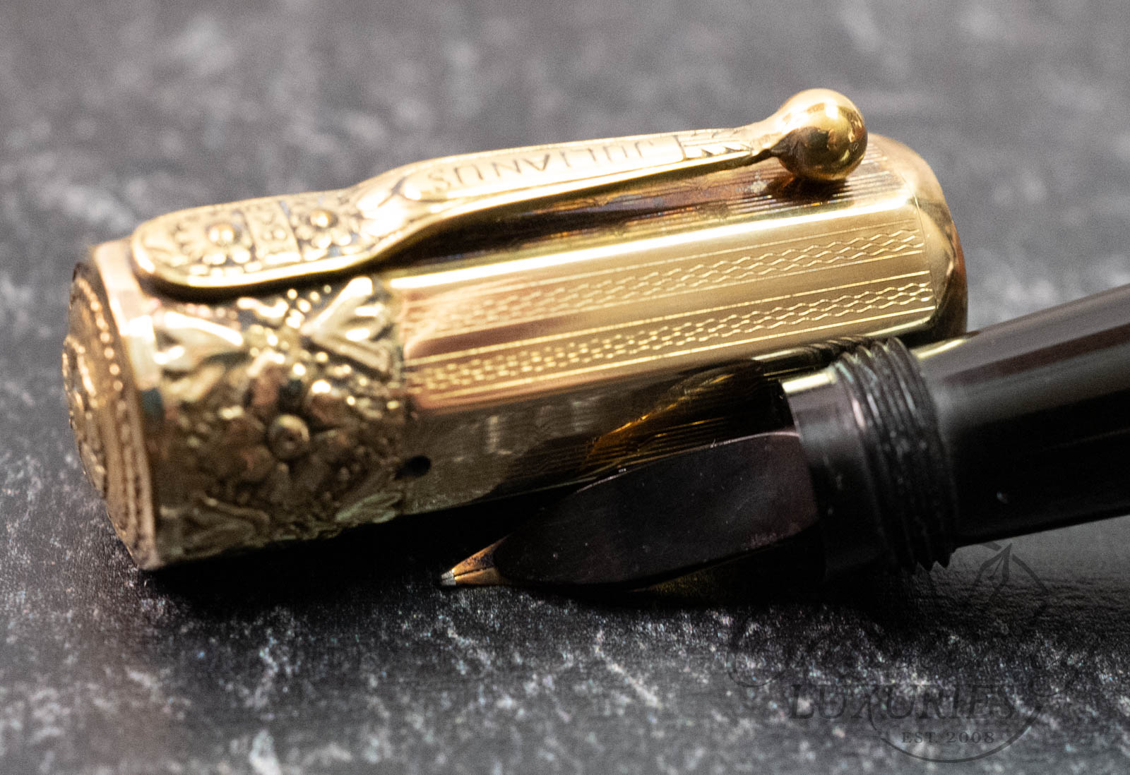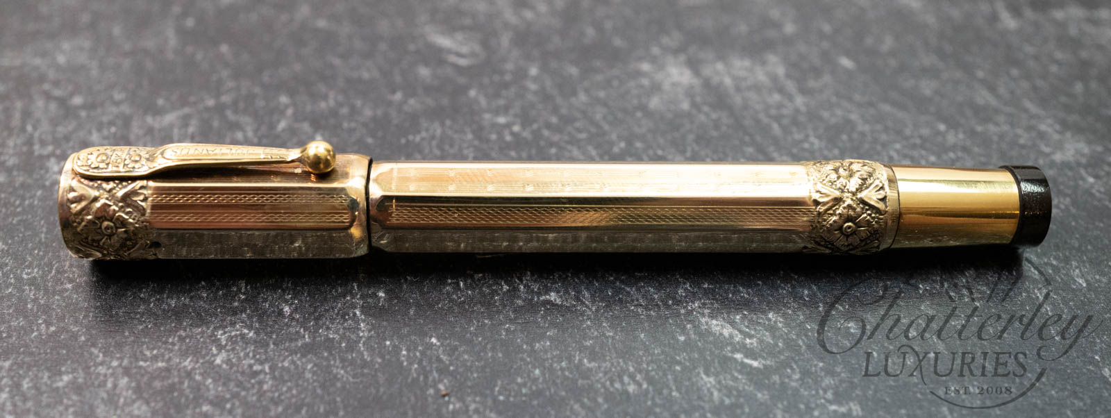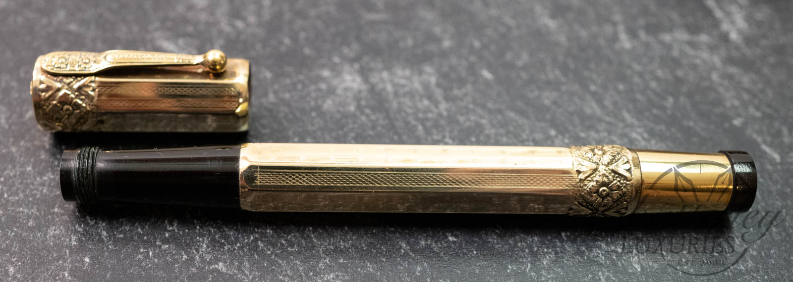 This vintage pen is close to 100 years old, it has seen regular use and shows signs of having been lovingly owned through the years. There is noticeable oxidation occurring on the cap and portions of the trim. It is equipped with a 14k Fine Flex nib and fills via Eye Dropper. The gold-filled trim, cap and body are rolled 18ct gold. (Writing Sample at the bottom)