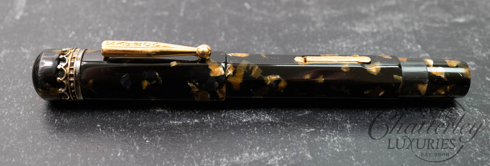 This pen is lovingly used and does not come with box or papers. It is equipped with an 18k Stub nib and fills via a Lever Filler.