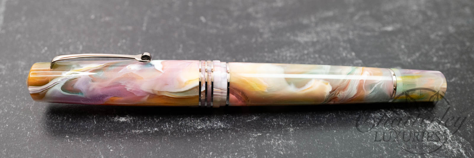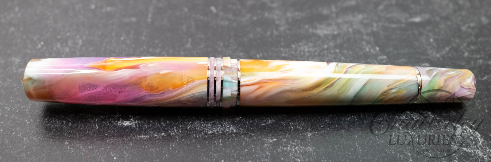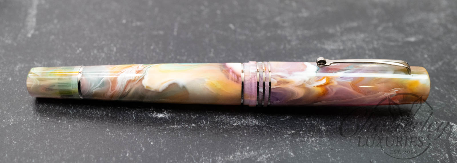 This pen is pre-owned and in near-perfect condition, it does not appear to have been inked. It comes complete with a box and papers and is equipped with a 14k Fine nib. It fills via a Piston Filling System. The pen is made using “Primary Manipulation 1” resin from Jonathan Brooks.