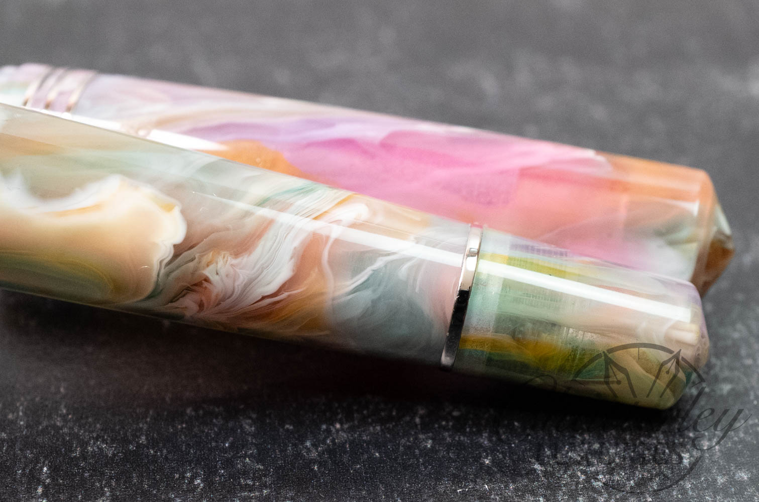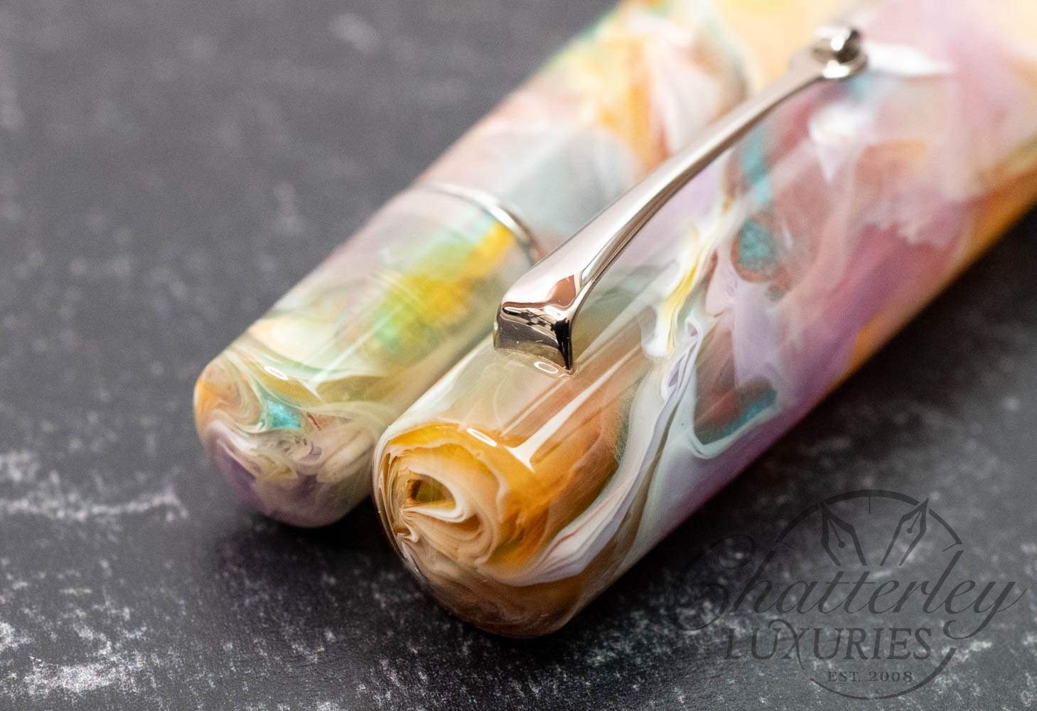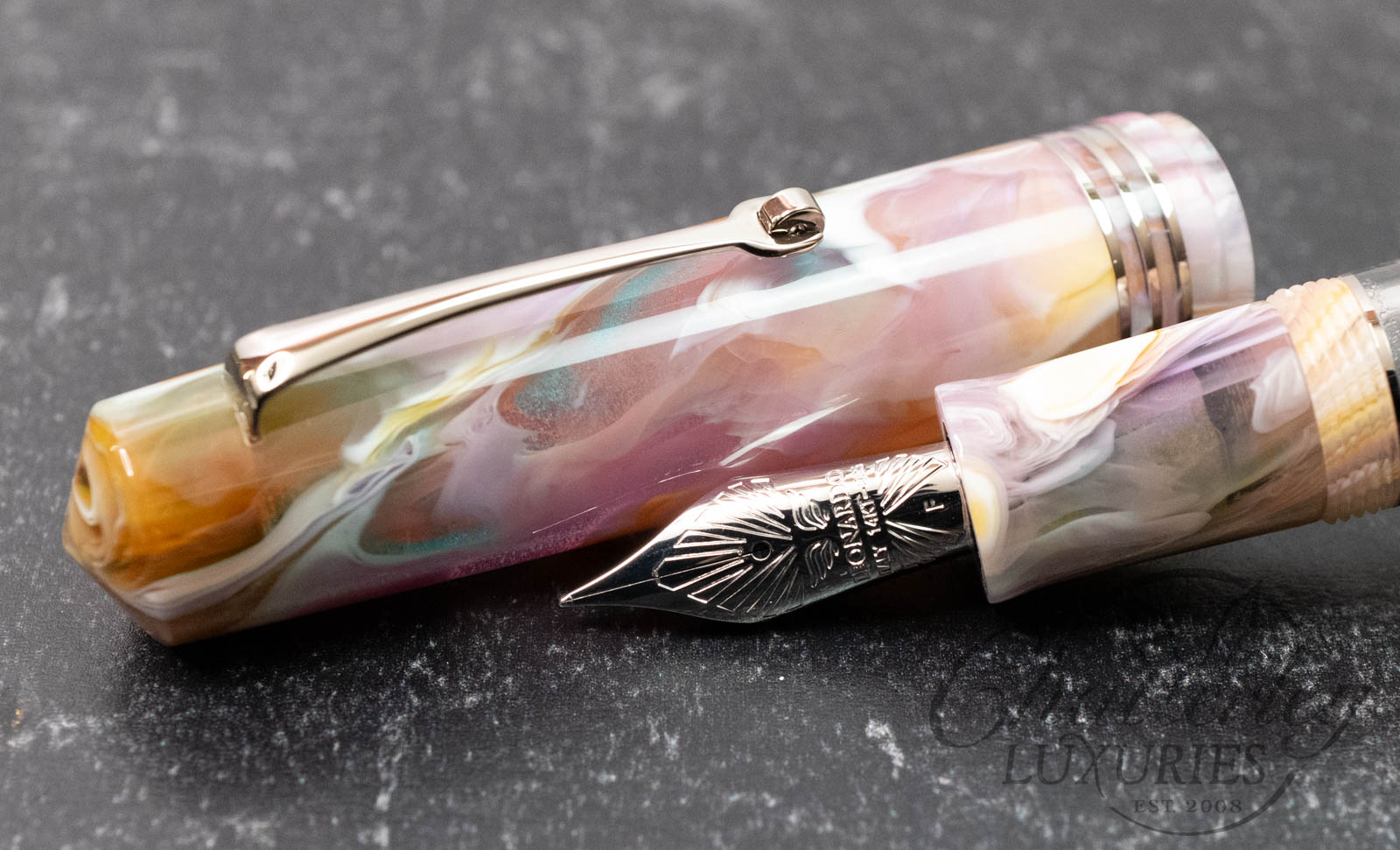 This pen is pre-owned and in near-perfect condition, it does not appear to have been inked. It comes complete with a box and papers and is equipped with a 14k Fine nib. It fills via a Piston Filling System. The pen is made using “Primary Manipulation 1” resin from Jonathan Brooks.