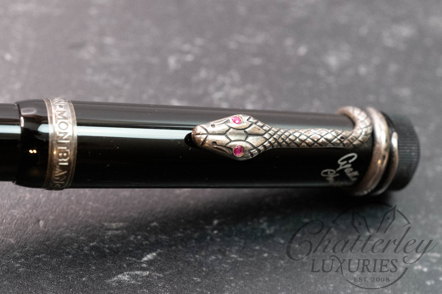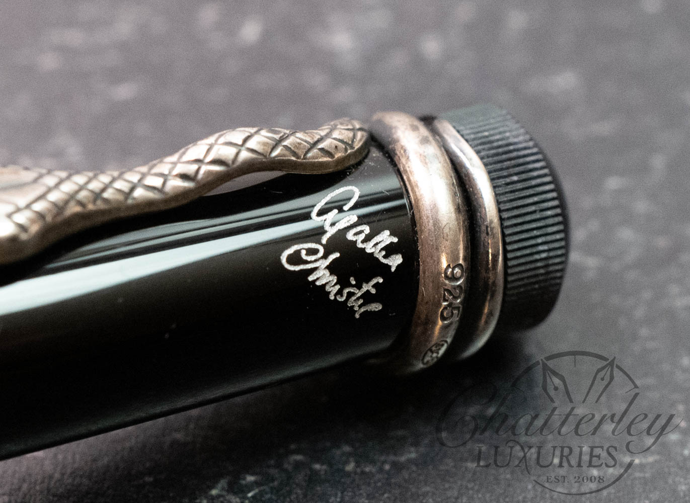 The design of the Writers Edition created in honor of Agatha Christie is based on the classic style of the early 1920’s. Around the cap, made of precious black resin, winds a snake made of 925 Sterling Silver, which hints of a creeping tension of the authors novels and serves as the clip for the pen.