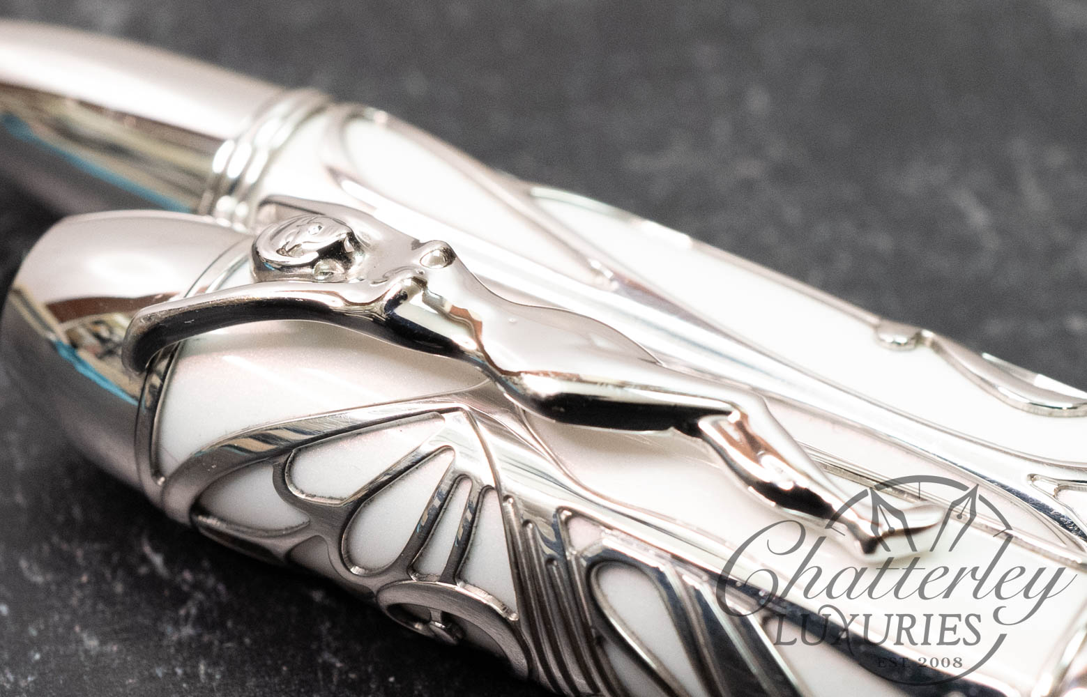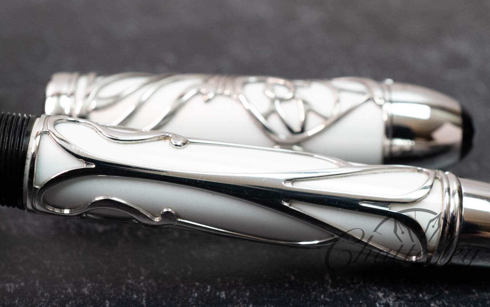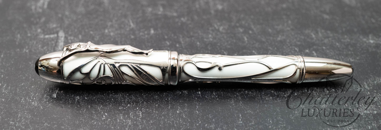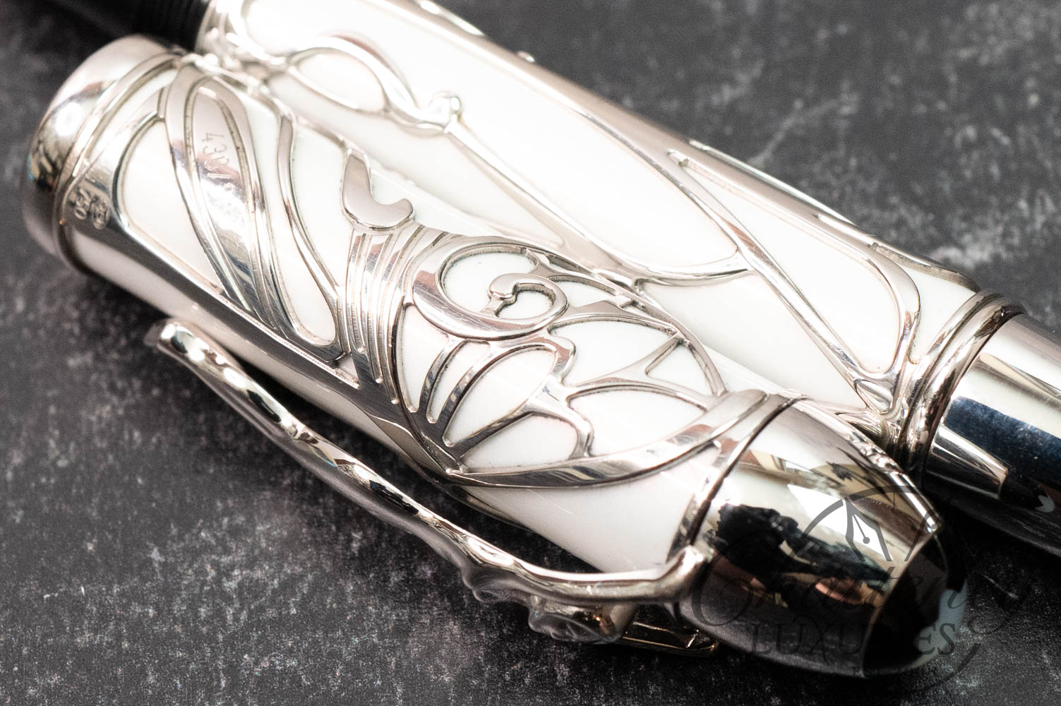 The 888 edition features a body and cap in mother-of-pearl lacquer, adorned with a solid white gold armor. The Montblanc star of this edition is made of fine mother-of-pearl. A lily, a typical motif of Art Nouveau, has been delicately engraved on the 18-carat gold nib plated with rhodium. Limited Edition 888 pieces.