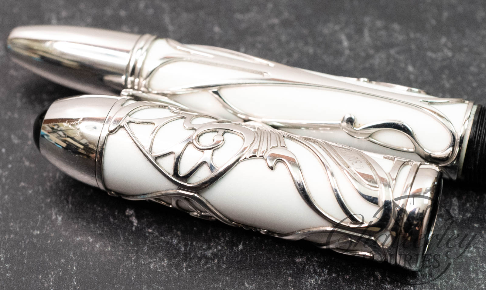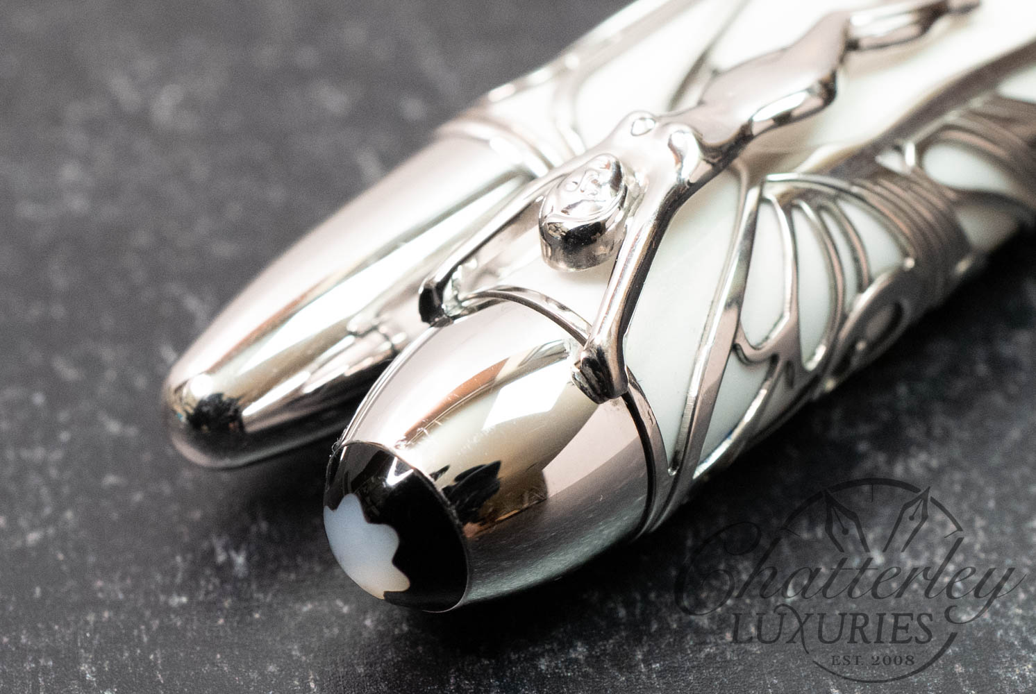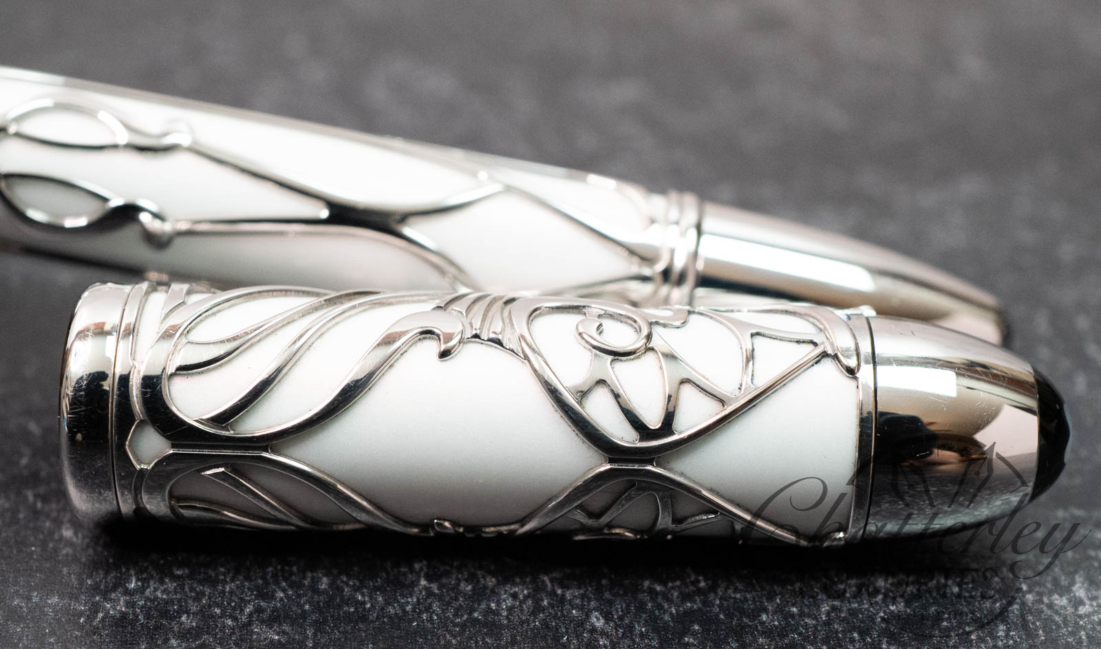 The 888 edition features a body and cap in mother-of-pearl lacquer, adorned with a solid white gold armor. The Montblanc star of this edition is made of fine mother-of-pearl. A lily, a typical motif of Art Nouveau, has been delicately engraved on the 18-carat gold nib plated with rhodium. Limited Edition 888 pieces.