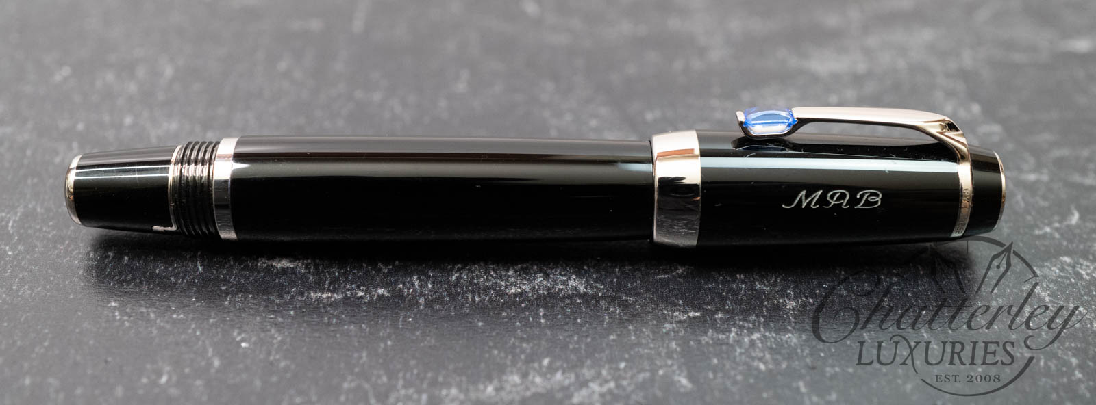 This pen is lovingly used and does not come with a box or papers. It is equipped with a 14k Medium nib and fills via ink cartridge. This pen has the initials “MRB” in the cap.