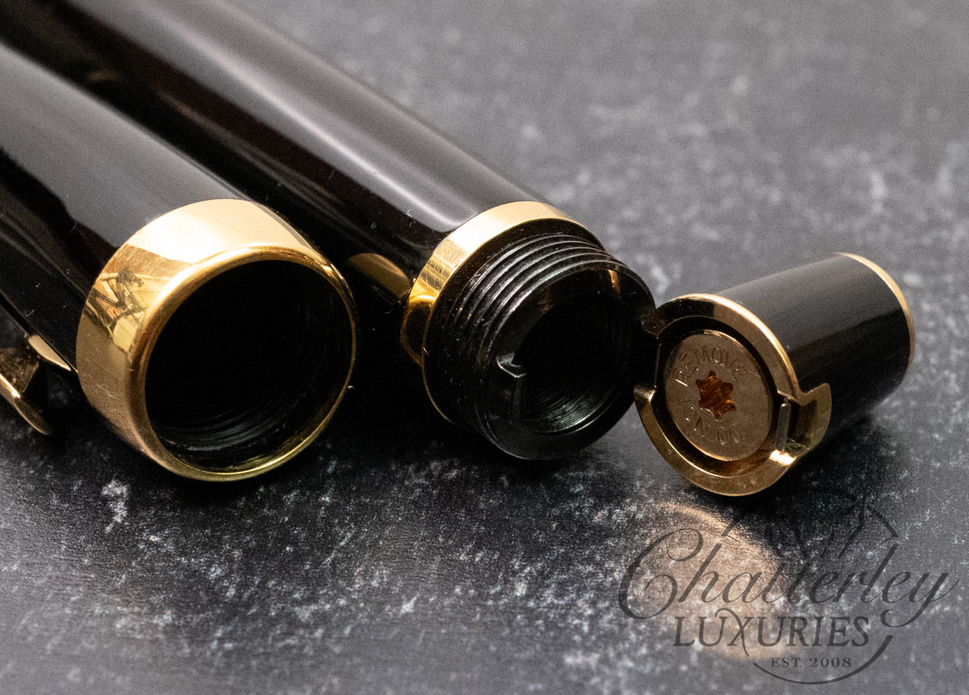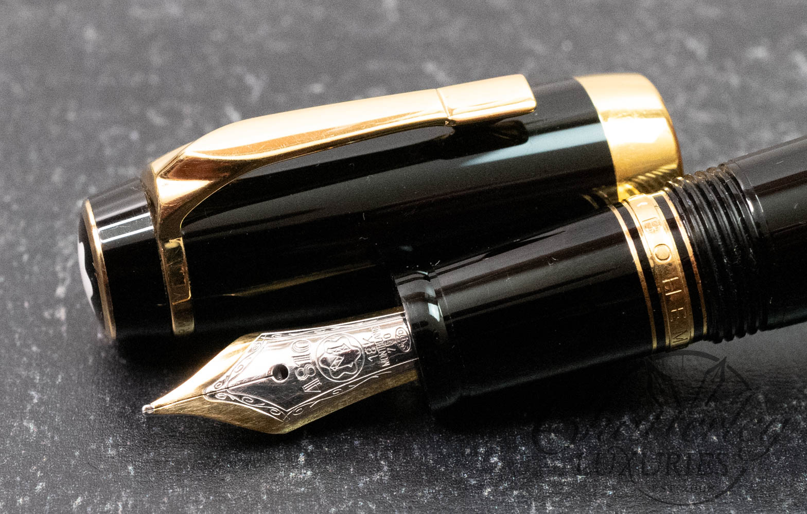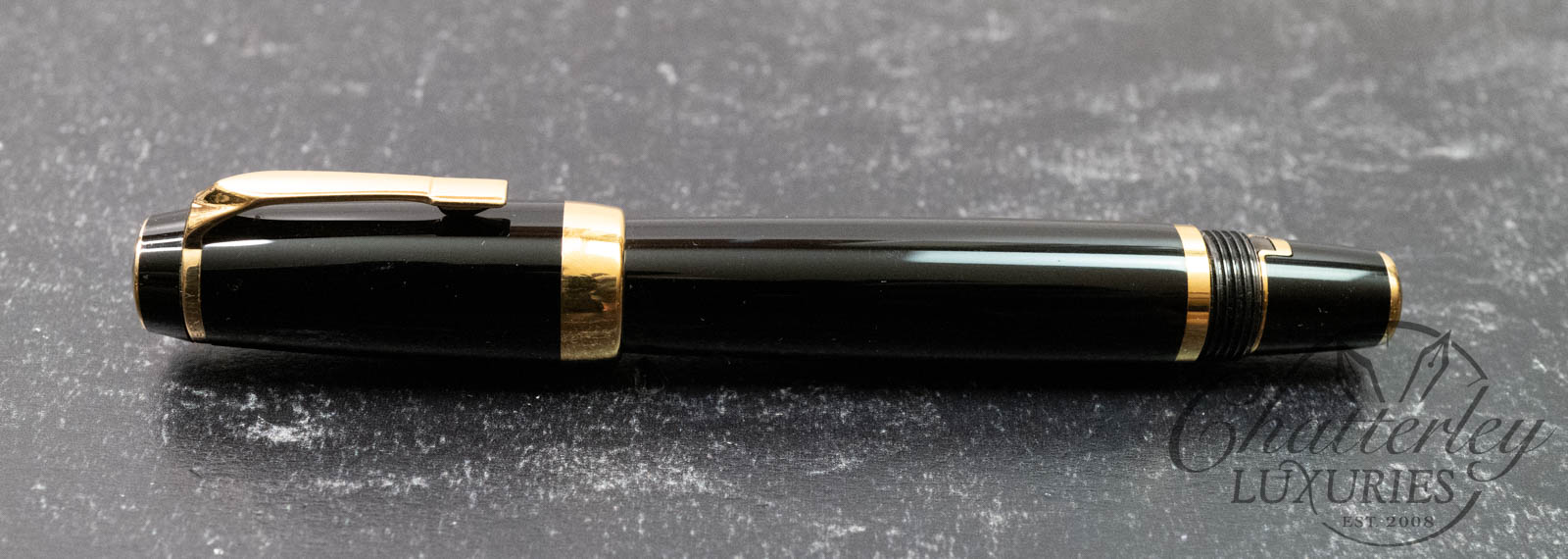This pen is lovingly used and does not come with a box or papers. It is equipped with an 18k Medium nib and fills via ink cartridge. The retractable nib does have some tightness when turning it.