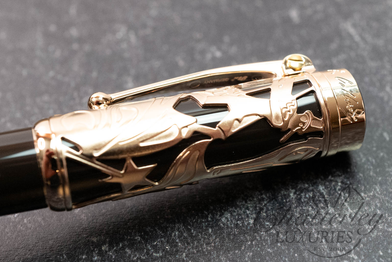 The barrel of each instrument is an impressive representation of Pinocchio’s remarkable nose, made of dark brown precious resin complemented by a champagne-colored gold-plated cone. The extraordinary features are further developed by symbolizing the joints of the famous wooden puppet with a set of screws that attach the clip to the pen cap.