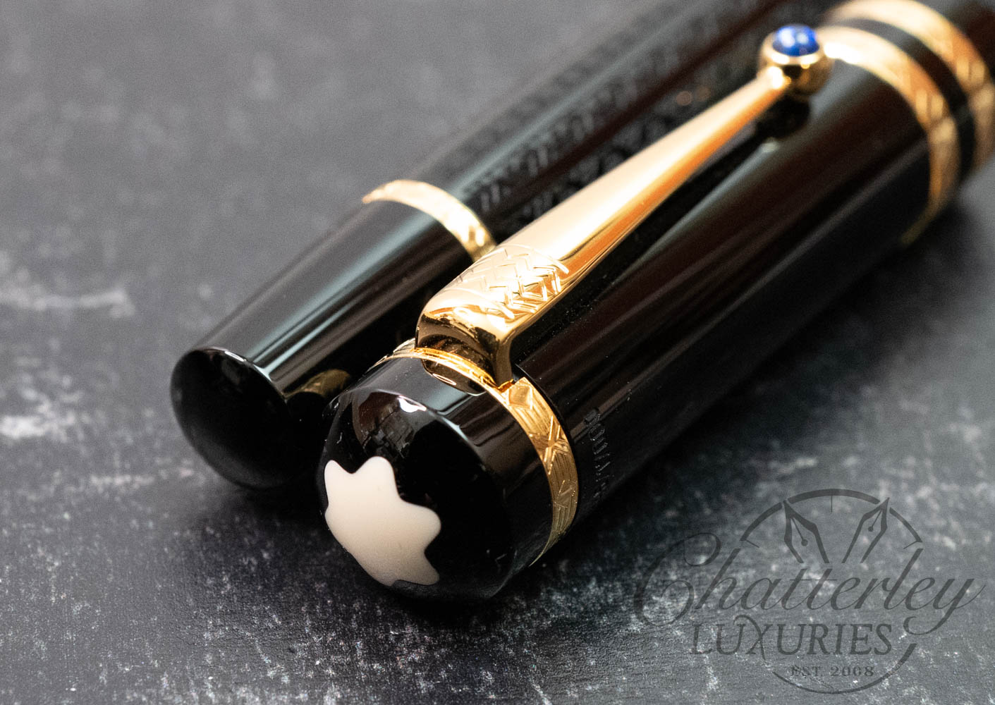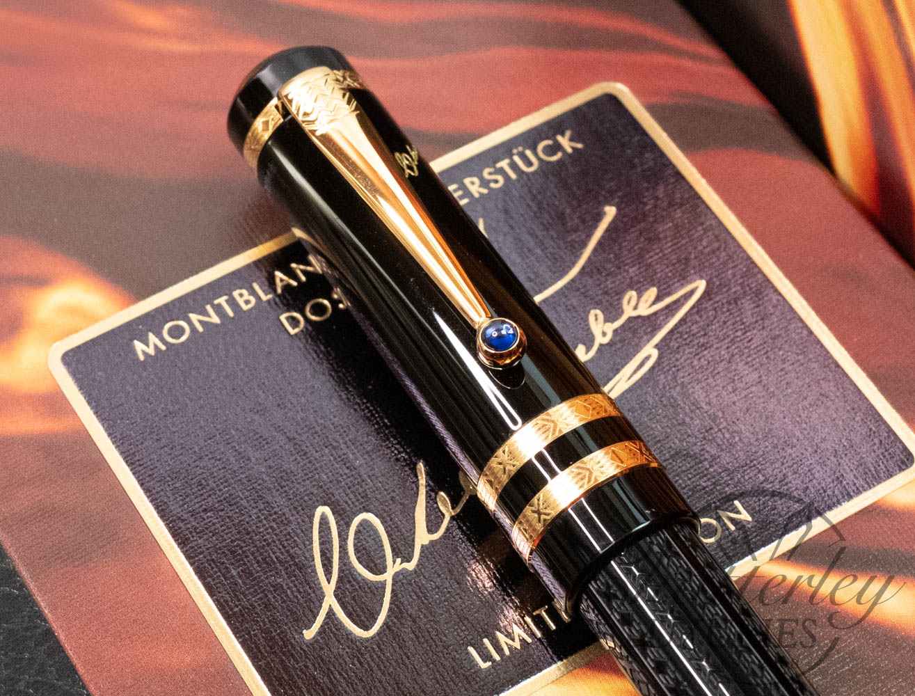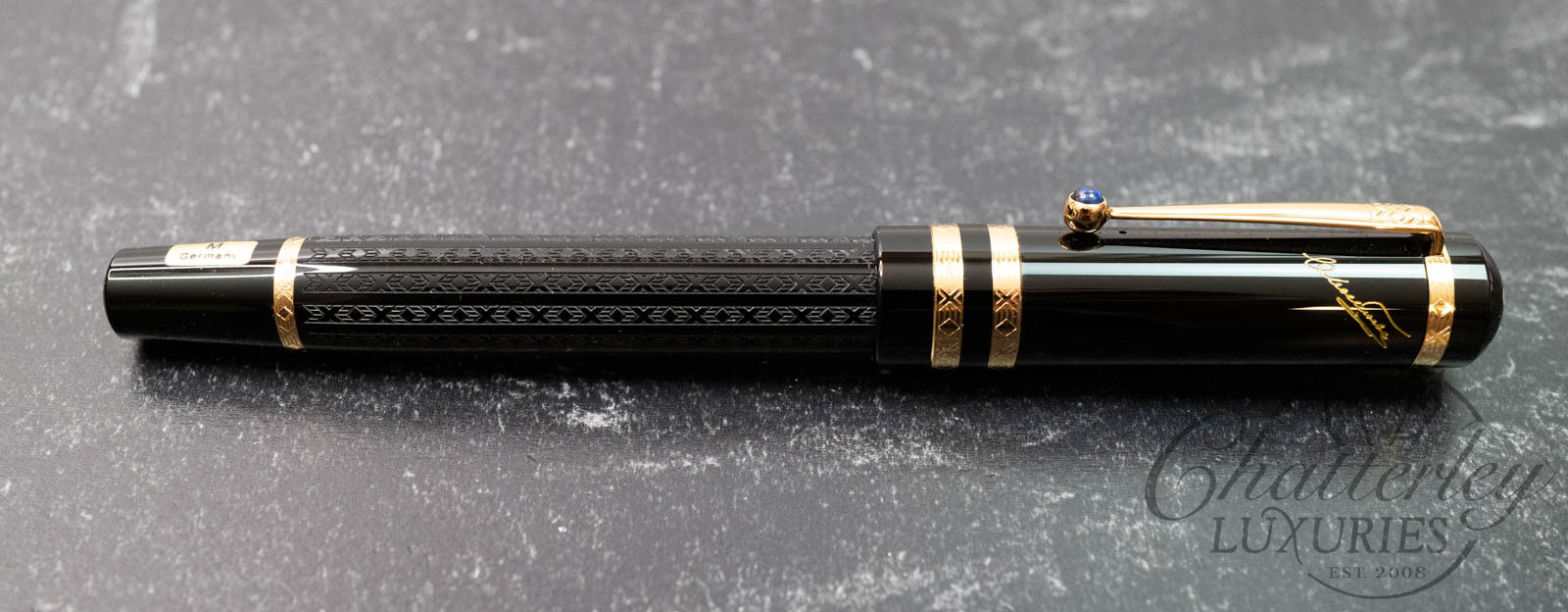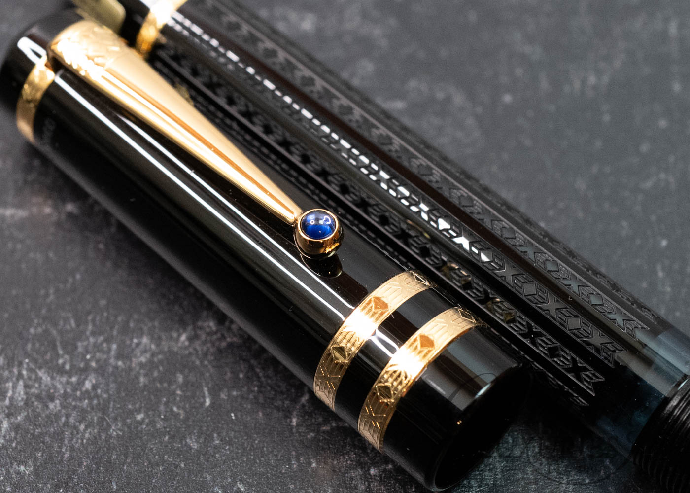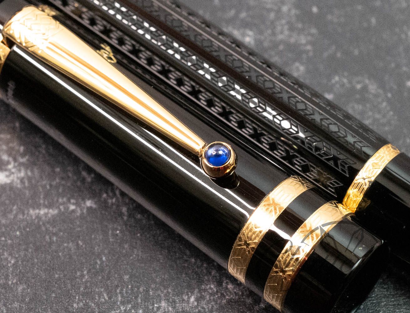 Like the works of this immortal writer, it is on closer examination that the pens of the Writers Edition Dostoevsky reveal their full magic and passion. The delicate ornamentation of the black barrel and the gold-plated rings capture the imagination just as much as the domed sapphire-coloured stone set in the gold-plated clip.