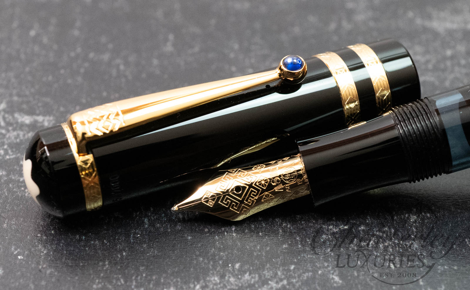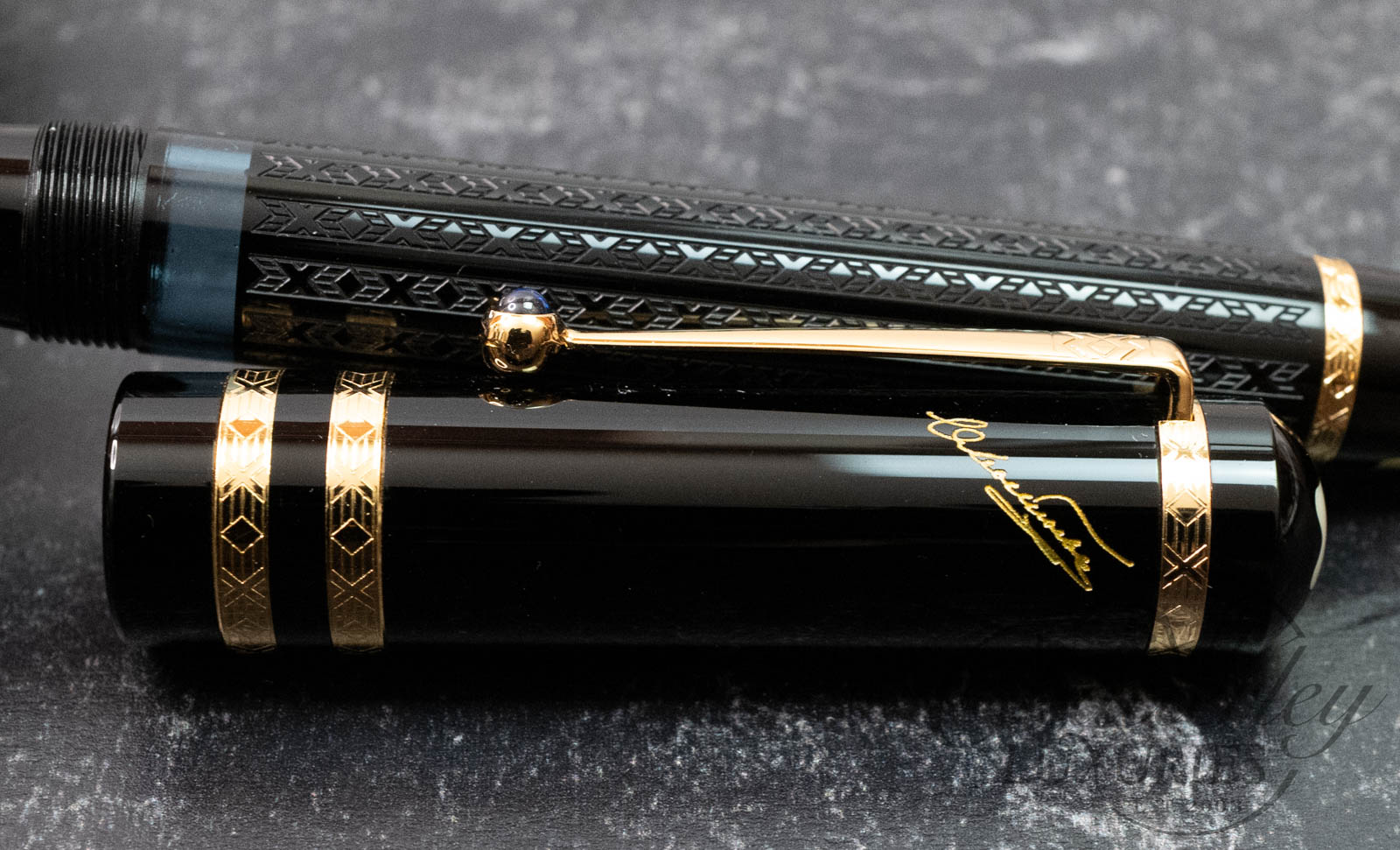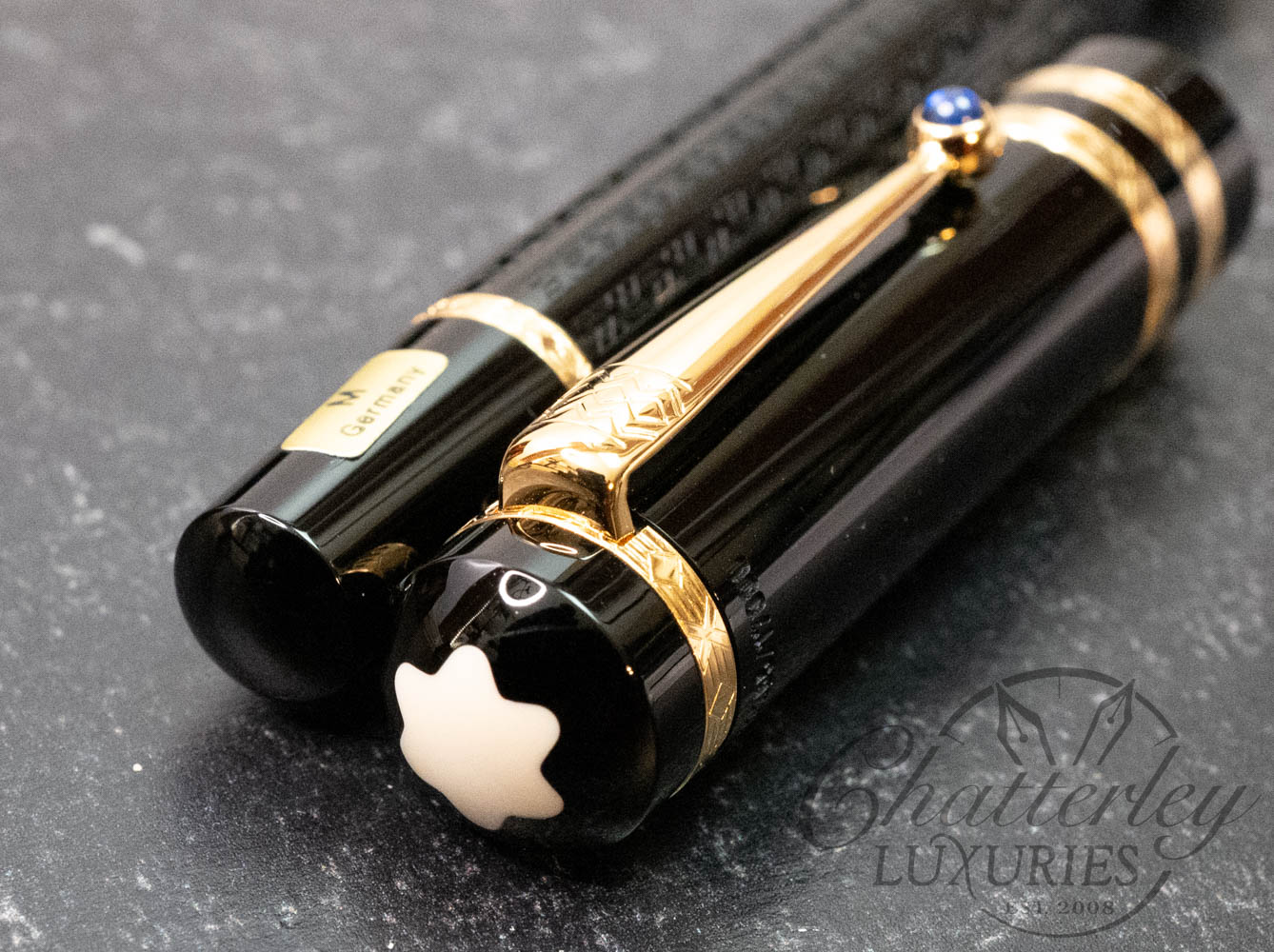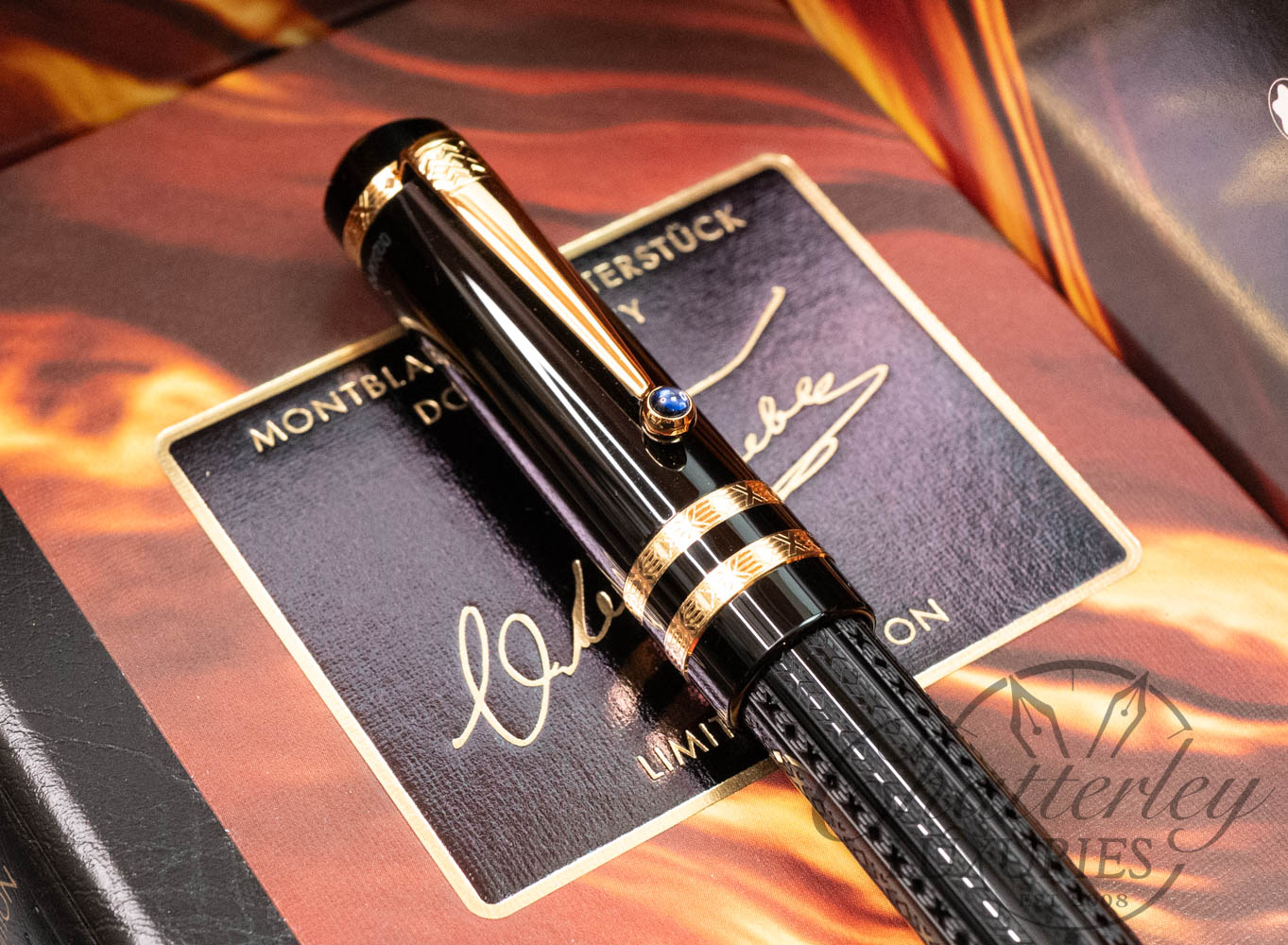 Like the works of this immortal writer, it is on closer examination that the pens of the Writers Edition Dostoevsky reveal their full magic and passion. The delicate ornamentation of the black barrel and the gold-plated rings capture the imagination just as much as the domed sapphire-coloured stone set in the gold-plated clip.
